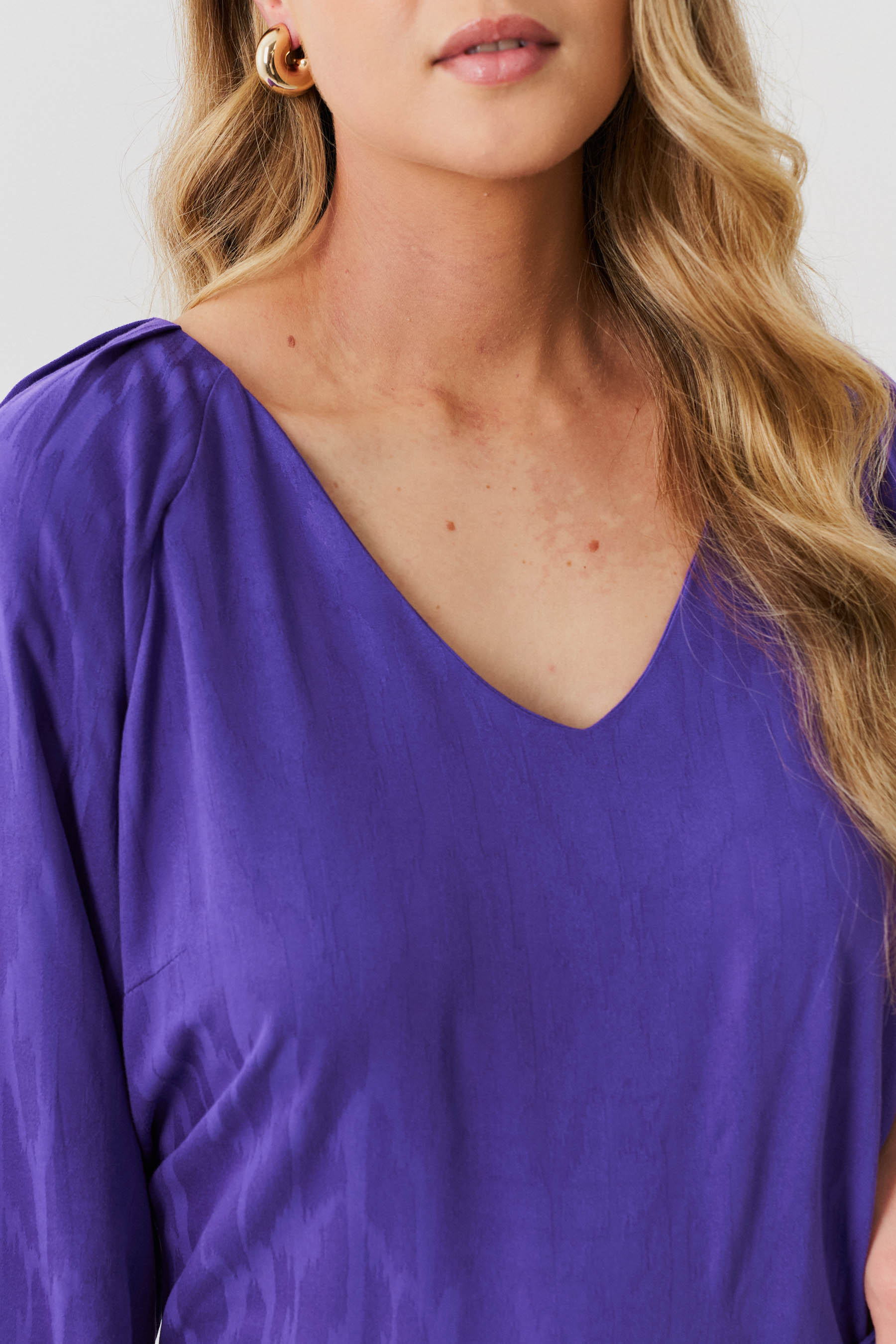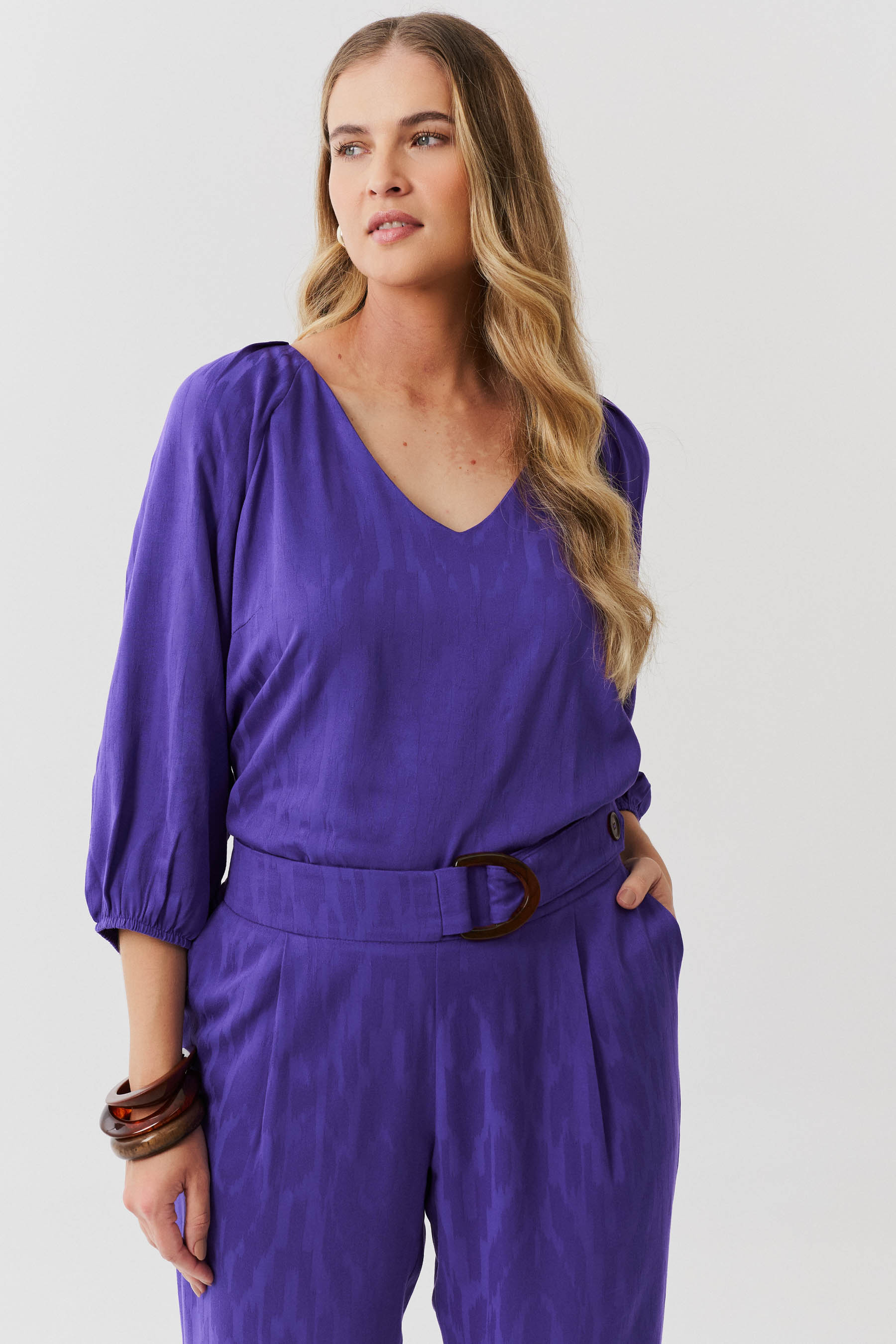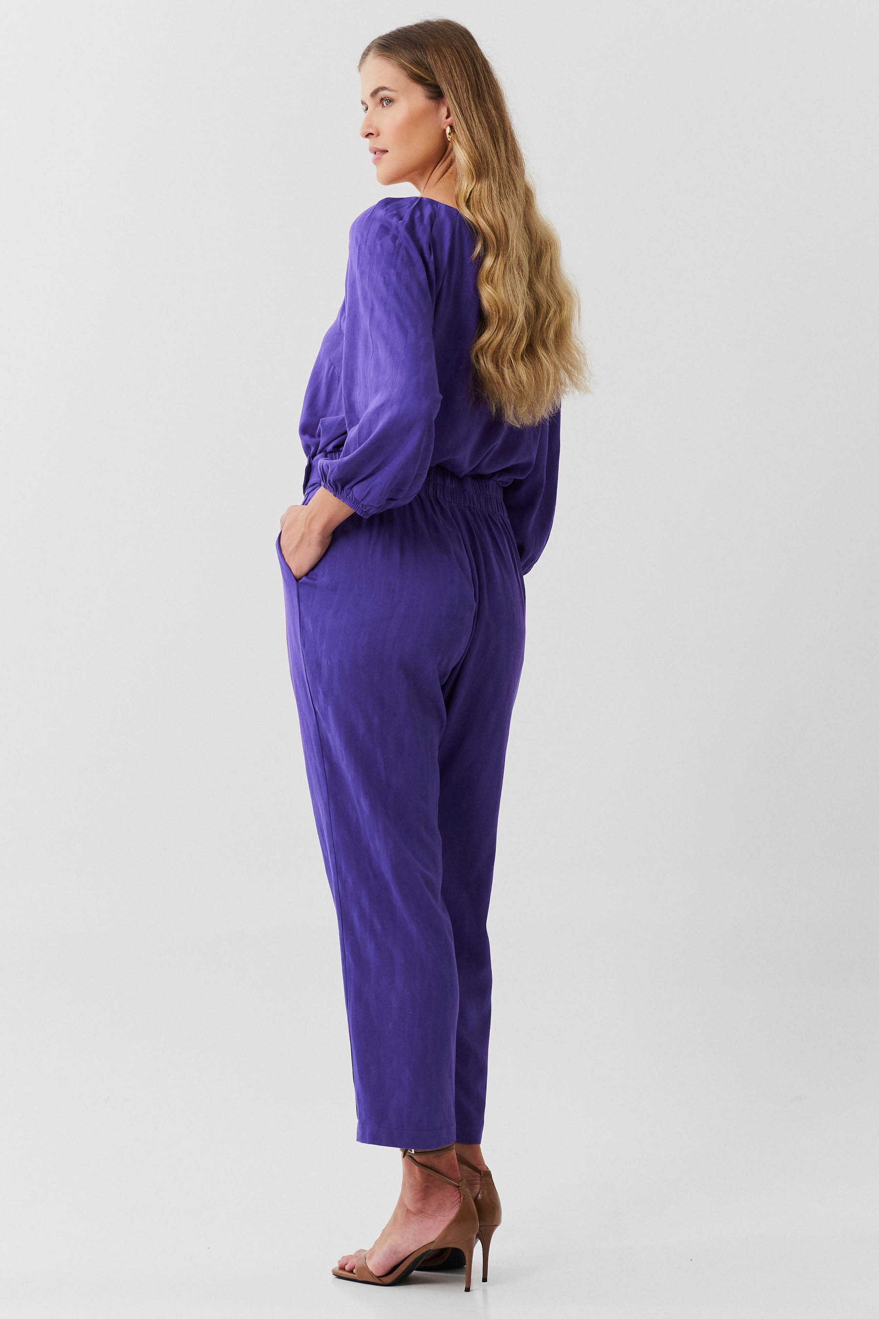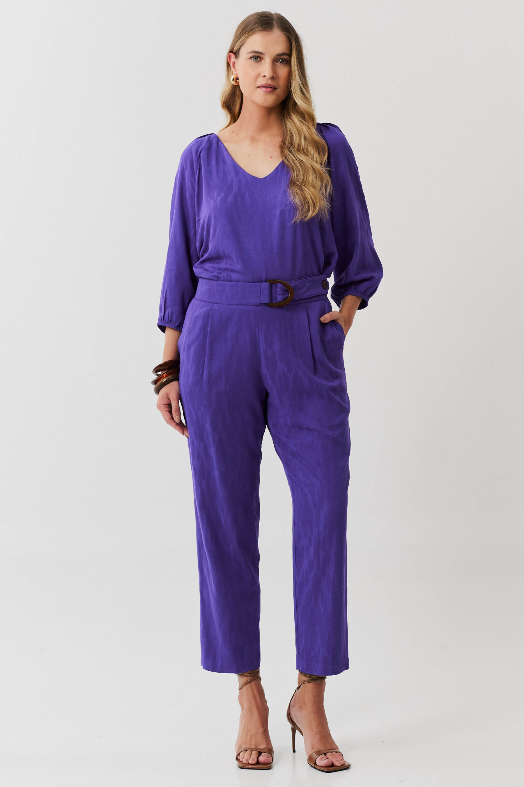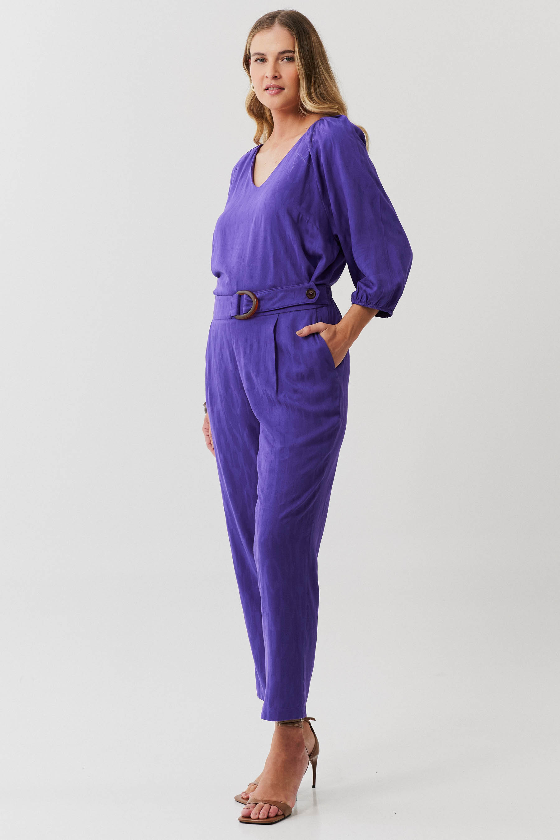 Conjunto de blusa e calça confeccionado em tecido de crepe maquinetado. A blusa possui decote V, pregas nos ombros e manga 3/4 com elástico na barra. Calça traz nossa modelagem clássica reta com pregas frontais, bolsos laterais e cós com elástico nas costas para maior conforto. Detalhe de martingale, fivela e botão no cós frontal.