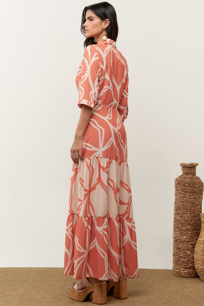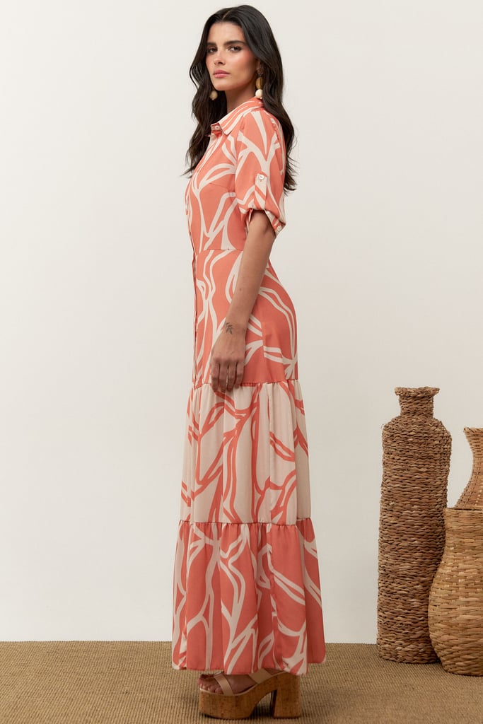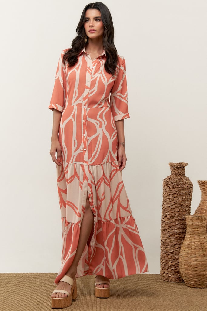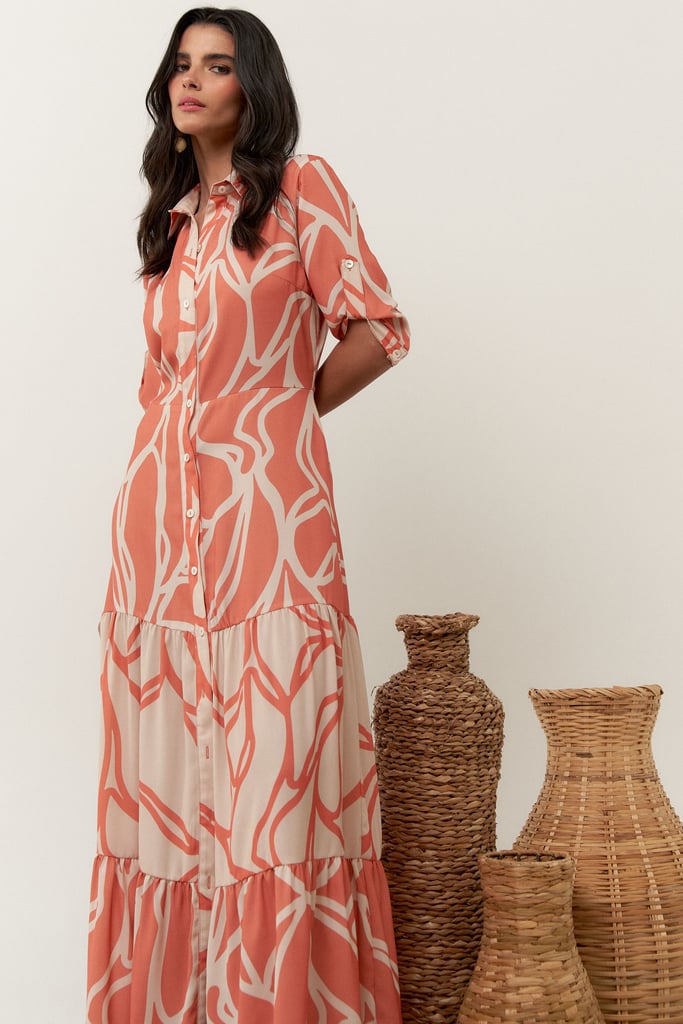 A chemise longa, confeccionada em crepe, possui mix de estampa exclusiva em suas camadas, com gola de camisa e manga 3/4 com martingale. Fechamento frontal por botões. Acompanha faixa do mesmo tecido para amarração.