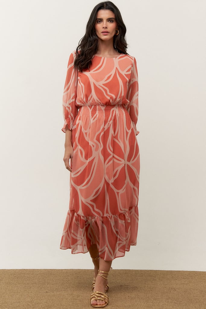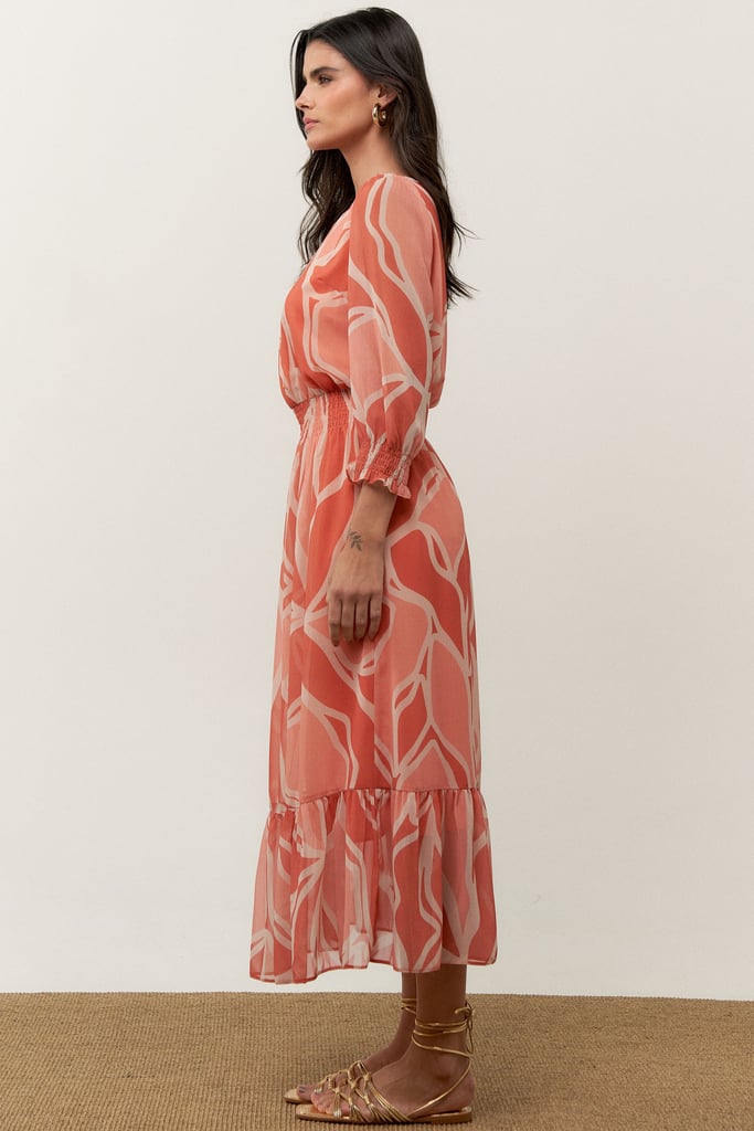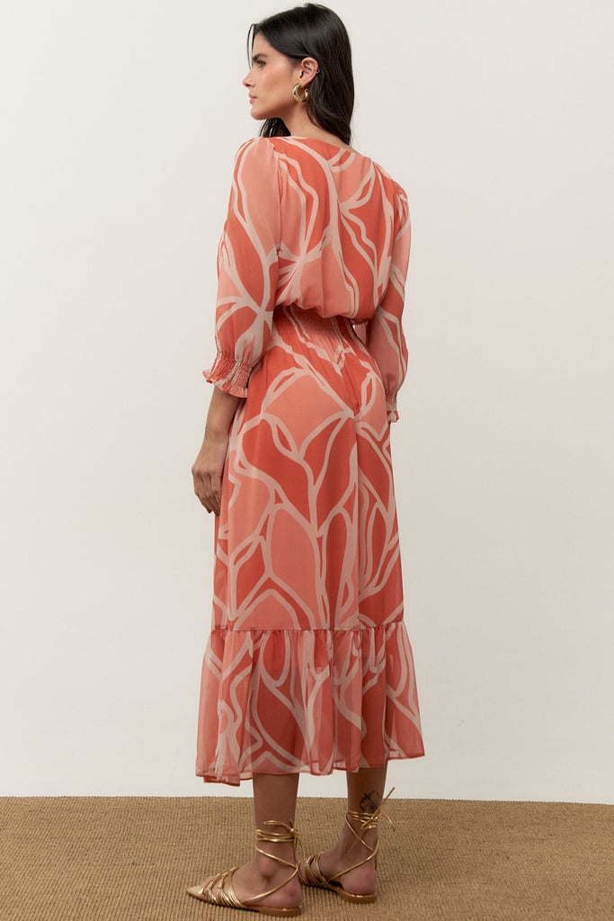 O vestido confeccionado no chiffon estampado possui padronagem exclusiva, decote redondo, manga 3/4 e lastex na cintura e mangas. Possui forro.