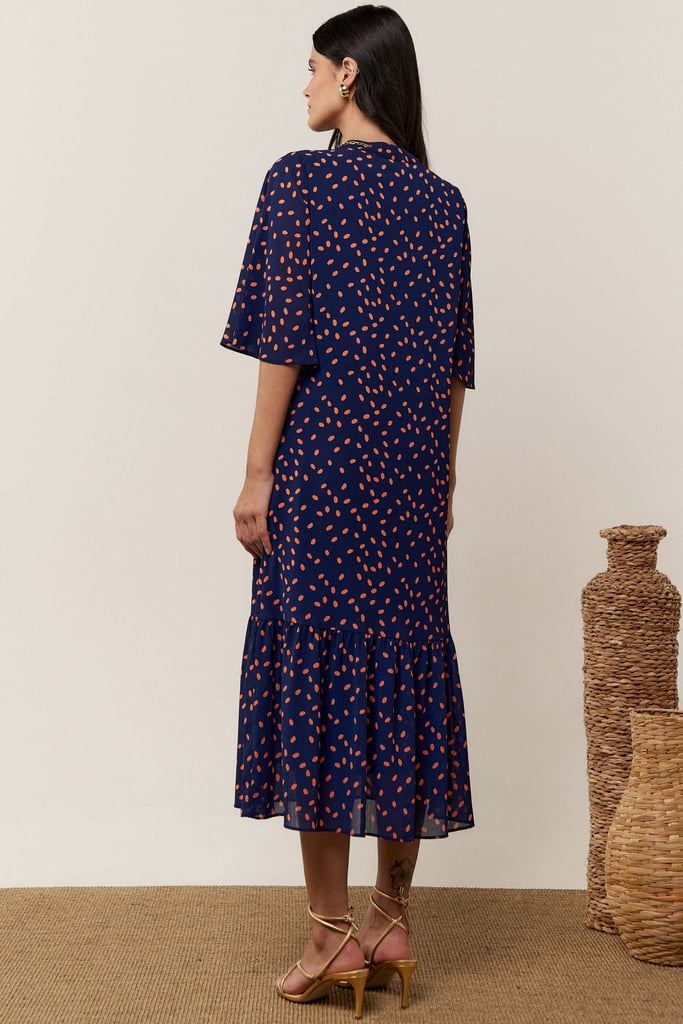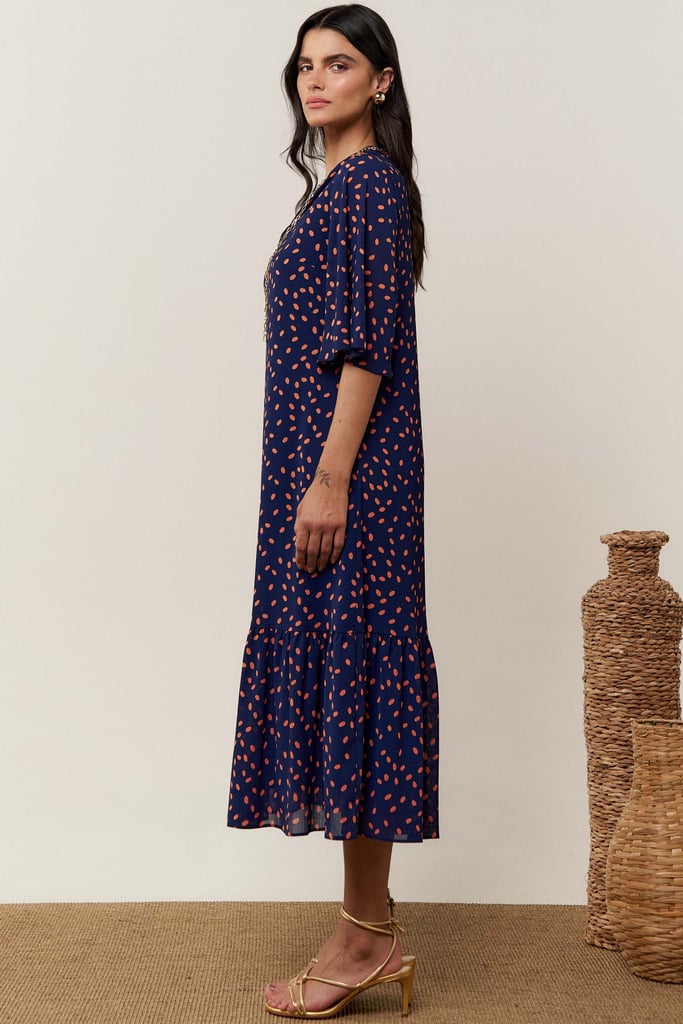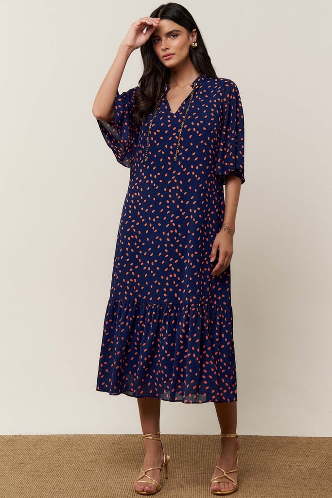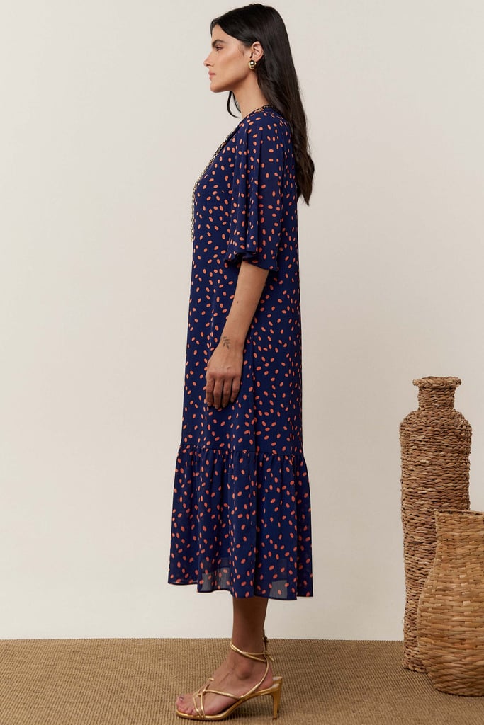 O vestido é confeccionado em tecido de chiffon texturizado e estampado. Possui gola padre, manga sino e babado na saia. Detalhe de correntes transpassadas no decote. Peça forrada.