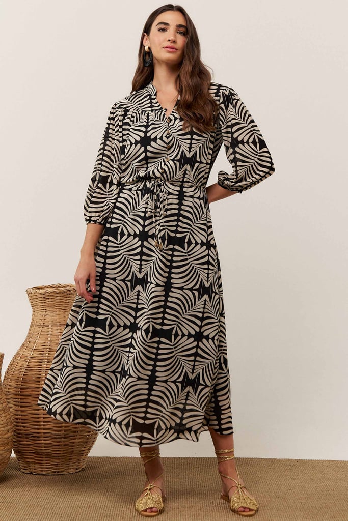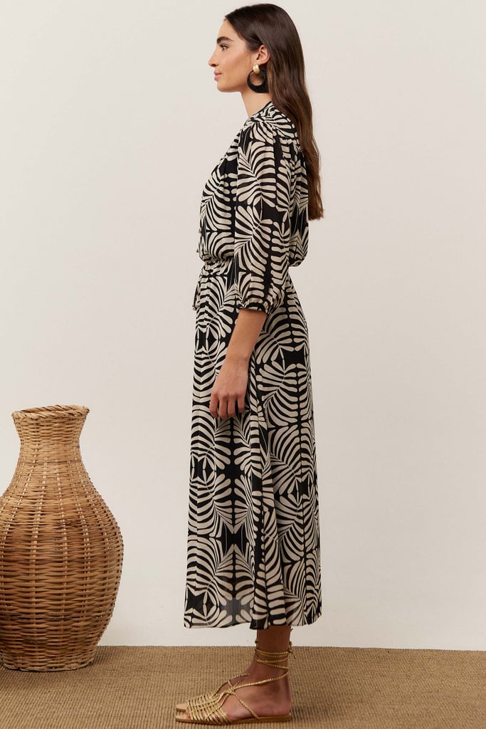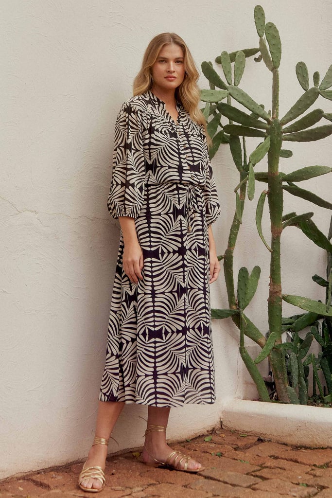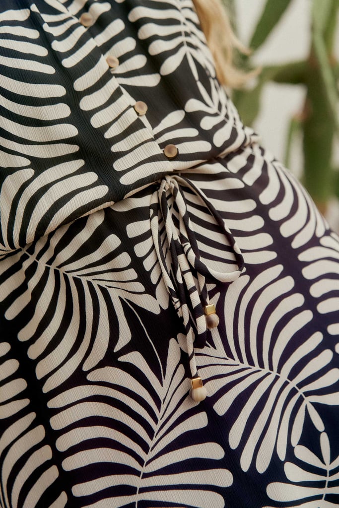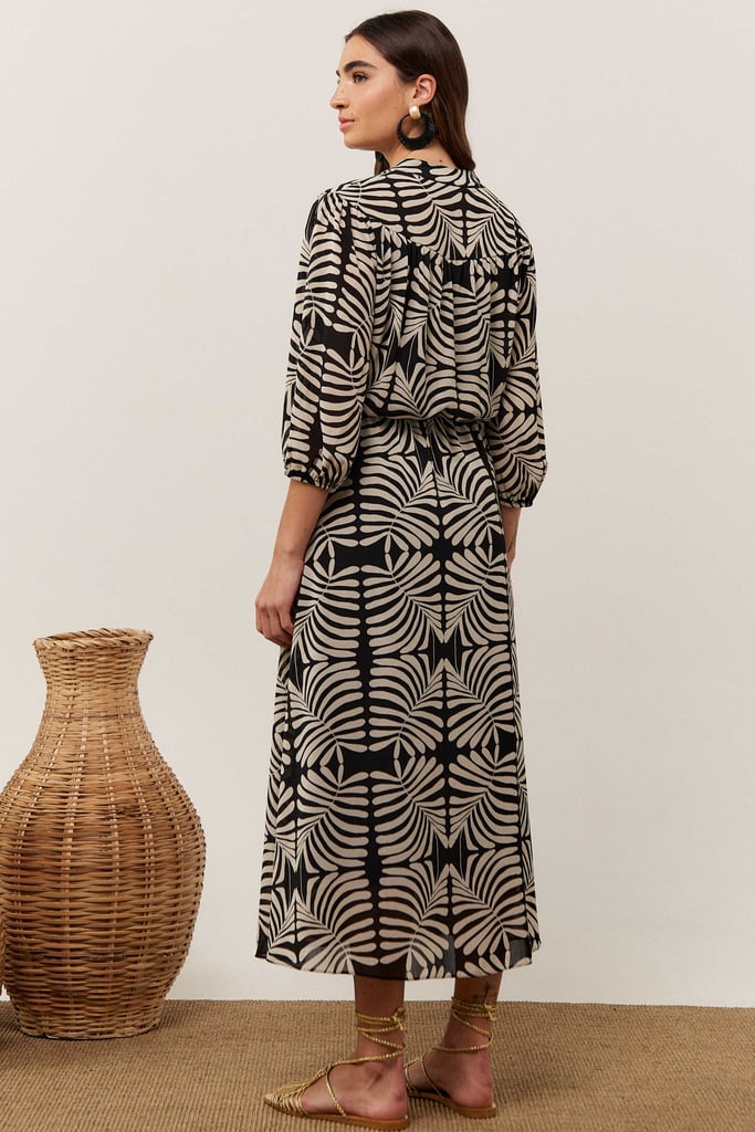 O vestido, confeccionado em chiffon estampado, possui gola padre, botões frontais, pala arredondada, manga 3/4 com terminação de elástico, elástico interno na cintura para efeito blusê e detalhe de amarração. Comprimento midi. Peça forrada.