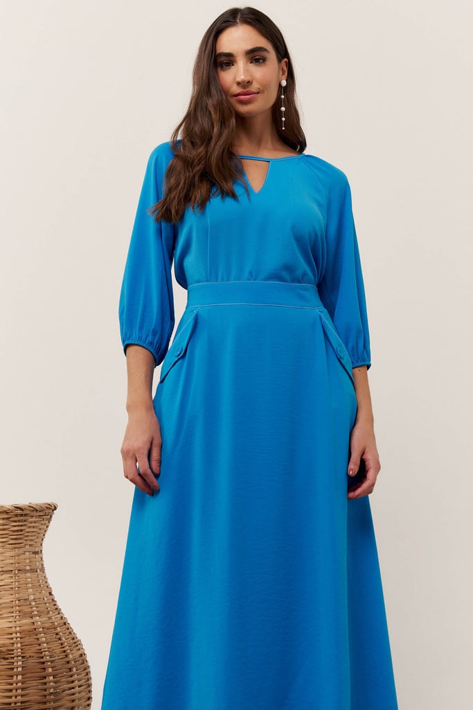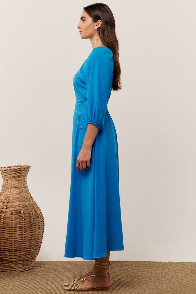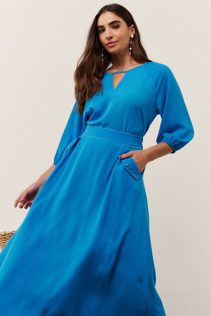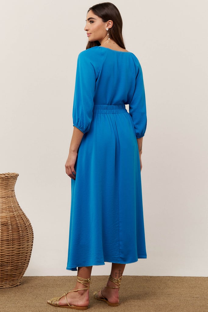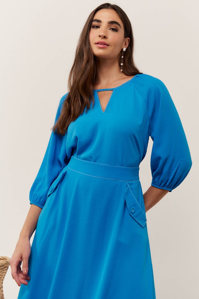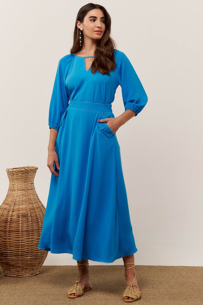 O conjunto de blusa e saia são confeccionados em crepe. A blusa possui decote arredondado, abertura frontal e manga 3/4 com elástico na terminação. A saia possui bolso faca, lapela com detalhe de botão e cós com elástico nas costas para maior conforto. Saia forrada.