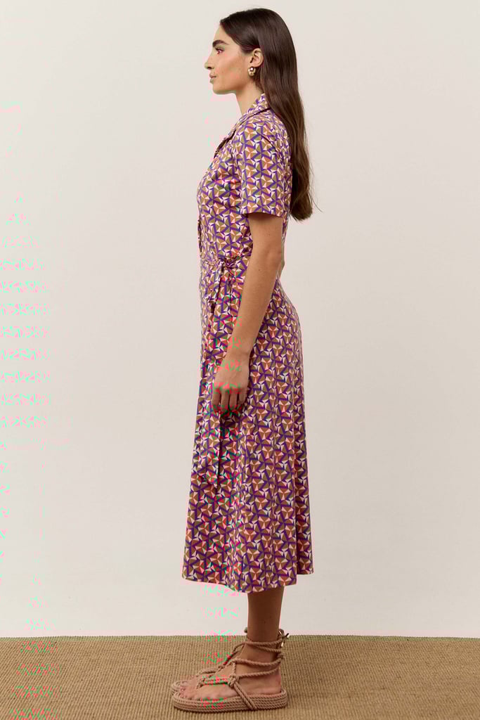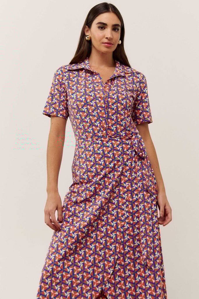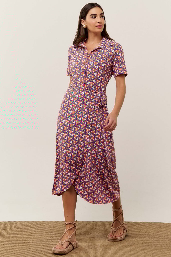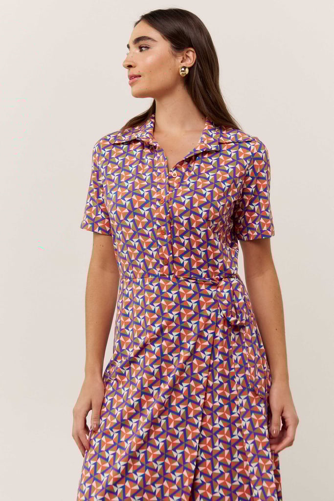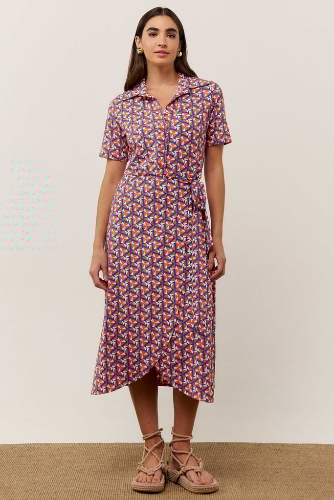 Confeccionado em tecido de malha Fluity, o vestido de gola é superconfortável, tem o toque geladinho e não amassa. Possui gola de camisa, vista, botões e manga curta. Saia transpassada com amarração na lateral. A estampa geométrica é mais uma exclusividade Simple Life.