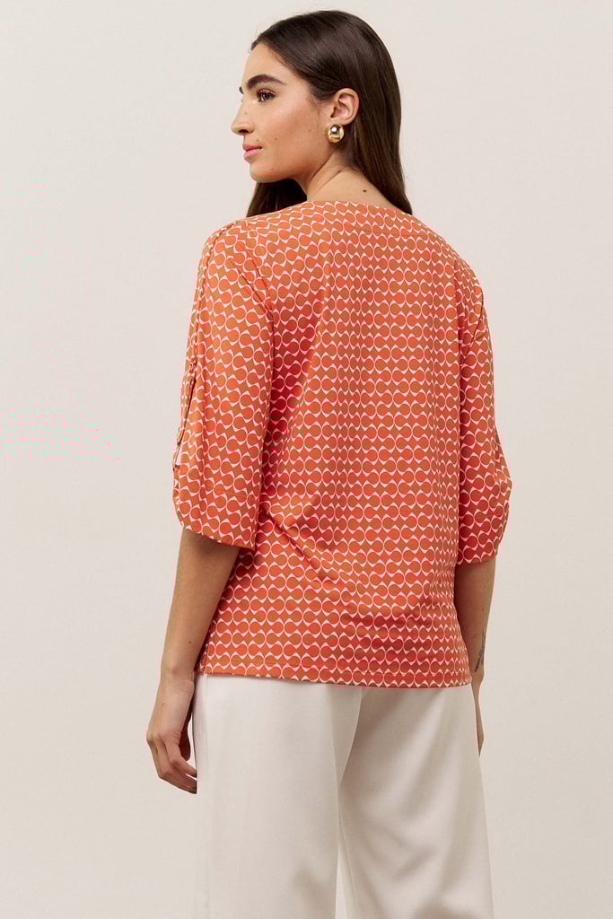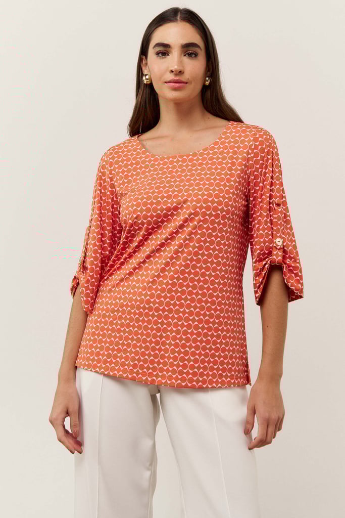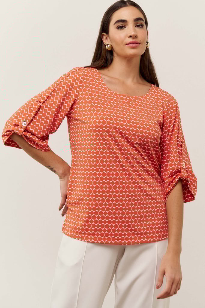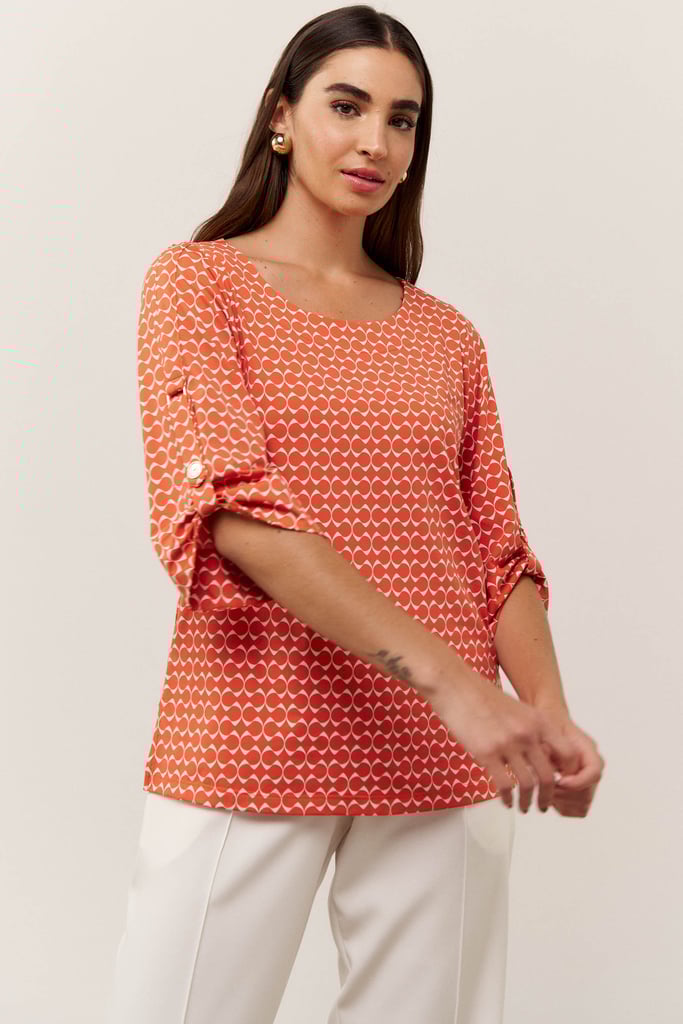 A blusa, confeccionada em tecido de fluity com estampa exclusiva, possui decote careca, manga 3/4 com detalhe de martingale e botão decorativo.