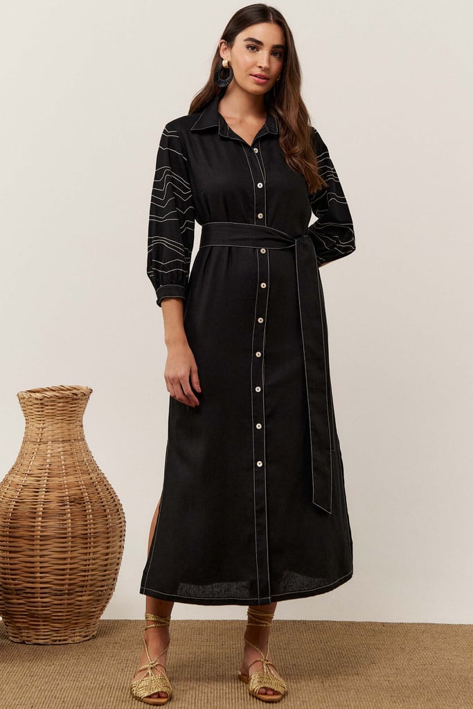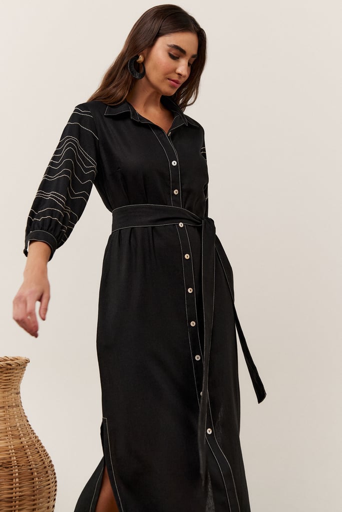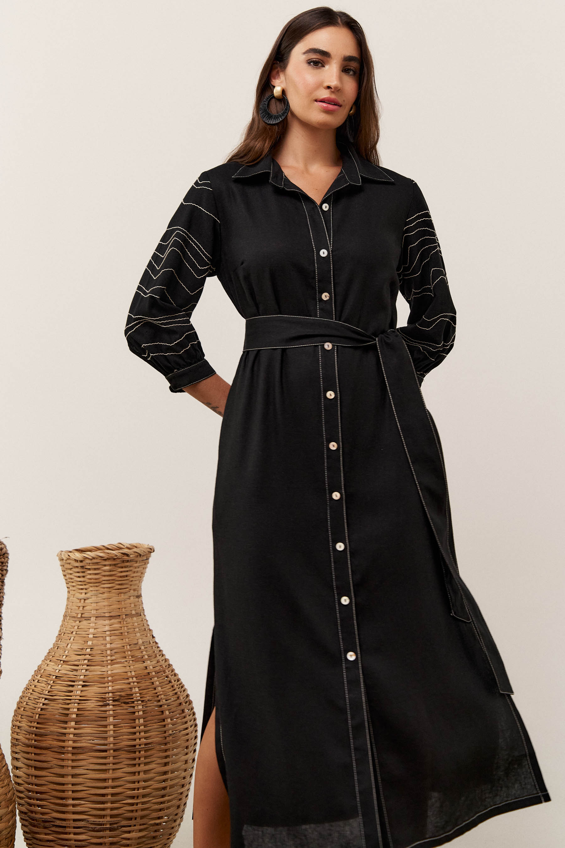 A chemise pespontada, confeccionada em linho, possui gola de camisa, vista frontal com botões, fenda lateral , manga 3/4 bordada com terminação de elástico e punho. Acompanha faixa do mesmo tecido para amarração.