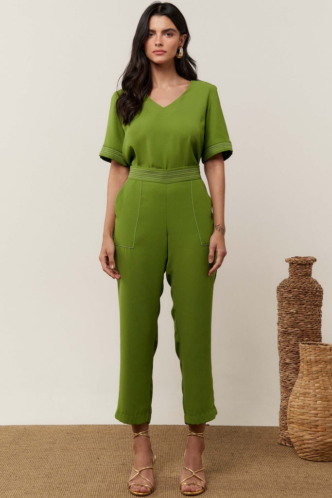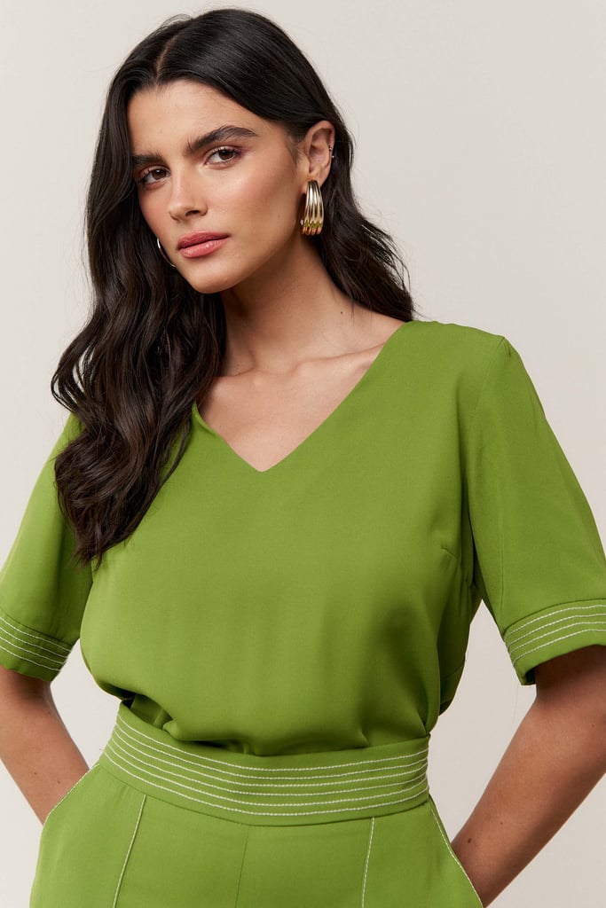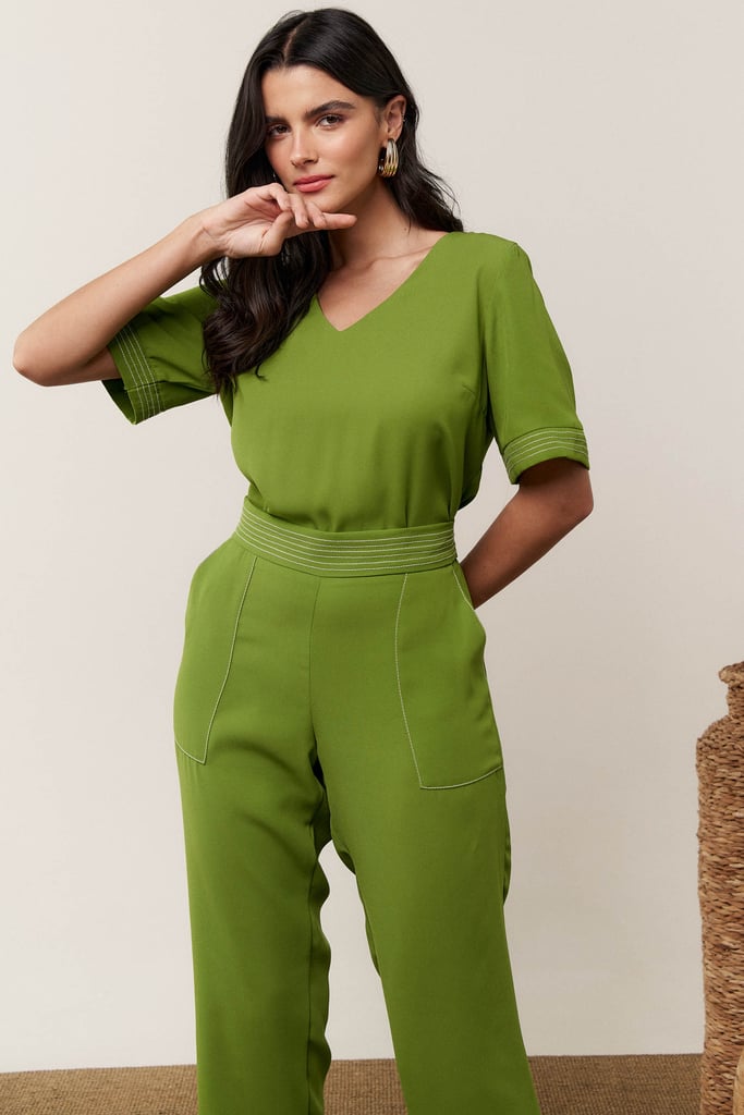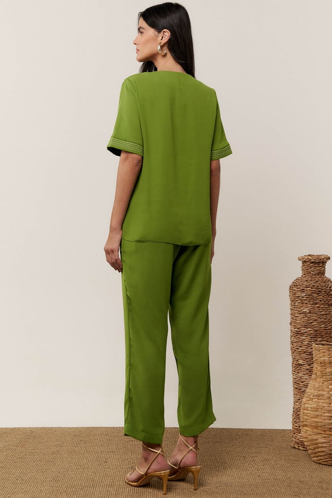 O conjunto pespontado é confeccionado em tecido de crepe liso. A blusa possui decote V e manga curta. A calça traz nossa modelagem clássica reta, bolsos sobrepostos e cós com elástico embutido nas costas para maior conforto.