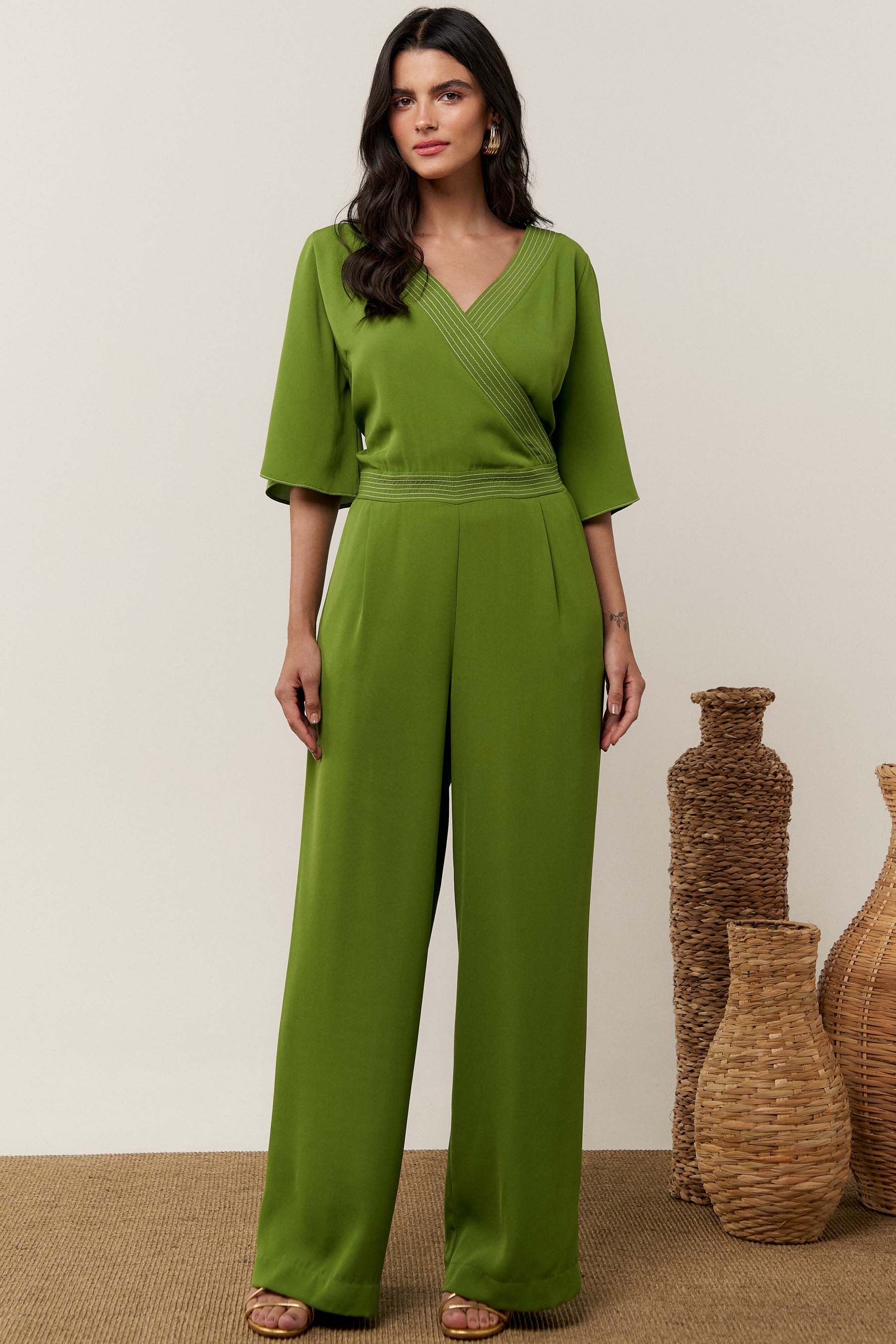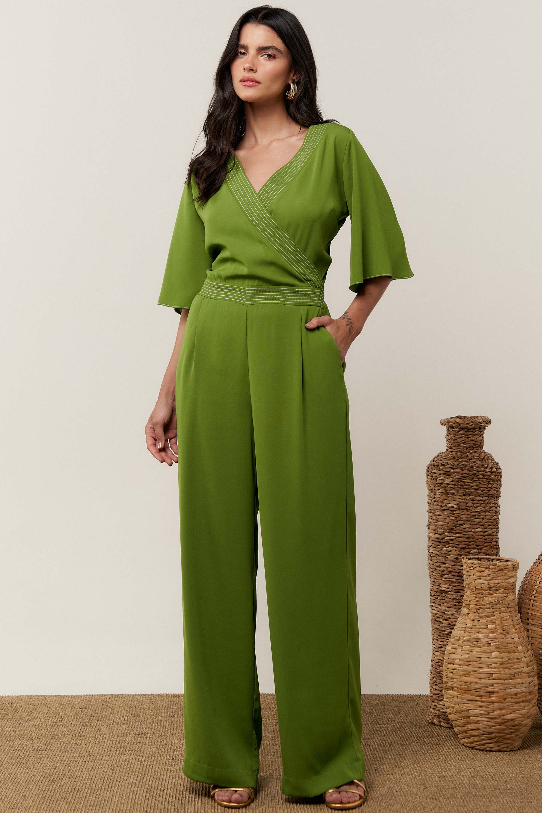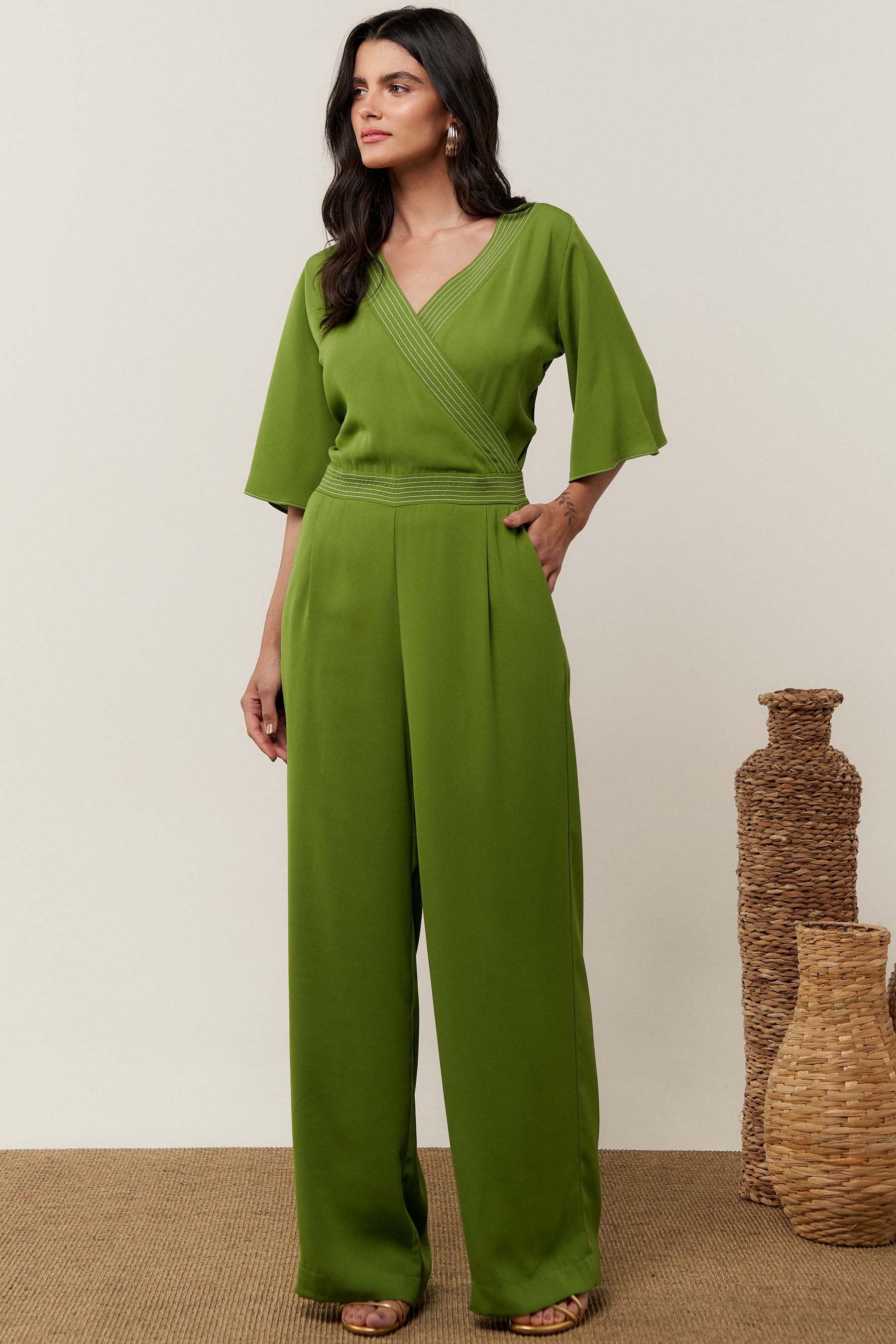 O macacão pespontado é confeccionado em tecido de crepe liso. Possui decote transpassado, manga 3/4 tipo sino, recorte na cintura e bolsos laterais. Fechamento por zíper nas costas.