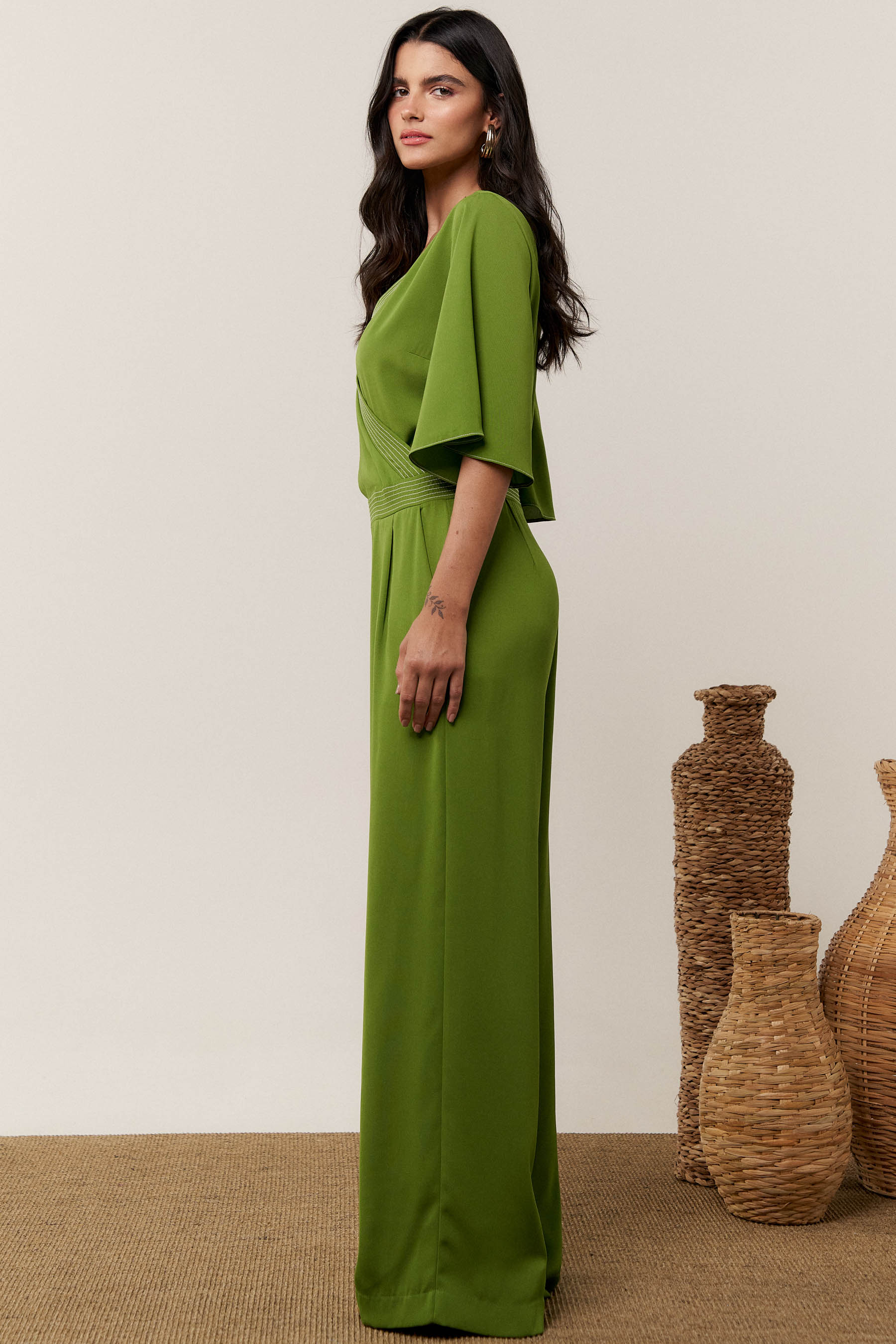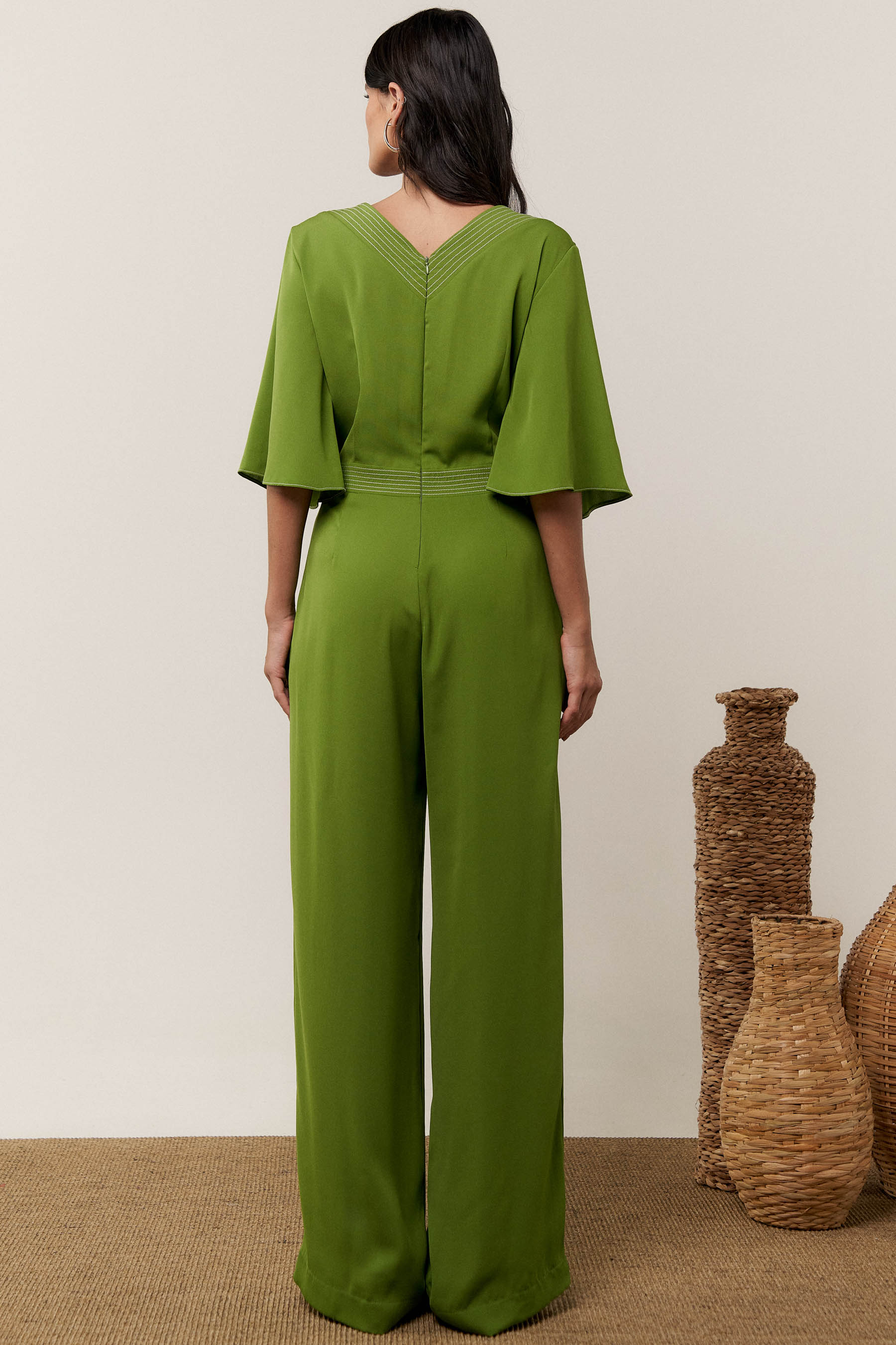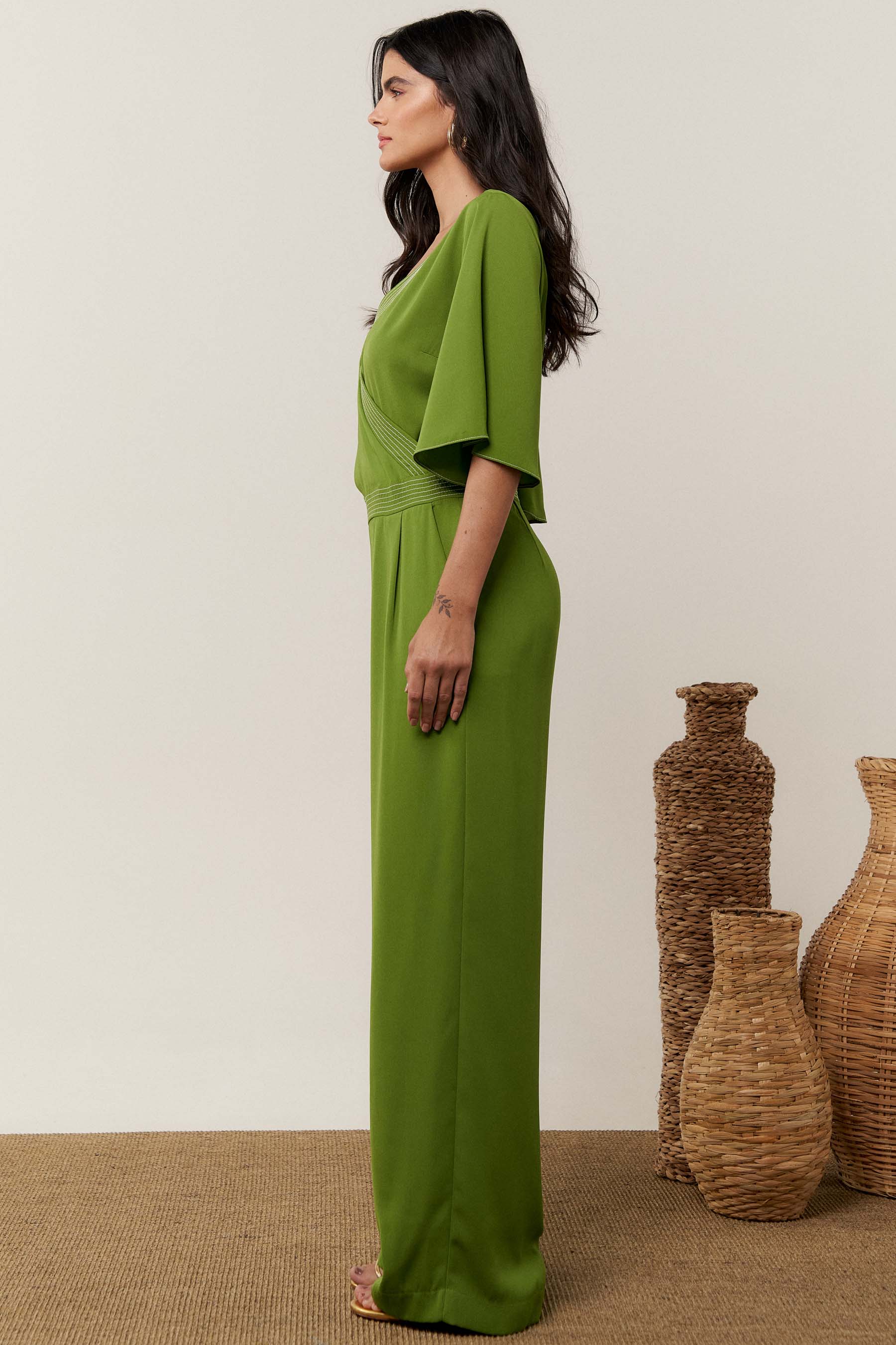 O macacão pespontado é confeccionado em tecido de crepe liso. Possui decote transpassado, manga 3/4 tipo sino, recorte na cintura e bolsos laterais. Fechamento por zíper nas costas.