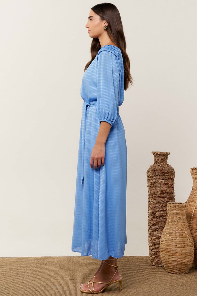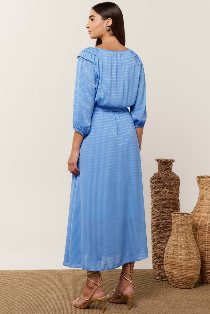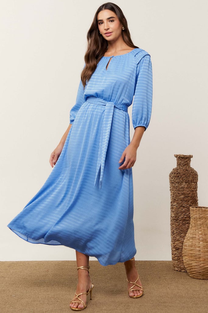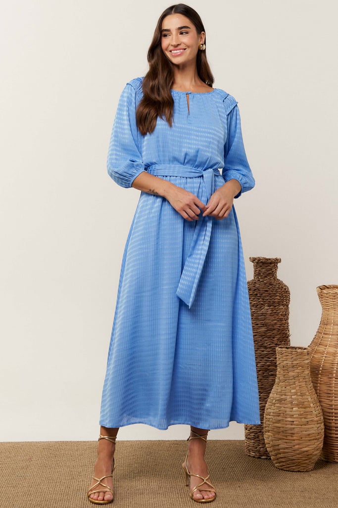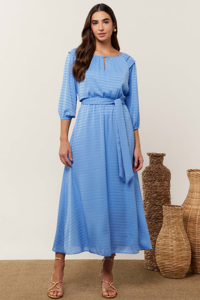 Vestido confeccionado em tecido de crepe de jacquard listrado. Possui decote redondo com detalhe vazado fechado por botão. Manga raglan 3/4 com terminação de elástico e detalhe franzido no ombro. Elástico embutido na cintura para maior conforto e efeito blusê. Comprimento midi. Peça forrada. Acompanha faixa do mesmo tecido para amarração.