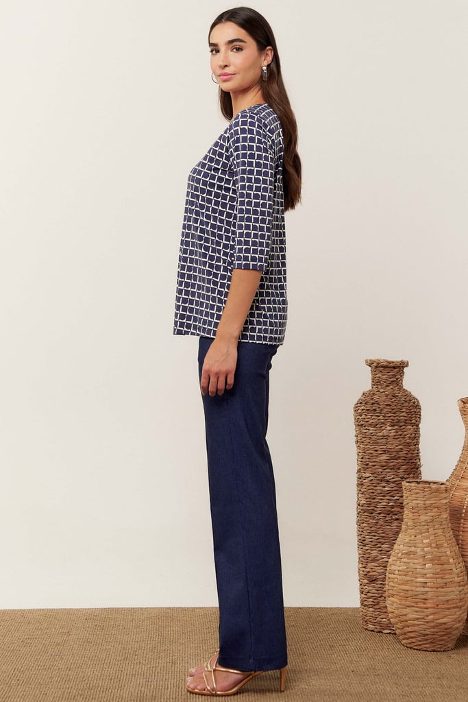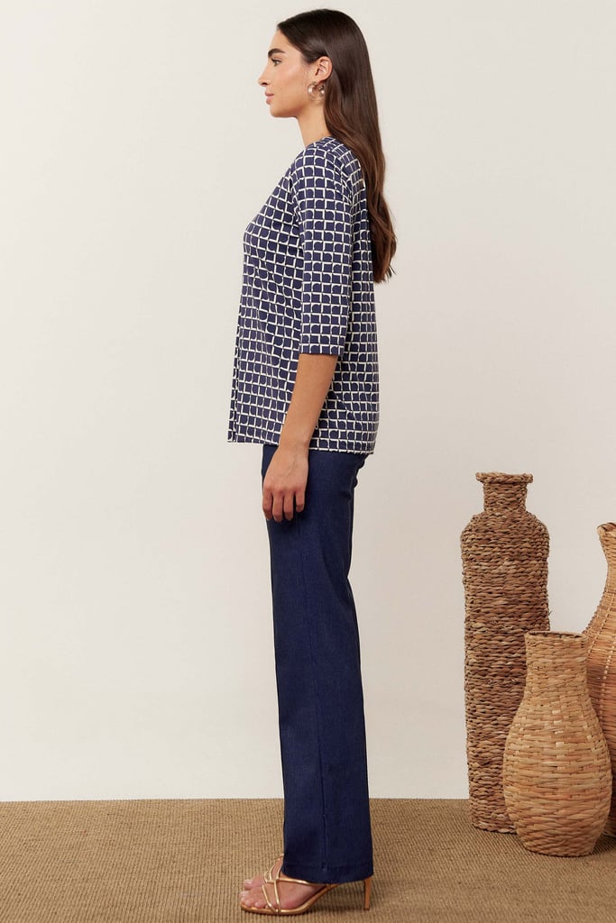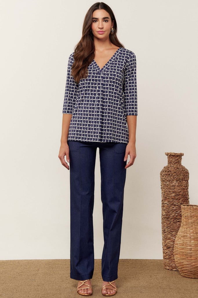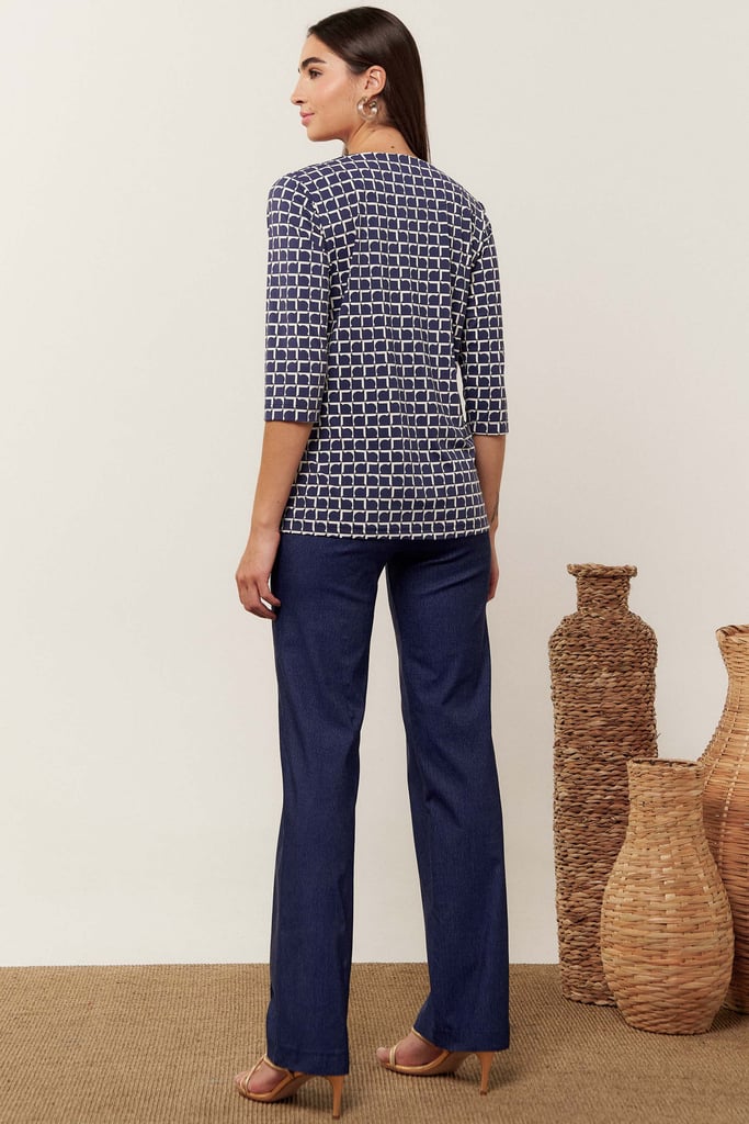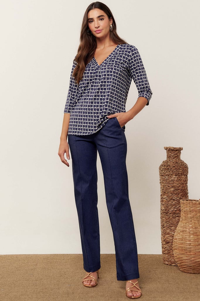 Confeccionada em tecido de malha Fluity, a blusa é super confortável, tem o toque geladinho e não amassa. Combine-a com a nossa calça reta jeans para um look super moderno! Ela possui decote V, detalhe de prega frontal e manga 3/4. A estampa é mais uma exclusividade Simple Life.