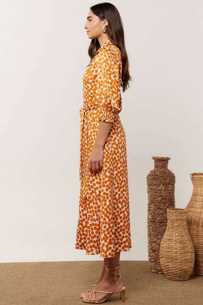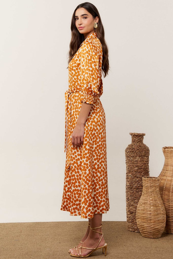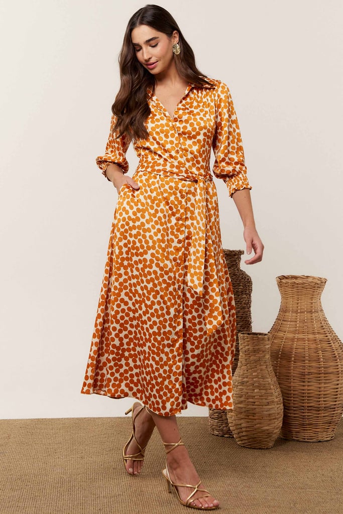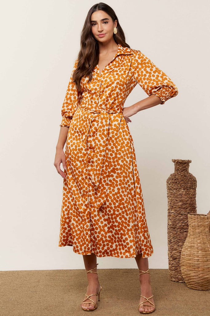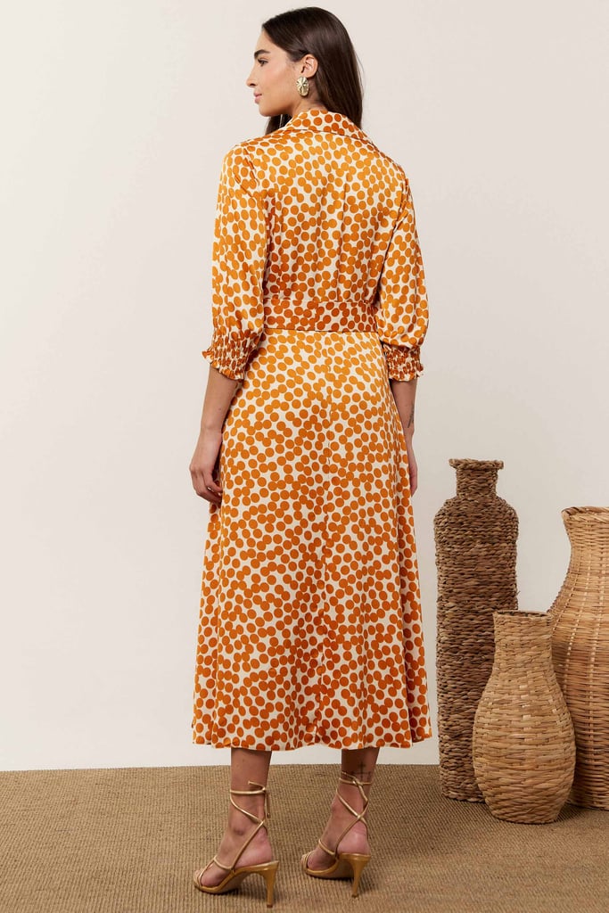Chemise midi confeccionada em tecido de crepe com estampa de poá. Possui modelagem solta ao corpo, colarinho francês, fechamento frontal por botões, bolsos laterais e detalhe de laxtex no ombro e manga. Acompanha faixa do mesmo tecido para amarração.