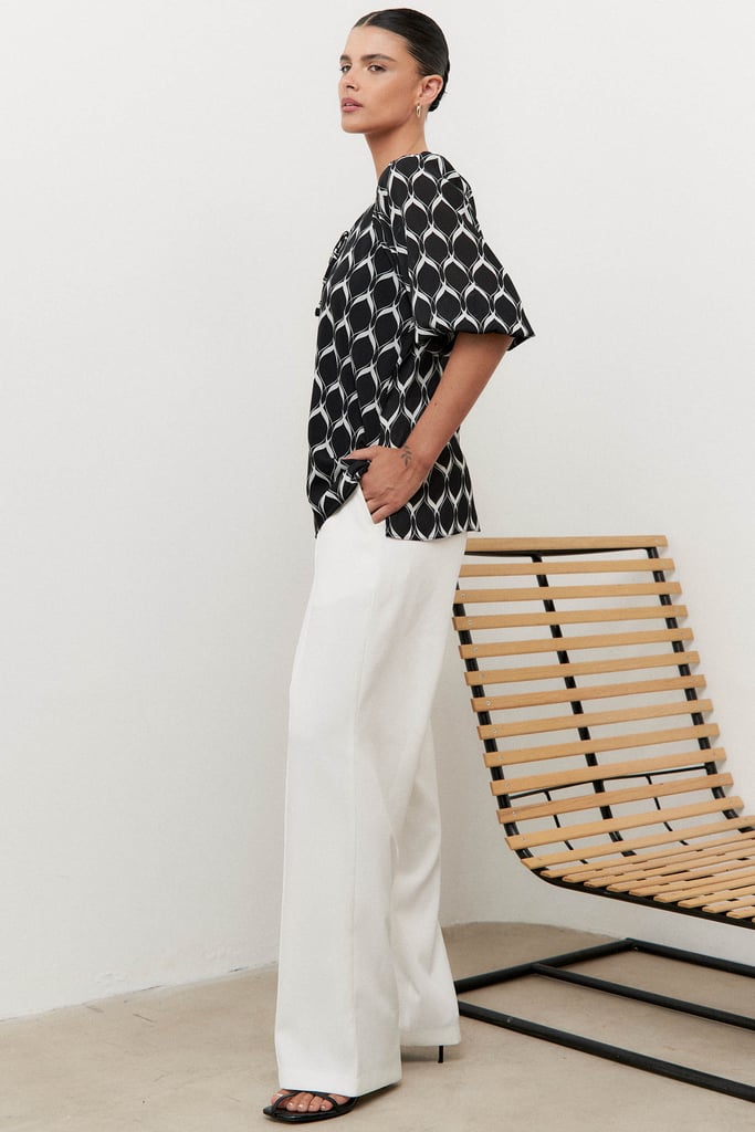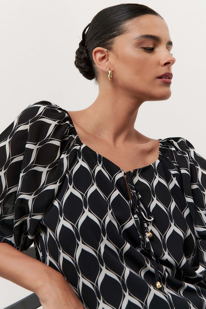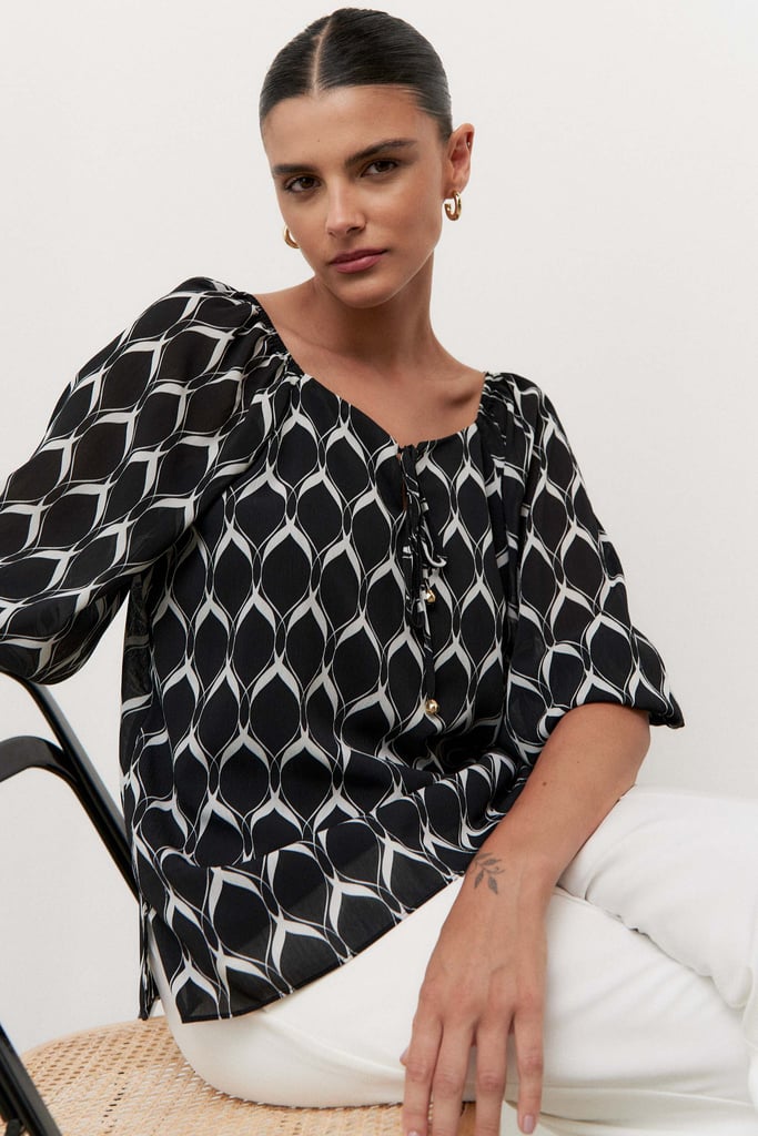 Blusa confeccionada em chiffon texturizado estampado. Possui decote versátil - podendo ser usado com os ombros à mostra - com detalhe de amarração frontal. Manga 3/4 com terminação de elástico. Frente forrada.
