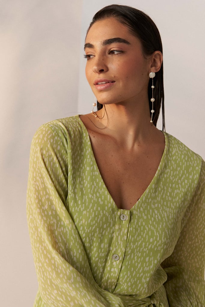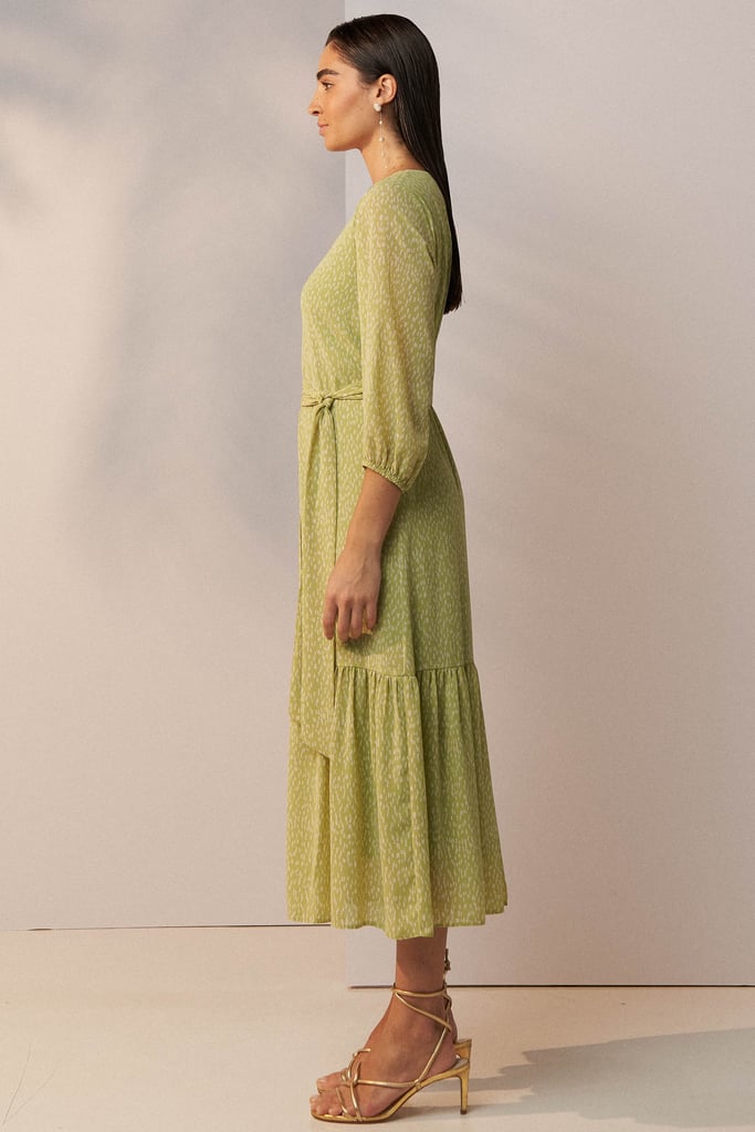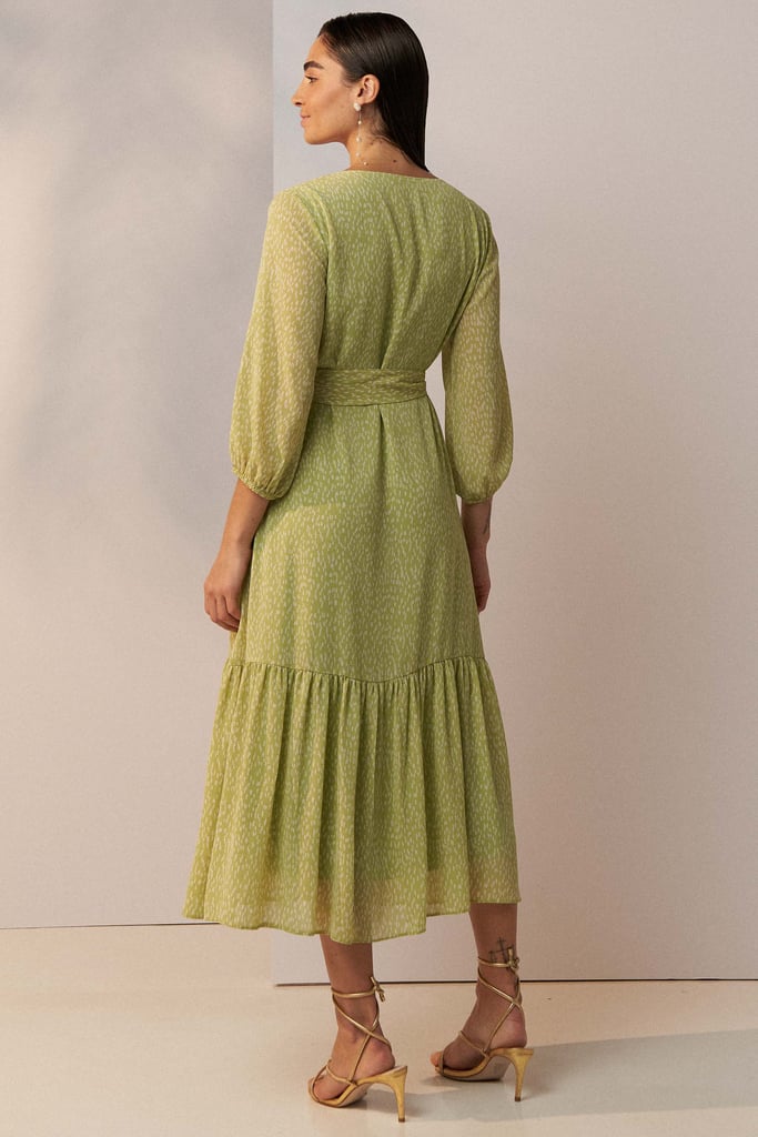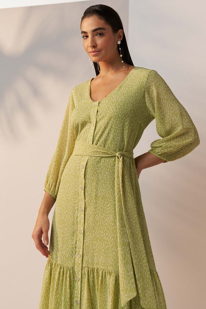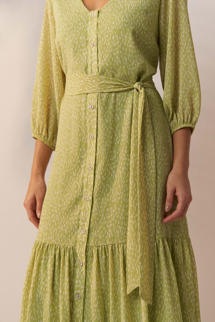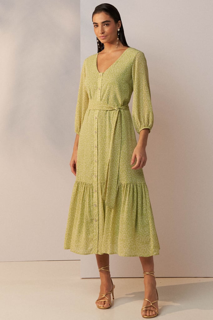 Vestido confeccionado em tecido de chiffon texturizado com padronagem de poá irregular. Possui decote V, fechamento frontal por botões, manga 3/4 com terminação de elástico e babado aplicado na barra. Shape solto ao corpo e comprimento midi. Acompanha faixa do mesmo tecido para amarração. Peça forrada.