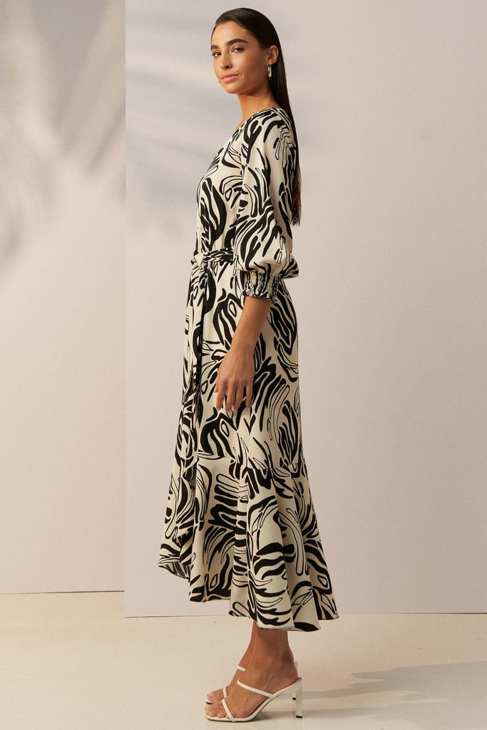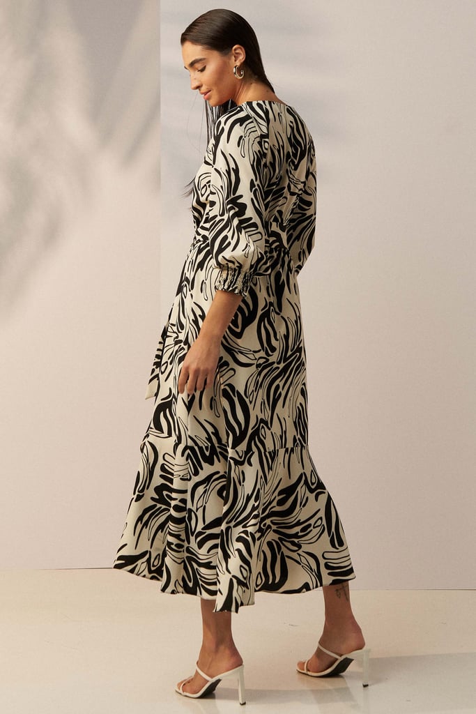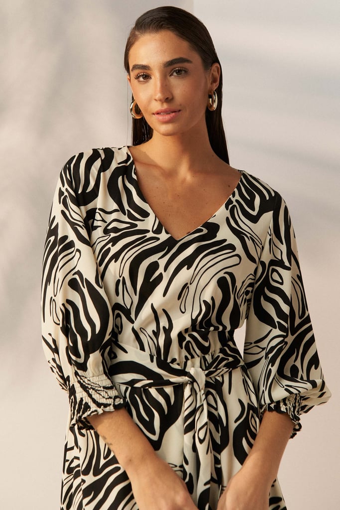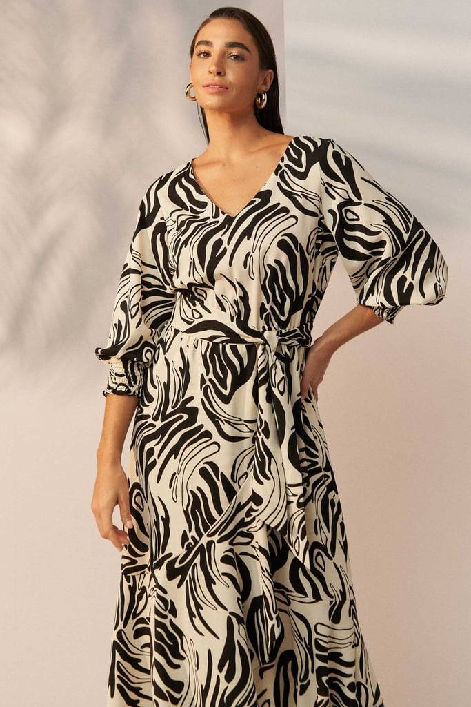 Vestido confeccionado em tecido de crepe estampado. Possui decote V, manga 3/4 com terminação de lastex, elástico embutido na cintura para efeito blusê, saia transpassada com babado aplicado na barra. Peça forrada. Acompanha faixa do mesmo tecido para amarração.