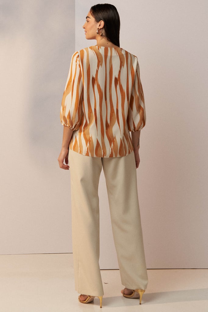 Blusa confeccionada em tecido de crepe estampado. Possui decote V com detalhe de amarração e lapela no busto. Manga 3/4 com terminação de elástico.