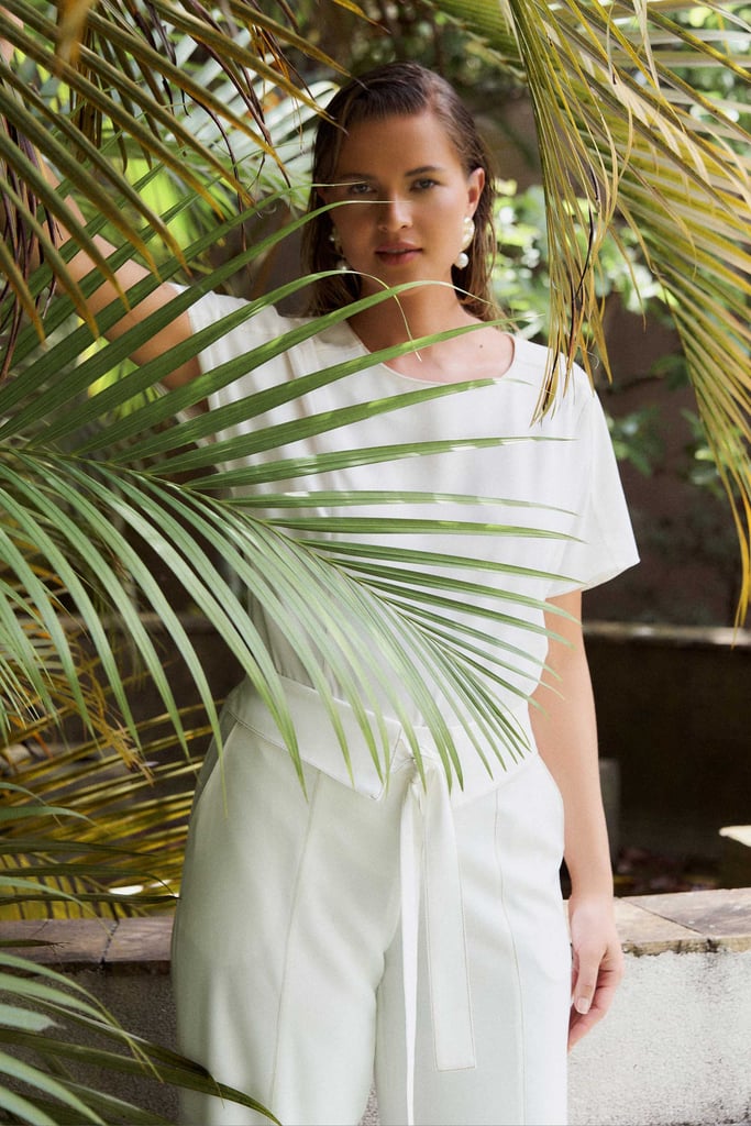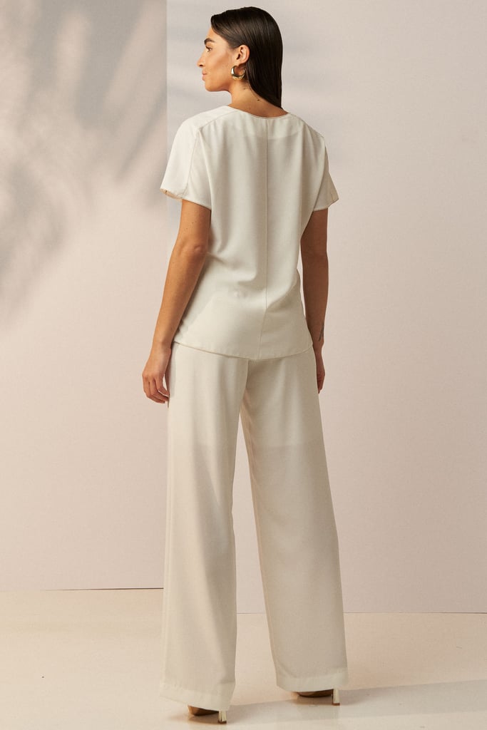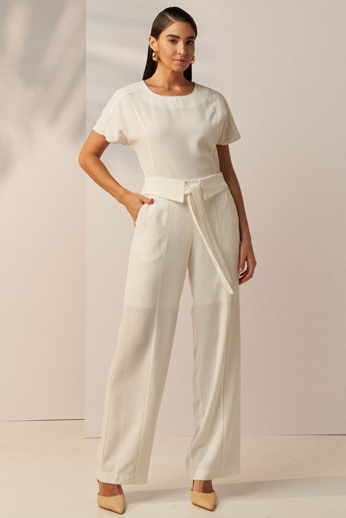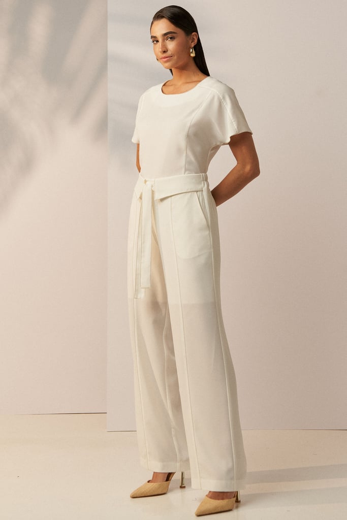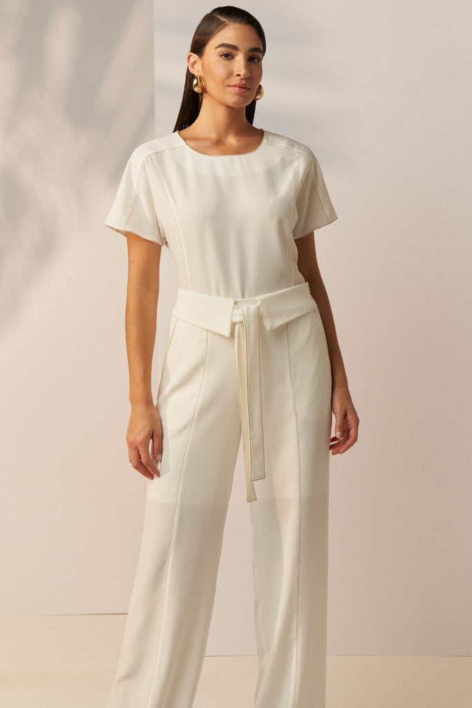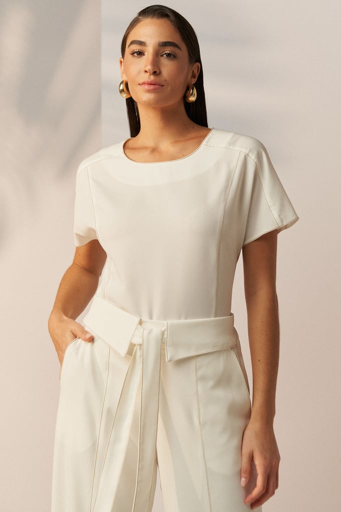 Conjunto pespontado confeccionado em tecido de crepe. Blusa possui decote arredondado, manga curta e detalhe de recortes nos ombros e laterais. Calça tem shape reto, cós virado com faixas para amarração, bolsos faca e detalhe de recorte frontal.