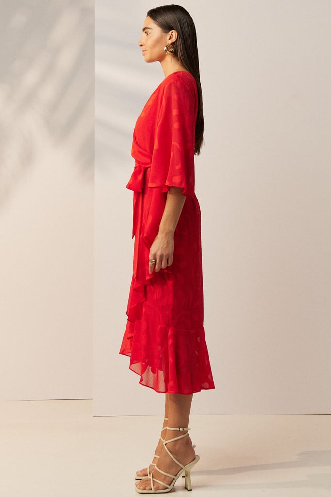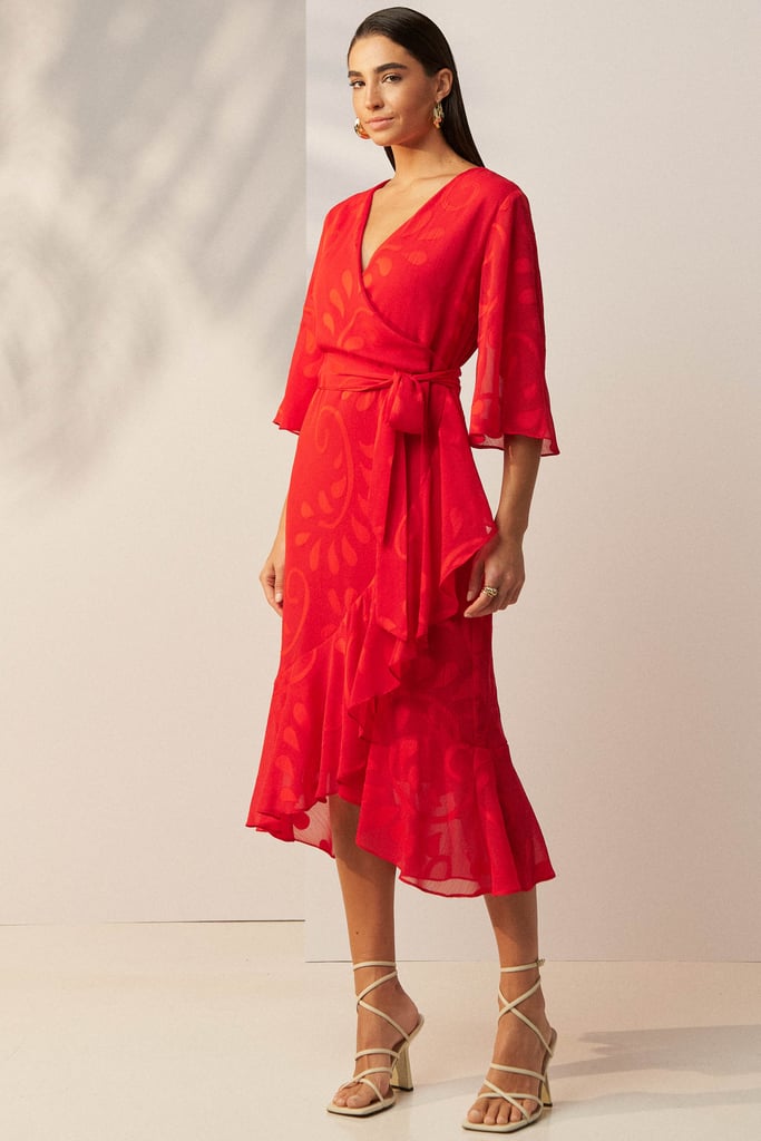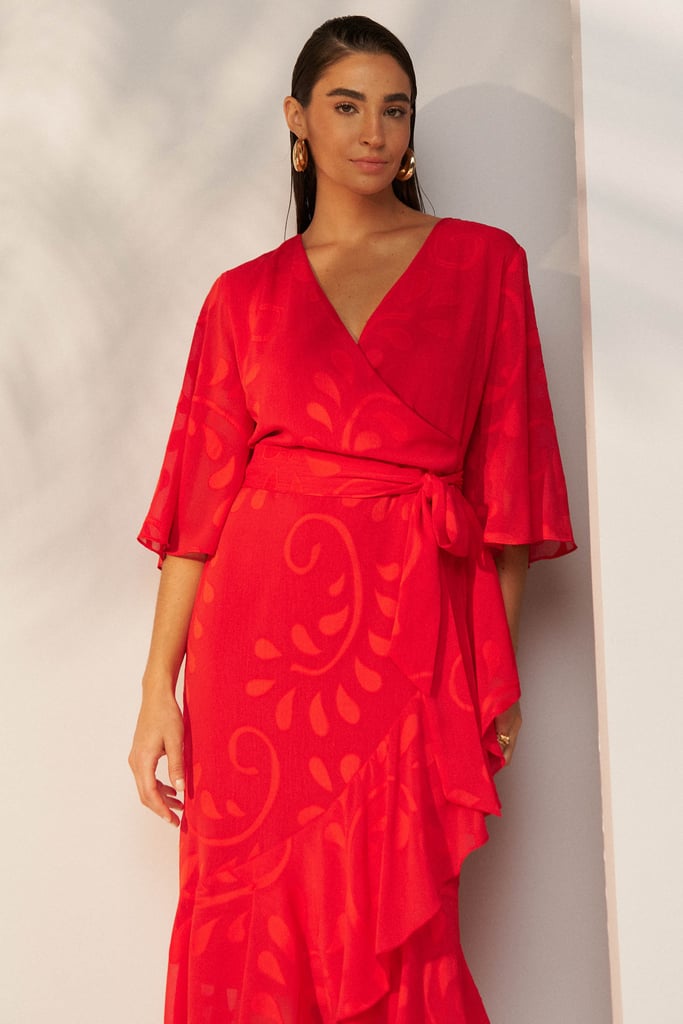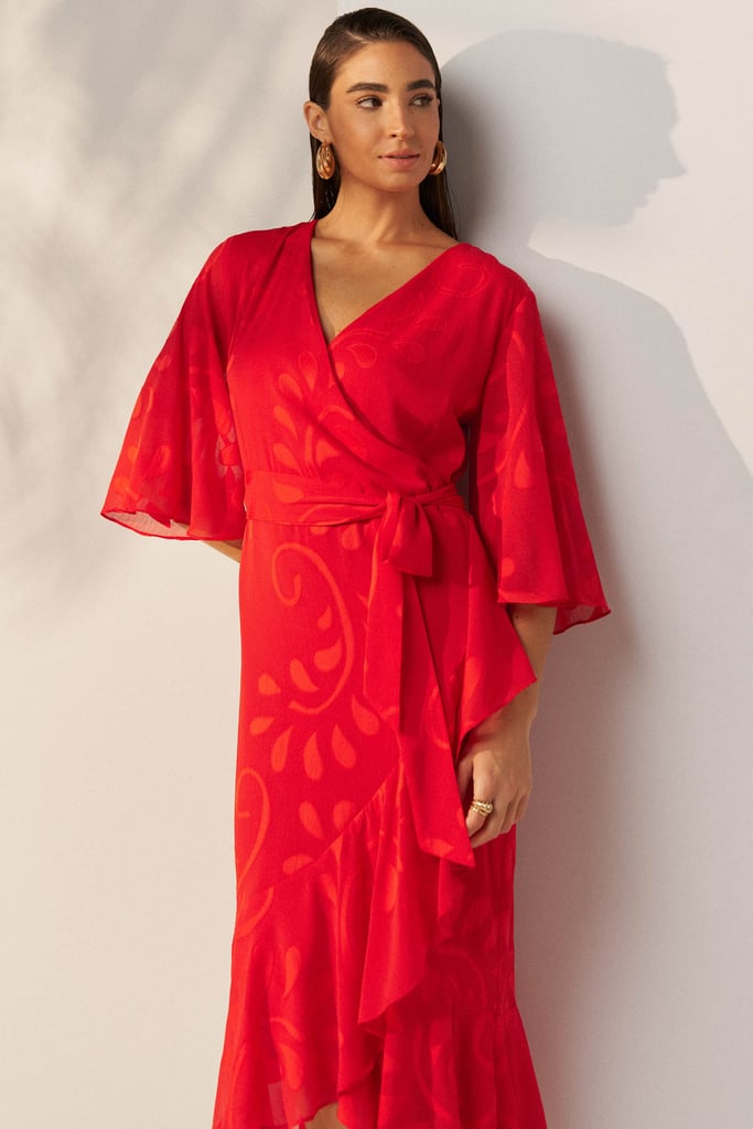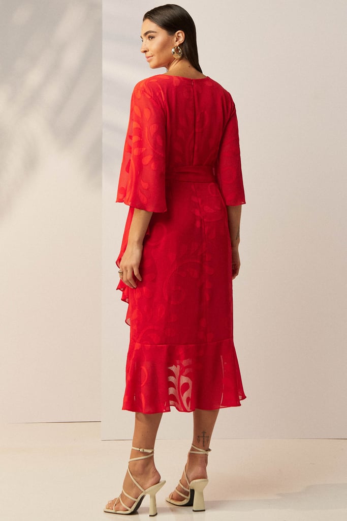 Vestido confeccionado em chiffon jacquard. Possui decote transpassado, manga 3/4 tipo sino, detalhe de babado aplicado na barra e faixas fixas na lateral para amarração. É a escolha perfeita para quem busca um modelo elegante para as festas de fim de ano. Peça forrada.