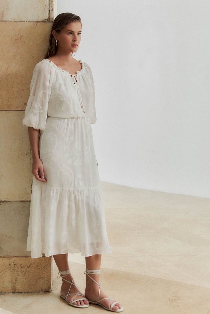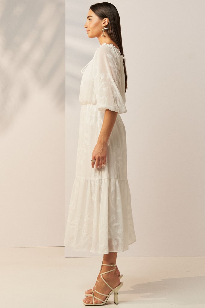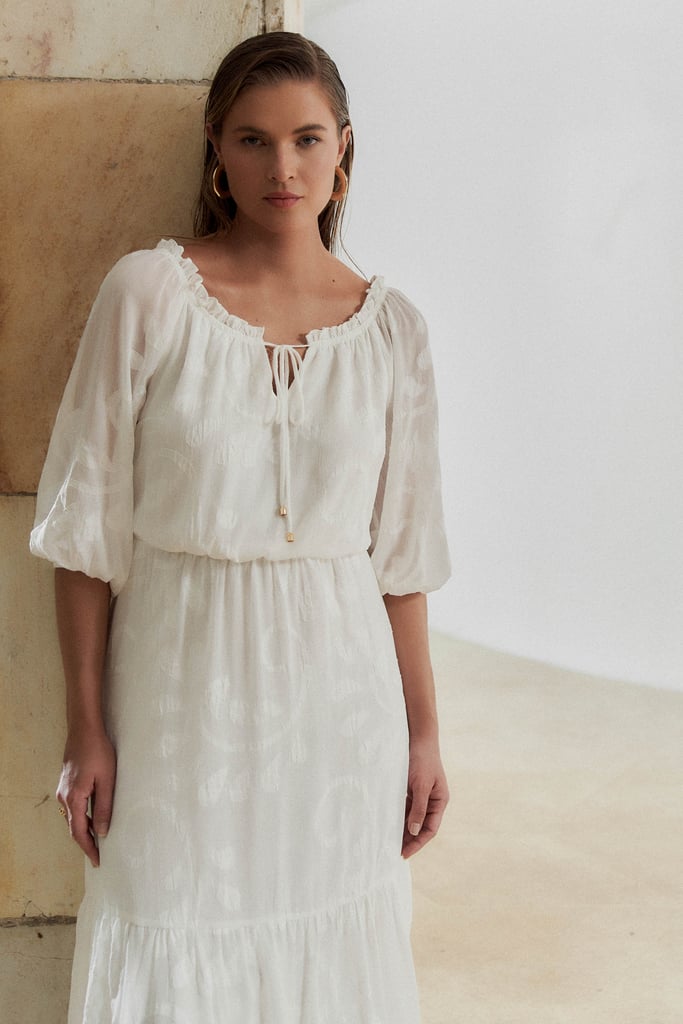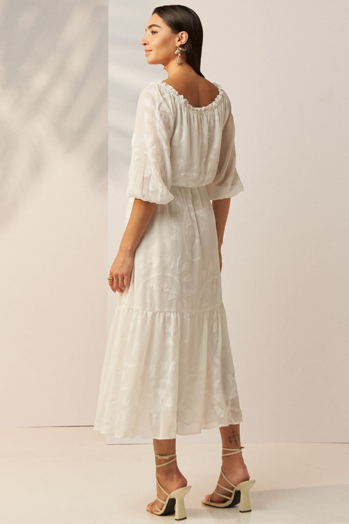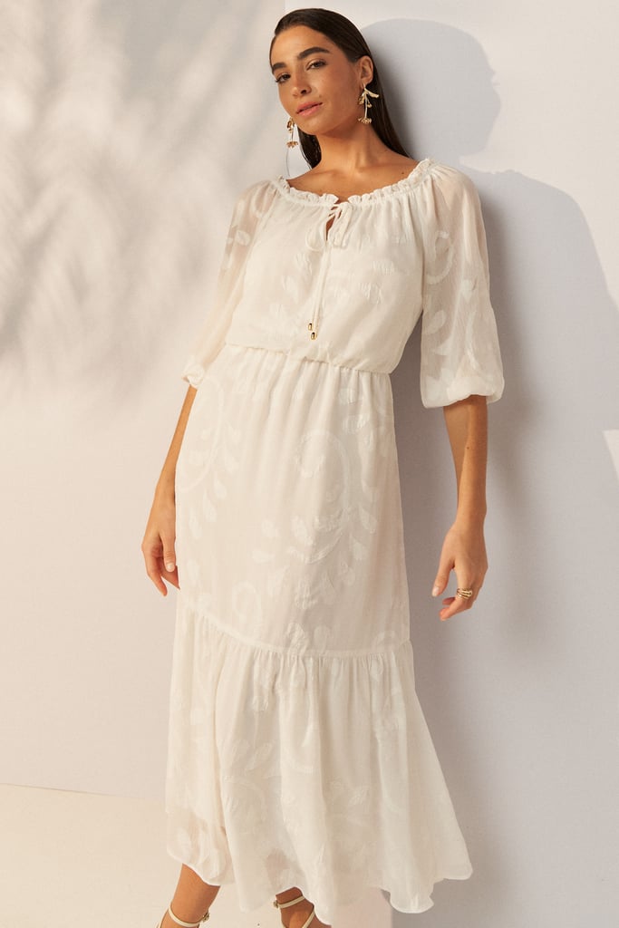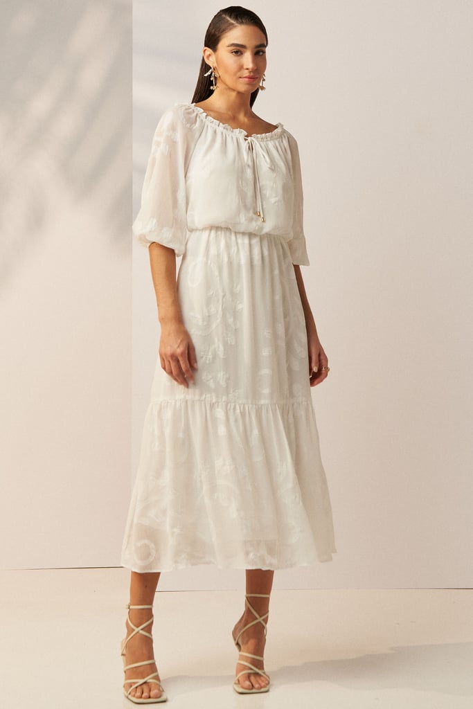 Vestido midi confeccionado em chiffon jacquard. O tecido fluido e a modelagem feminina se alinham perfeitamente com o decote ombro a ombro e a saia com babado aplicado. É a escolha perfeita para quem busca uma peça elegante para as festas de fim de ano. Possui forro.