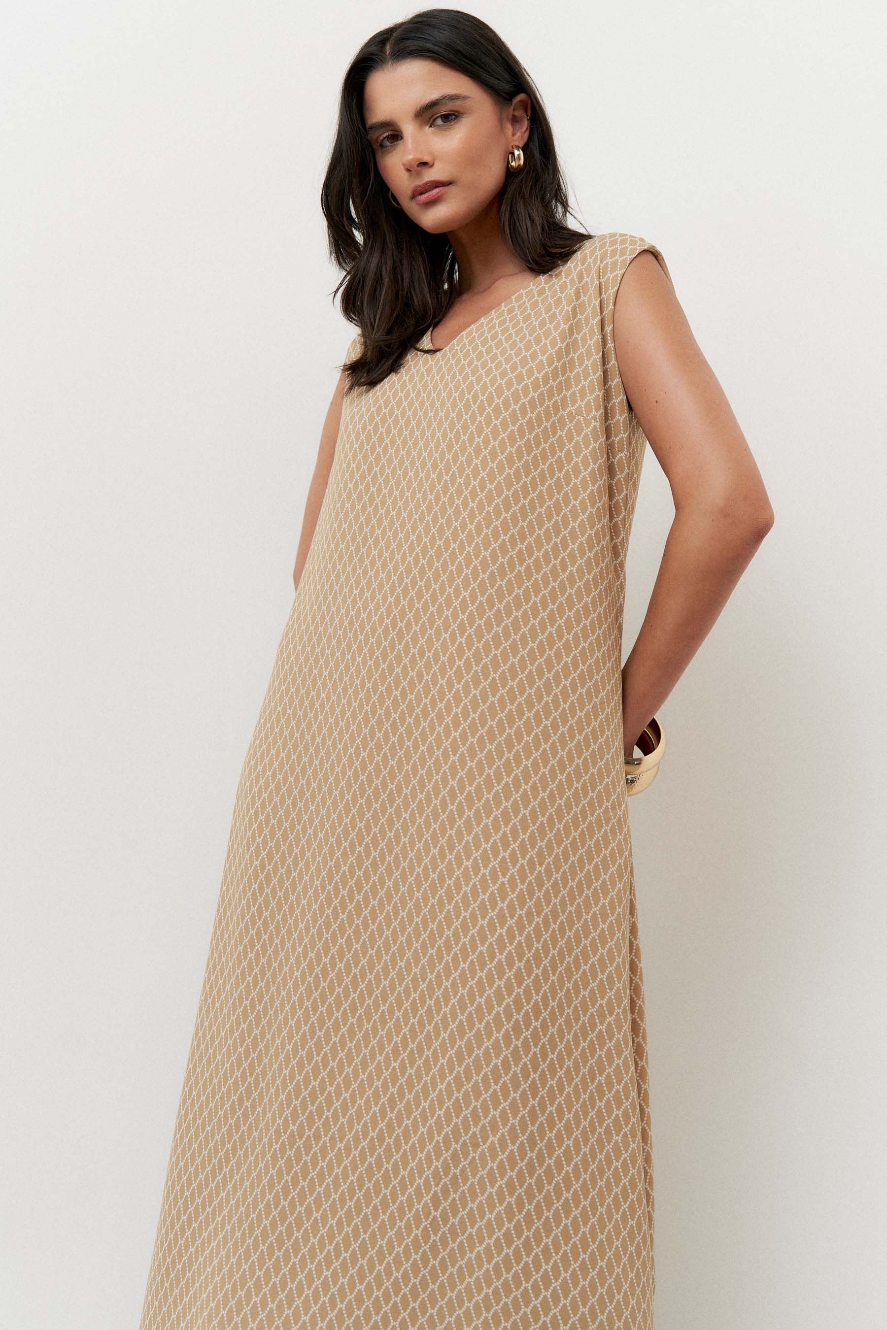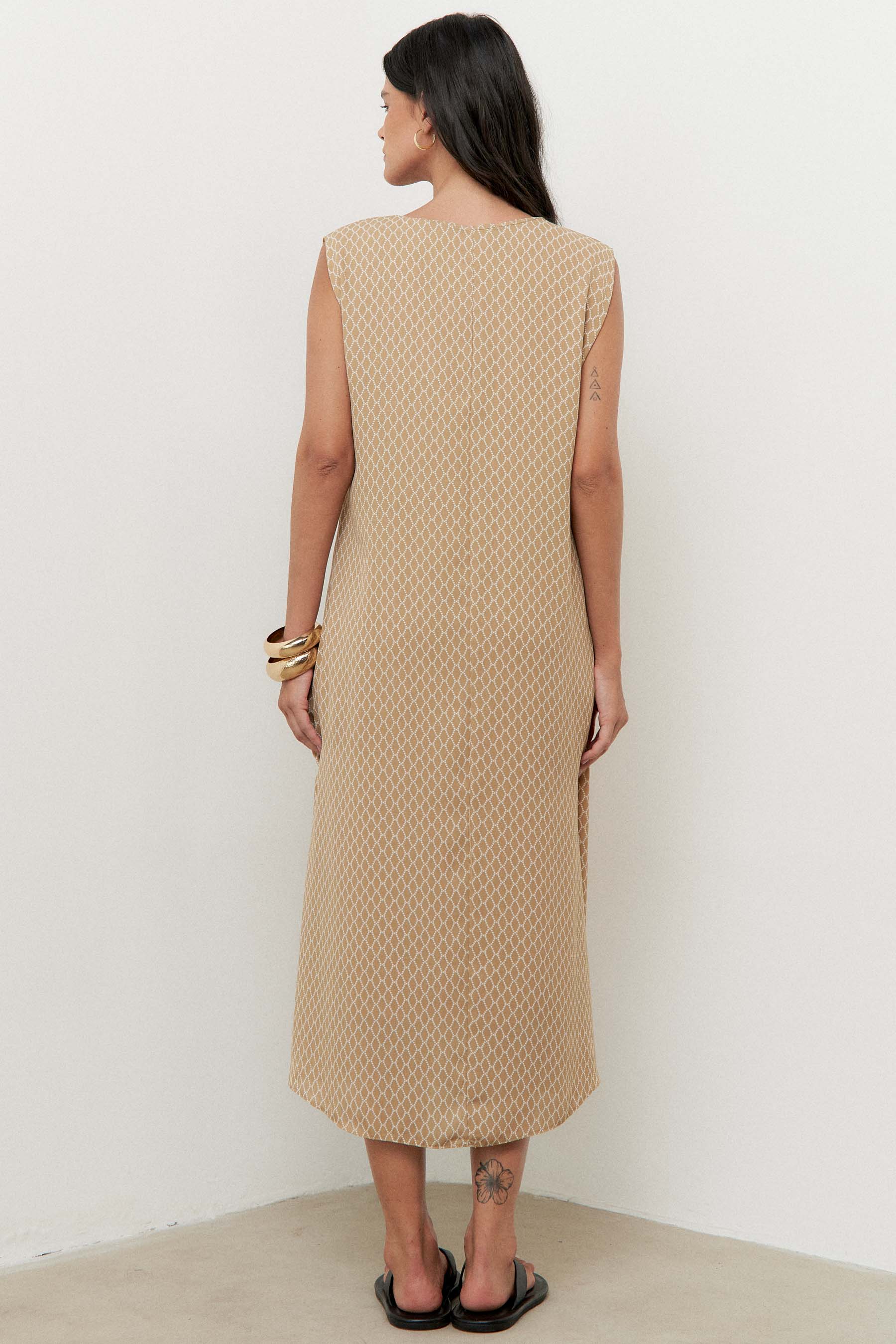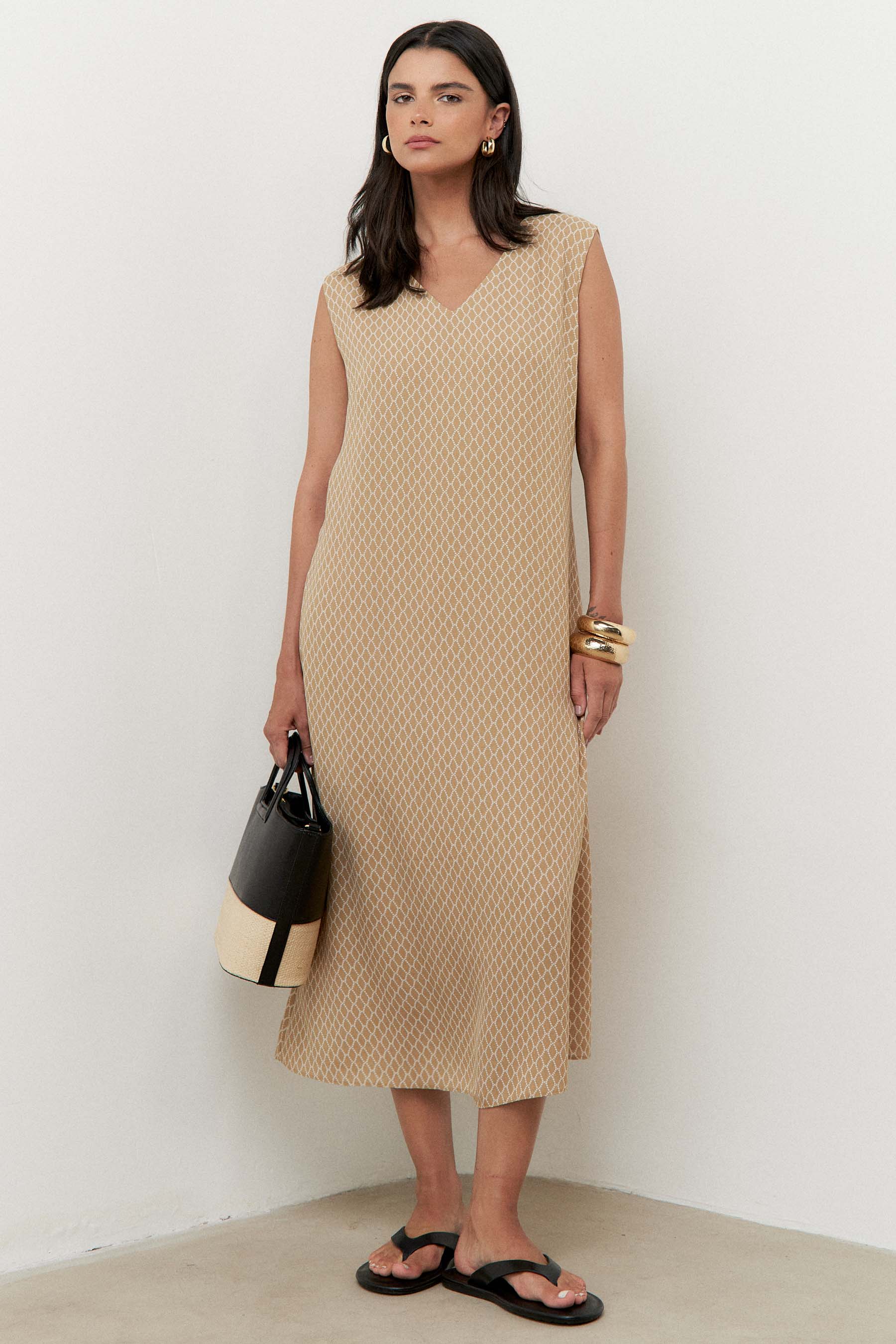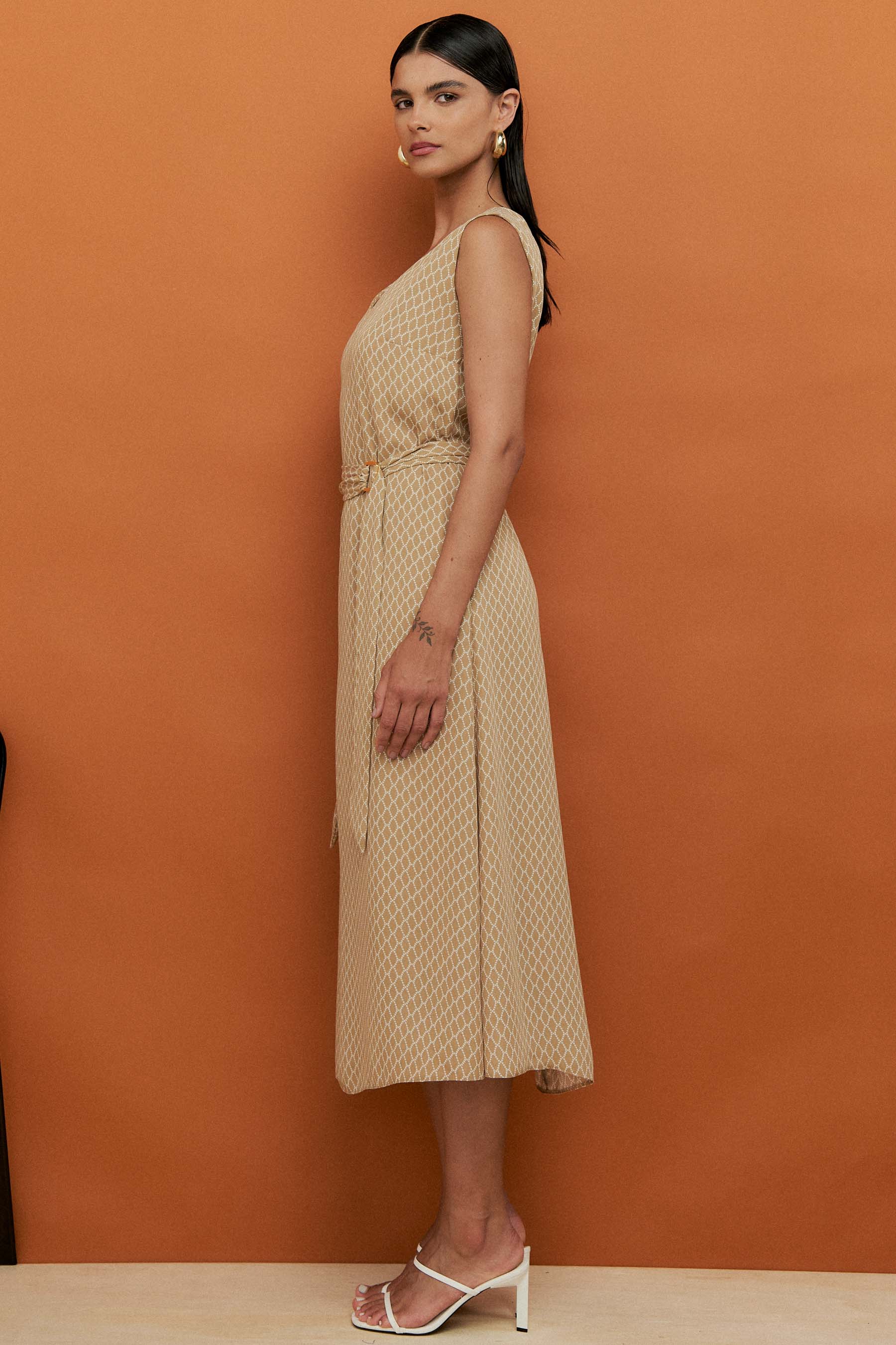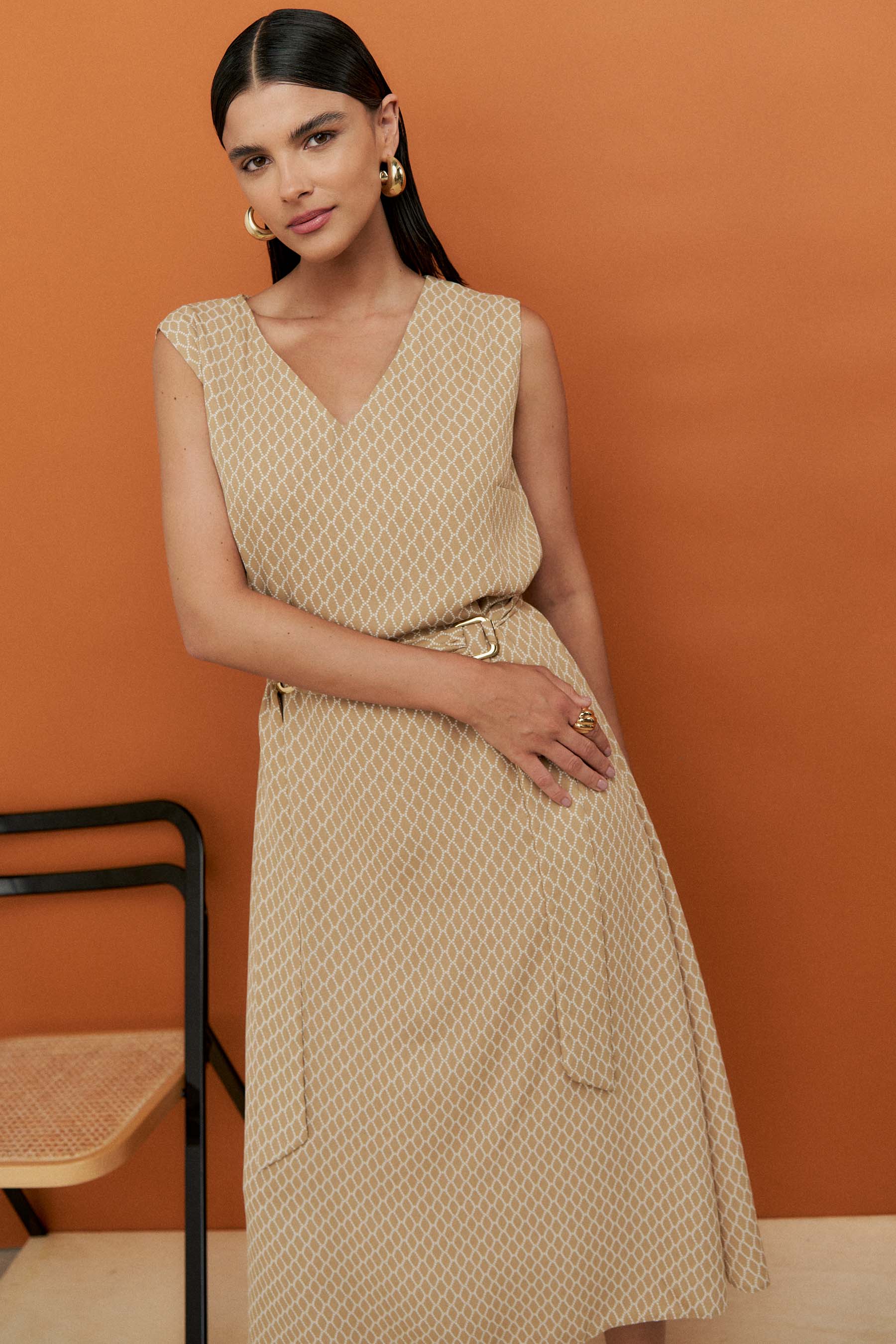 Vestido confeccionado em tecido de crepe estampado. Possui decote V e shape reto. O charme do modelo fica por conta da faixa ajustável com fivelas douradas. Peça forrada.