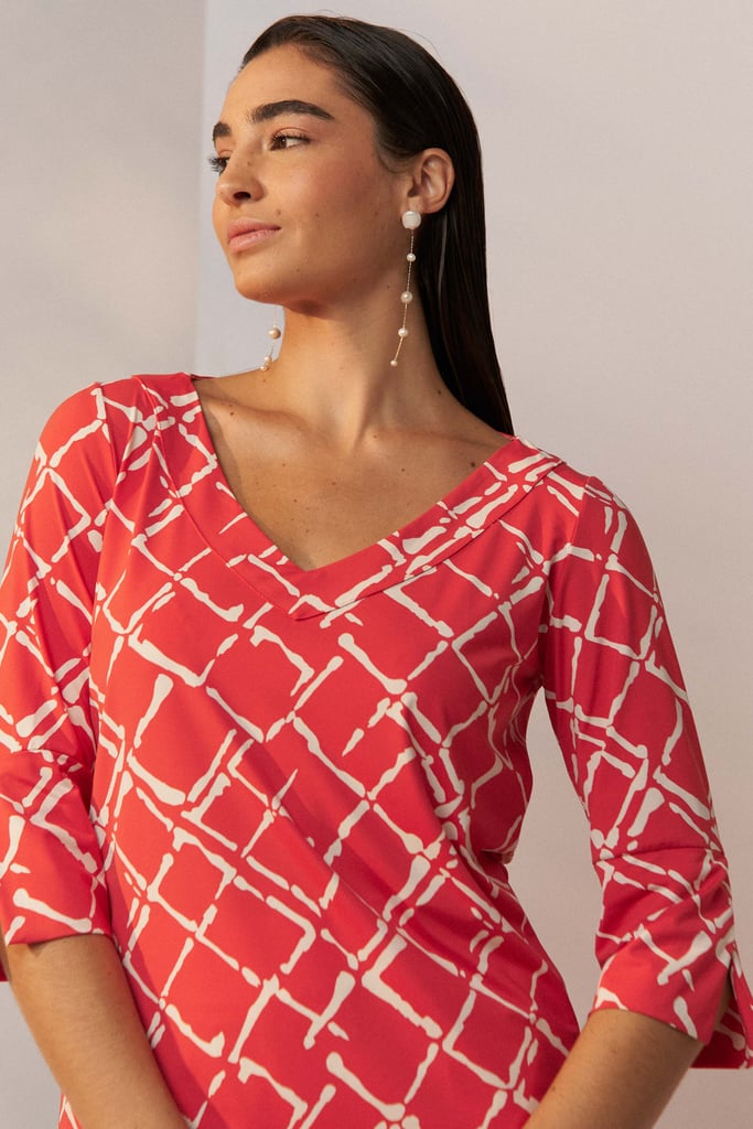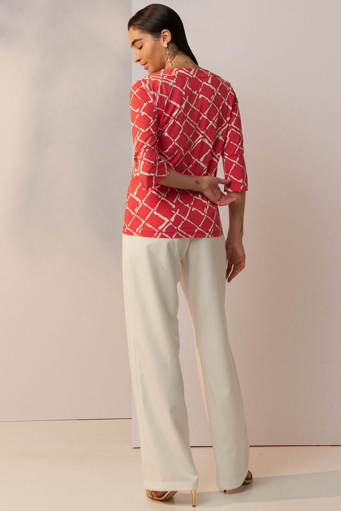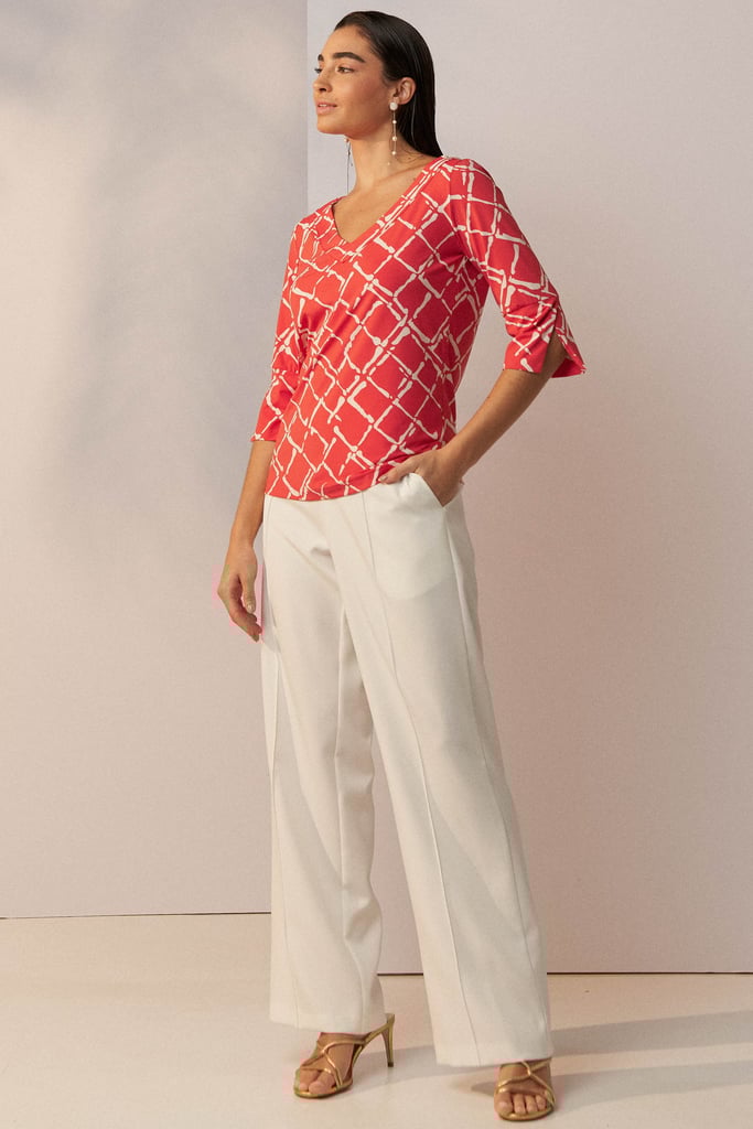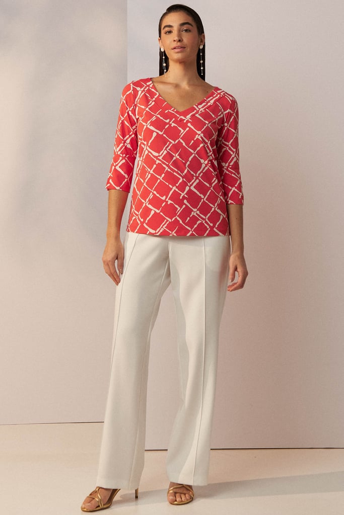 Confeccionada em tecido de malha Fluity, a blusa é super confortável, tem o toque geladinho e não amassa. Combine-a com a calça do conjunto da mesma estampa para um look super moderno! Ela possui decote V e manga 3/4 com detalhe de fenda. A estampa é mais uma exclusividade Simple Life.