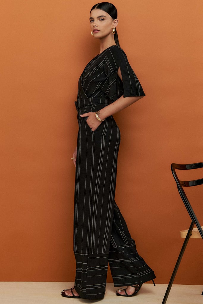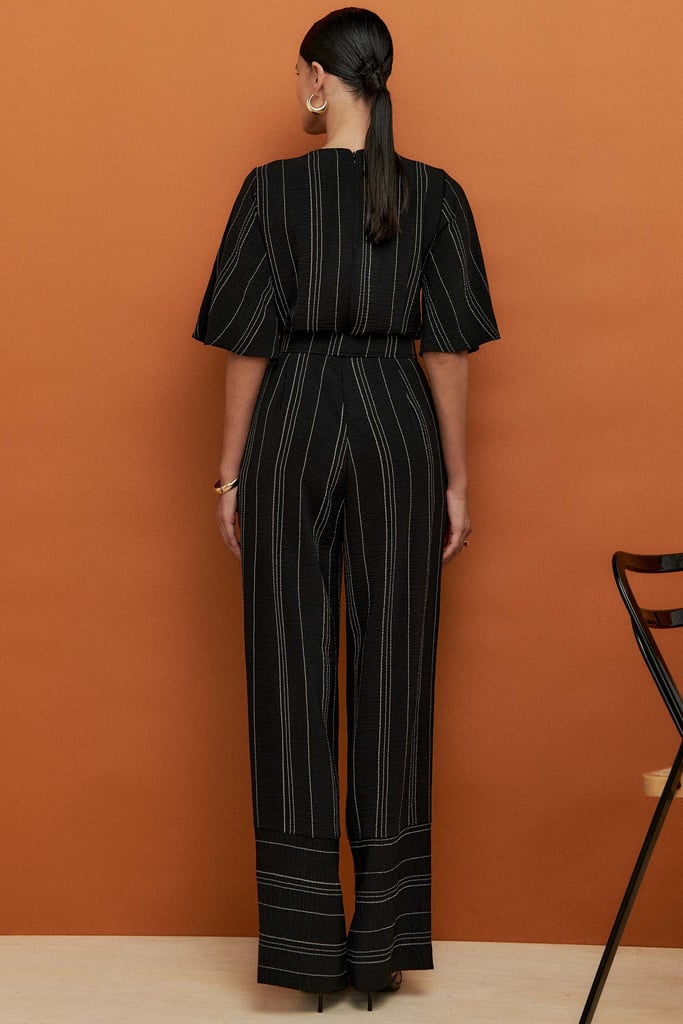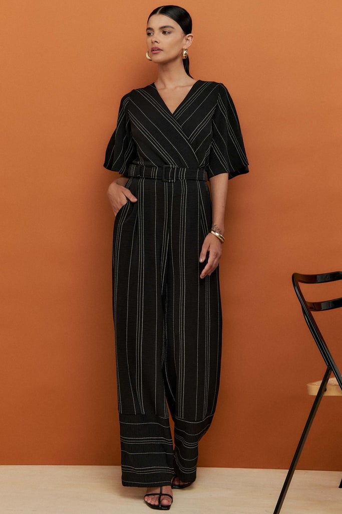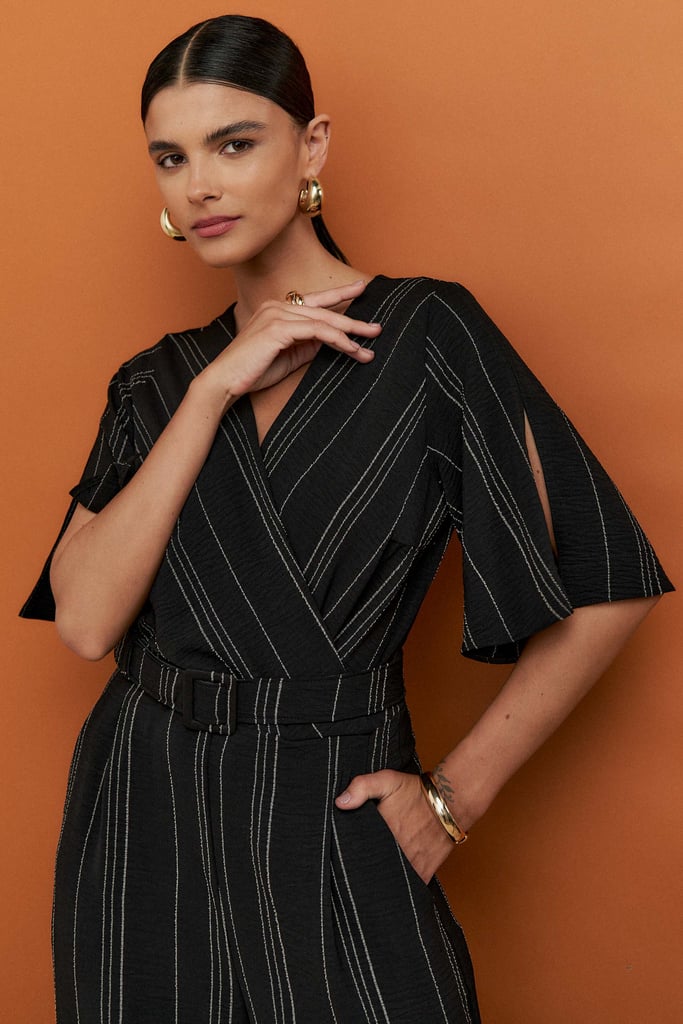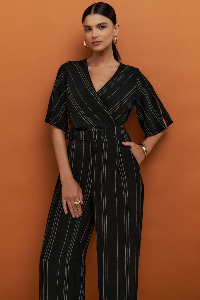 Macacão confeccionado em tecido de crepe com padronagem listrada. Possui decote transpassado, bolsos laterais e manga 3/4 tipo sino com detalhe de fenda. Fechamento por zíper nas costas. Acompanha cinto forrado do mesmo tecido.