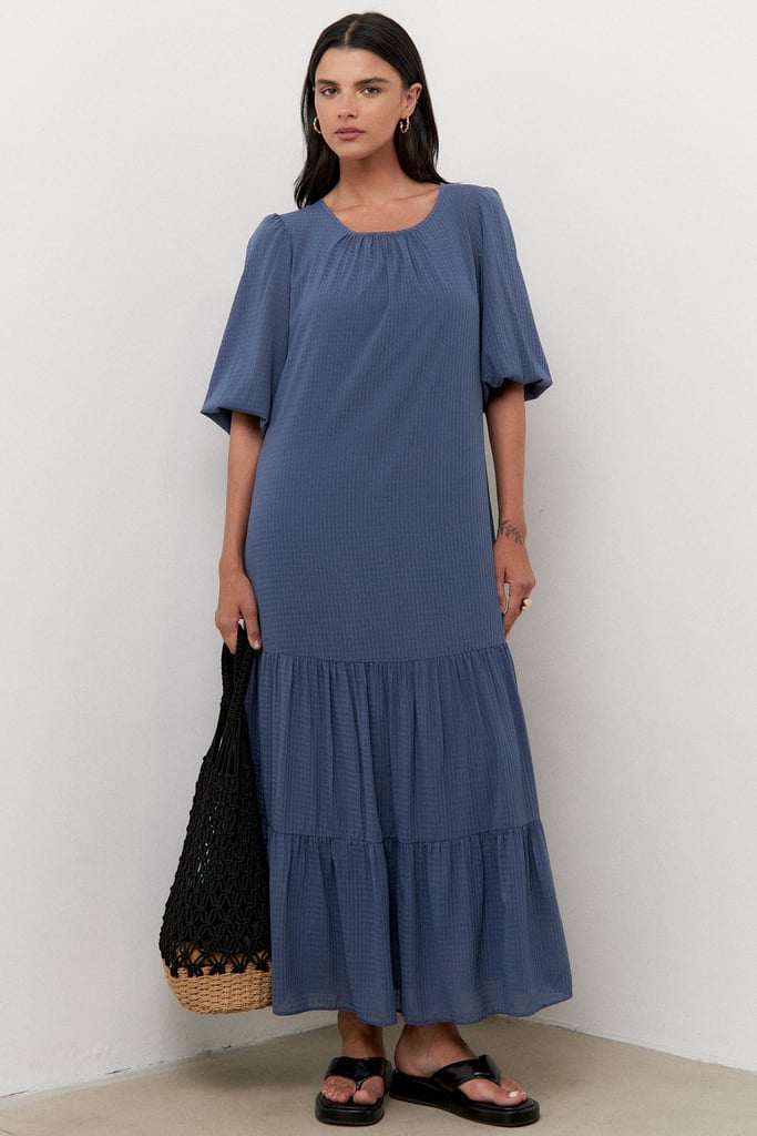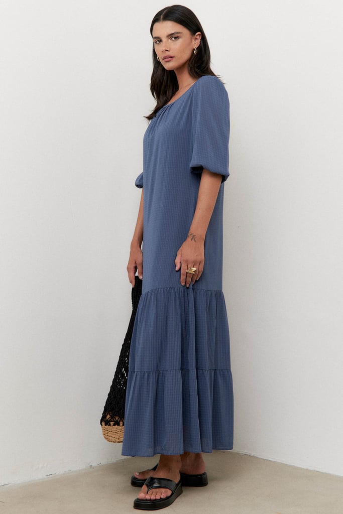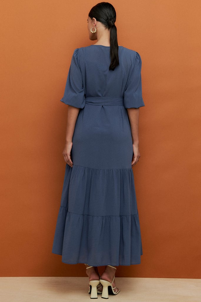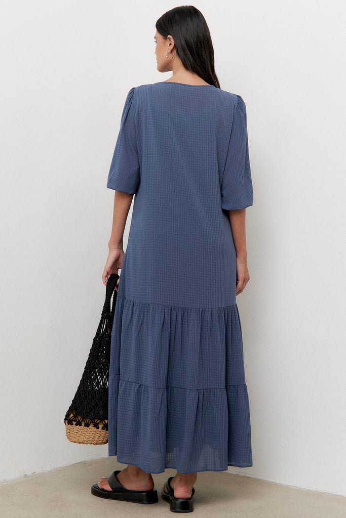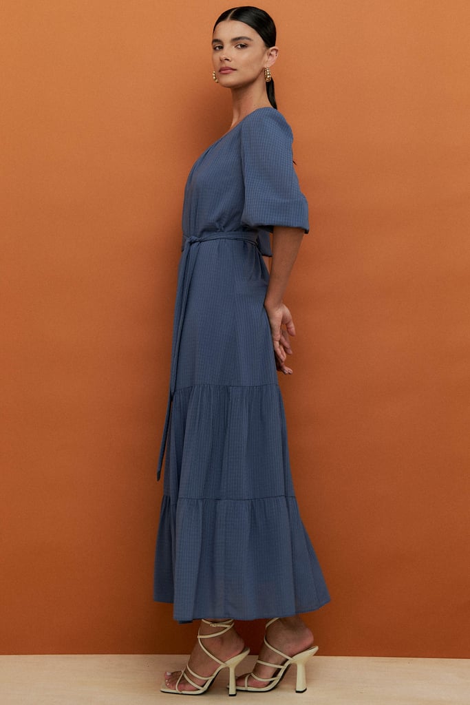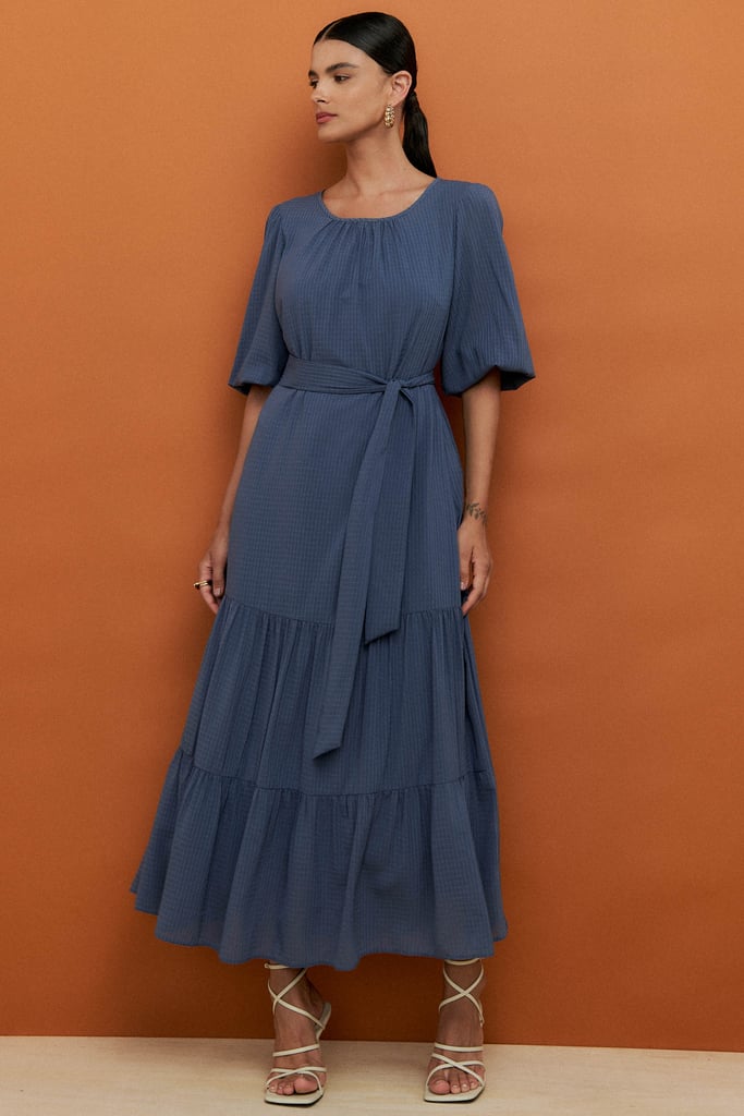 Vestido confeccionado em tecido de crepe texturizado. Possui decote redondo, manga 3/4 com terminação de elástico e camadas aplicadas na barra. Comprimento midi. Acompanha anágua e faixa do mesmo tecido para amarração.