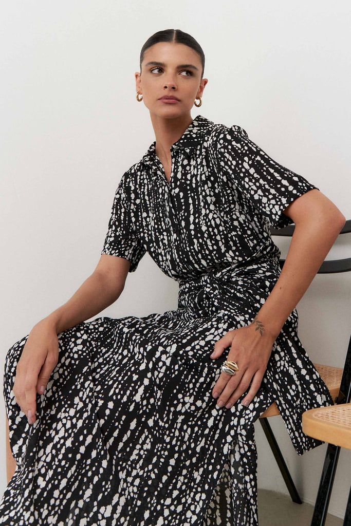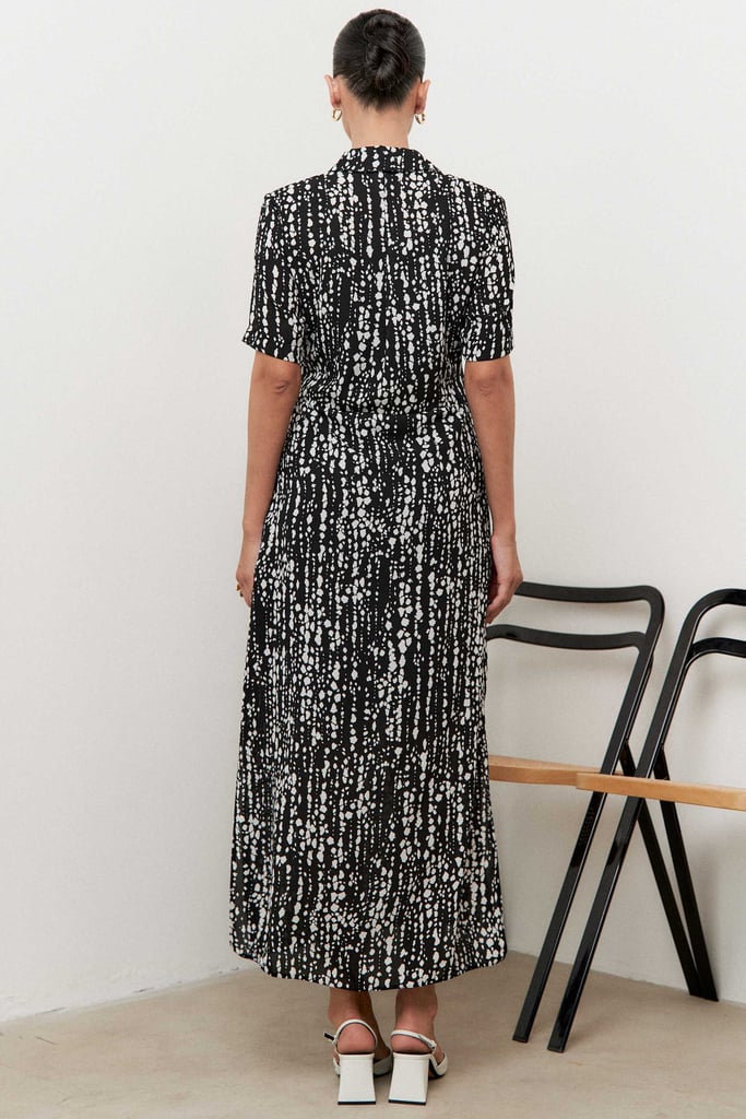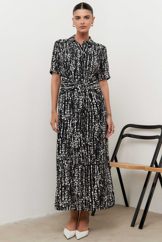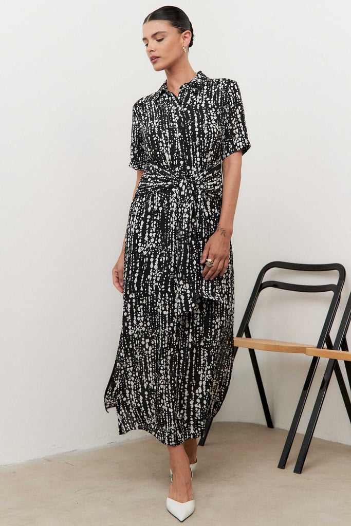 Vestido camisa confeccionado em crepe com padronagem animal print estilizado. Possui gola, vista frontal interrompida com botões, manga curta e fendas laterais. Faixas fixas para amarração. Acompanha anágua de forro.