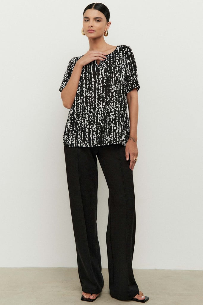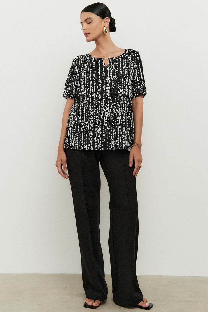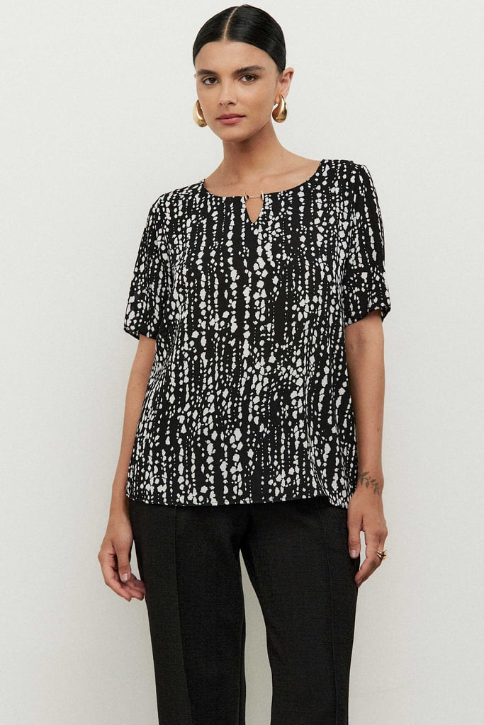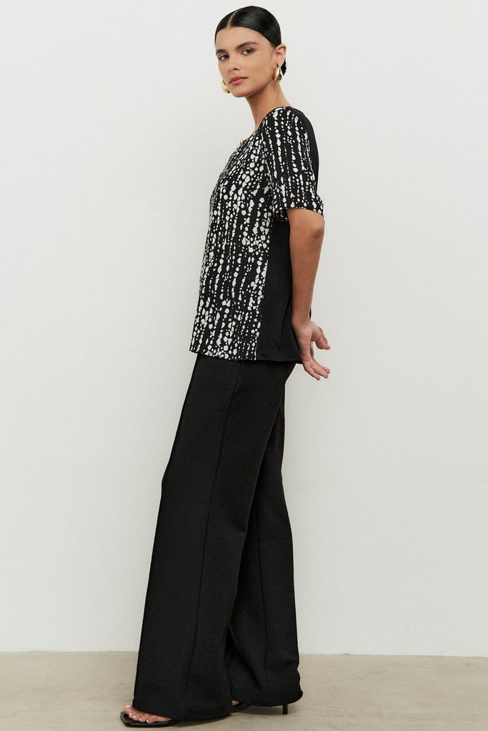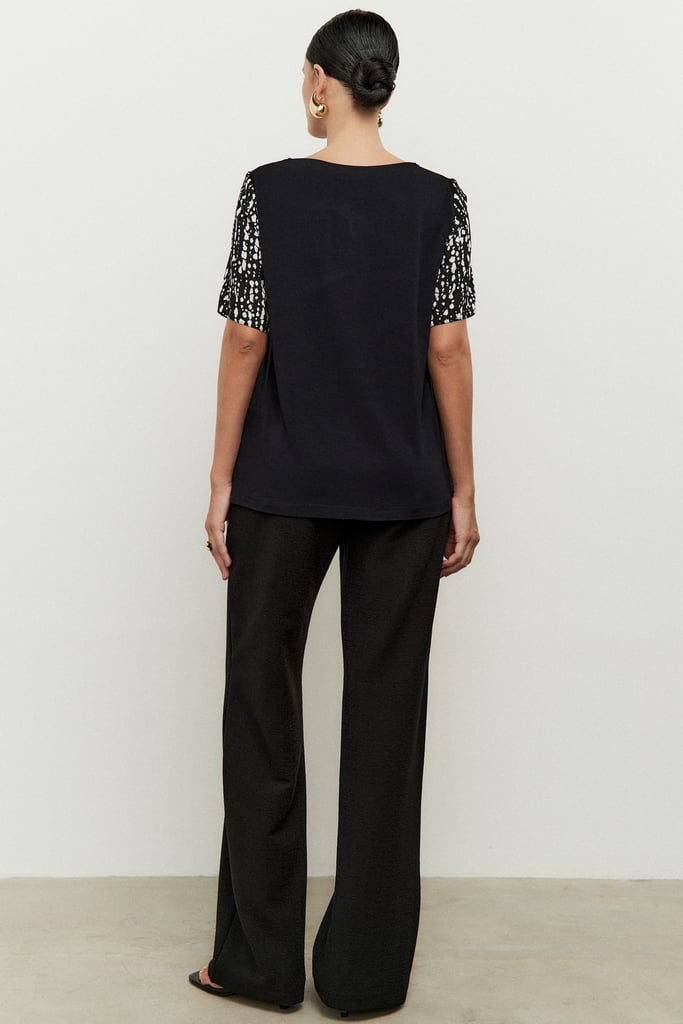 Blusa combinada com frente confeccionada em tecido de crepe e costas de malha para maior conforto. Possui decote careca com detalhe de corrente e manga curta.