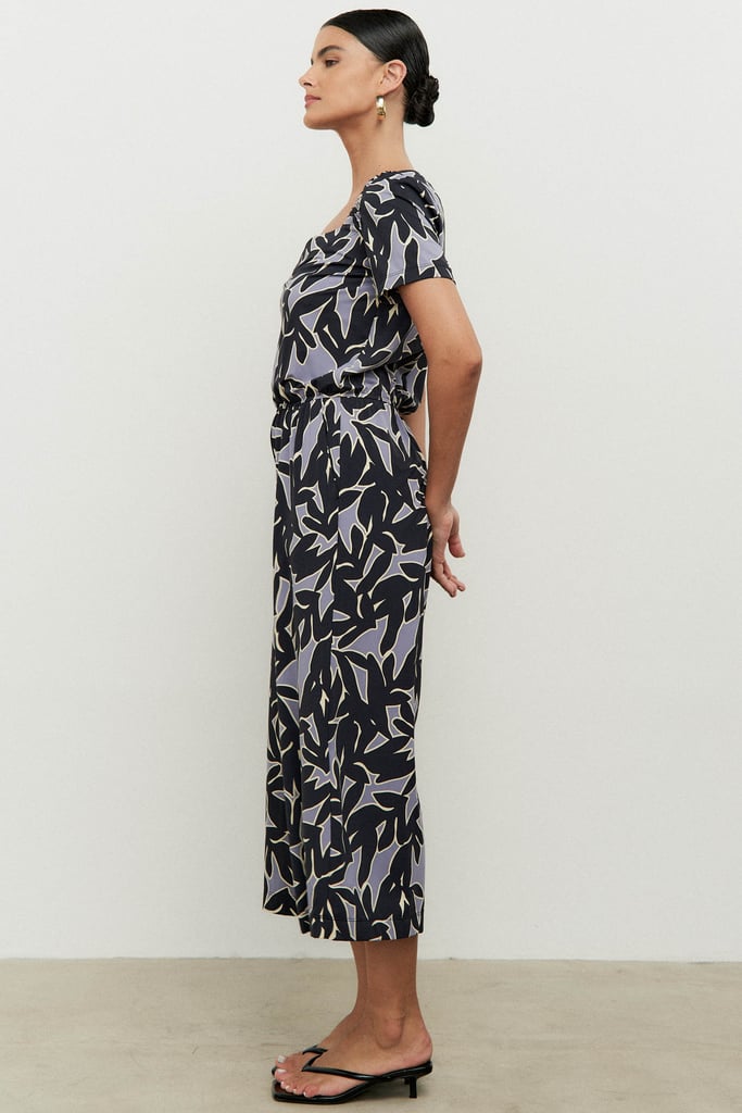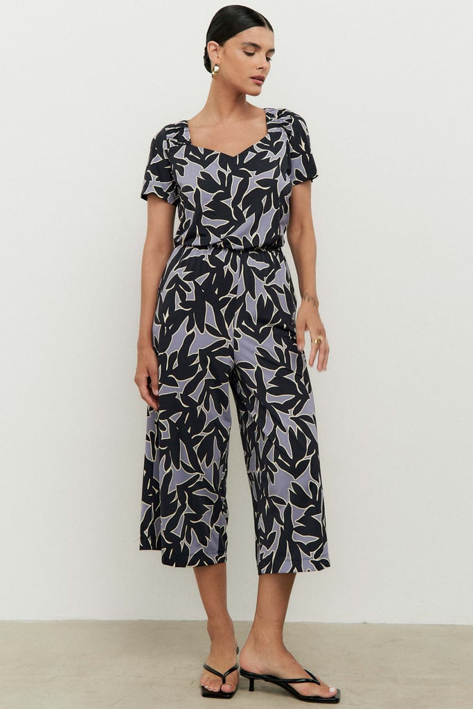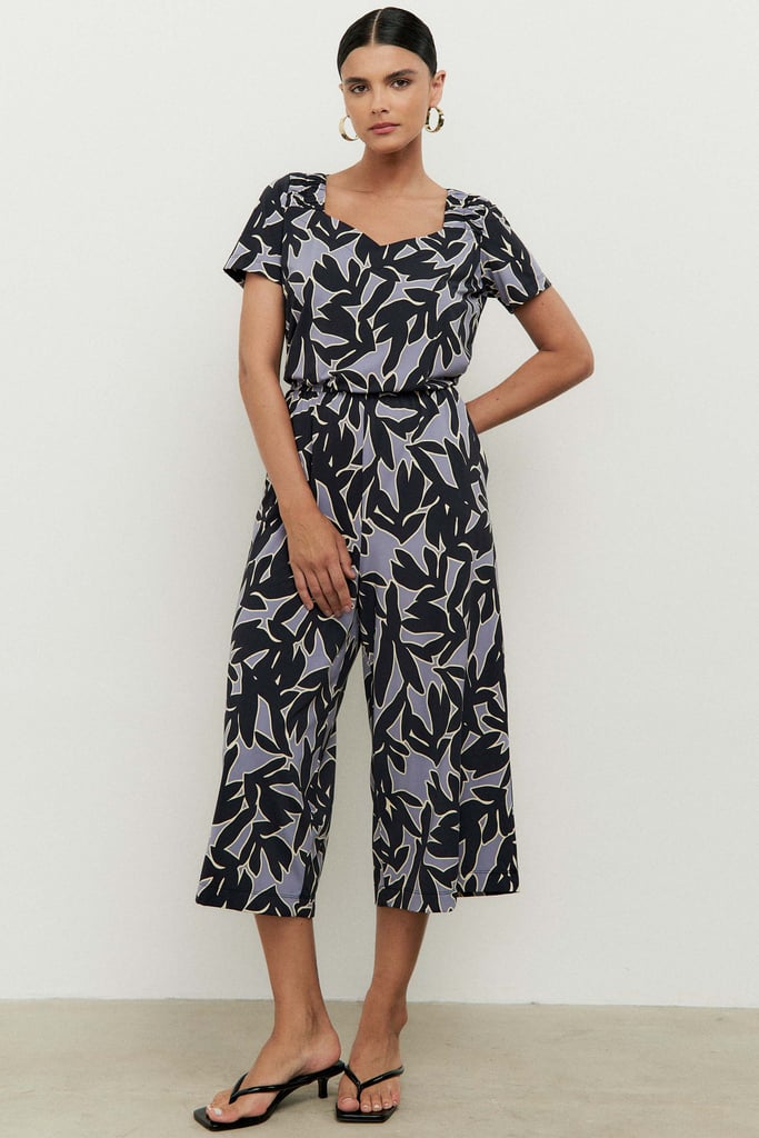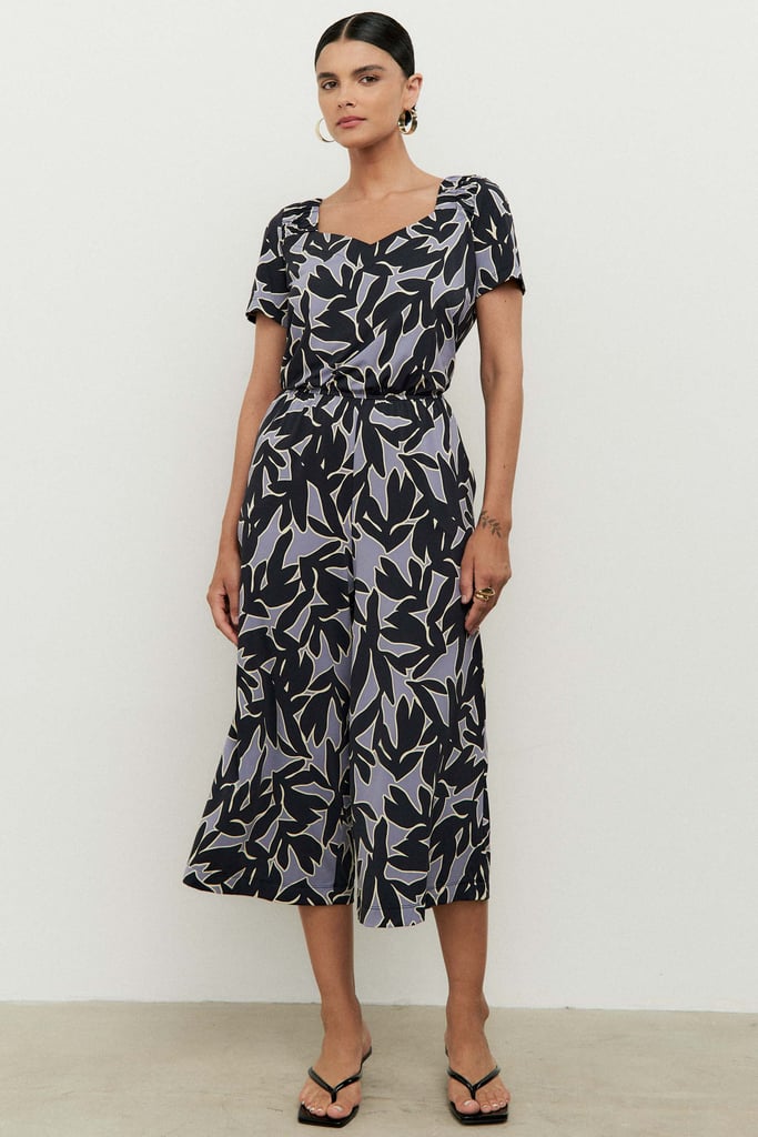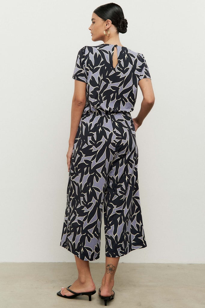 Confeccionado em tecido de malha Fluity, o conjunto é superconfortável, tem o toque geladinho e não amassa. Ele possui decote V com detalhe de elástico no ombro, manga curta, elástico embutido na cintura, bolsos laterais e fechamento por botão nas costas. A estampa é mais uma exclusividade Simple Life.