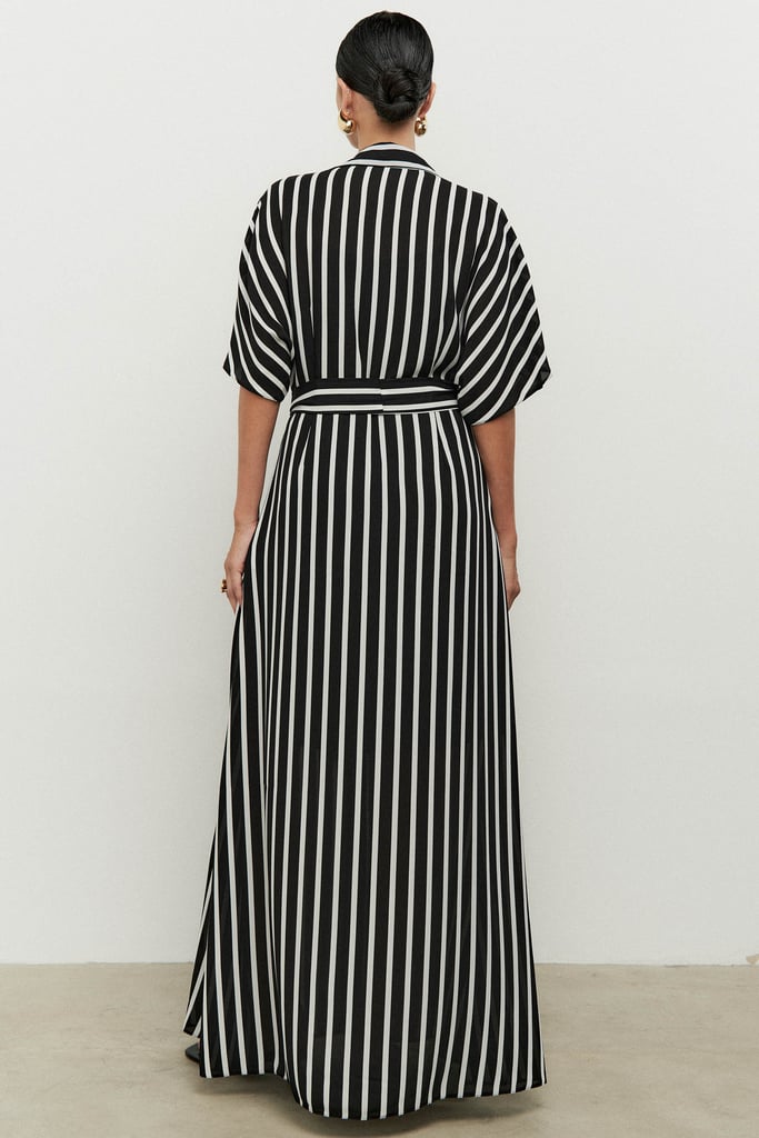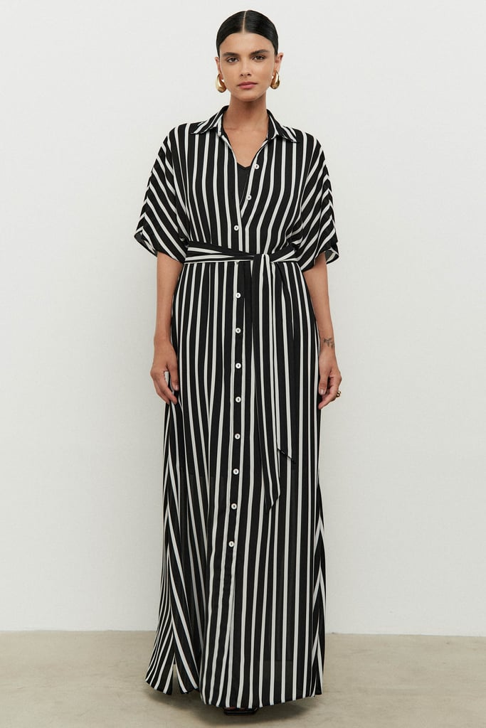 Chemise confeccionada em tecido de crepe estampado com padronagem de listras. Possui gola de camisa, vista com fechamento frontal por botões, bolsos e fendas laterais. Acompanha anágua de forro e faixa do mesmo tecido para amarração.