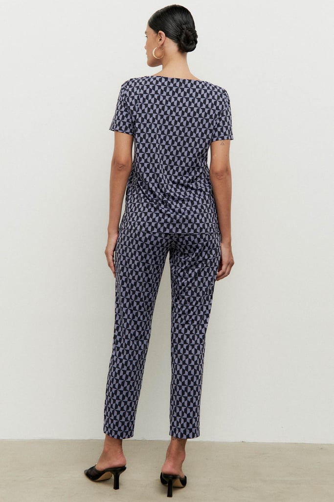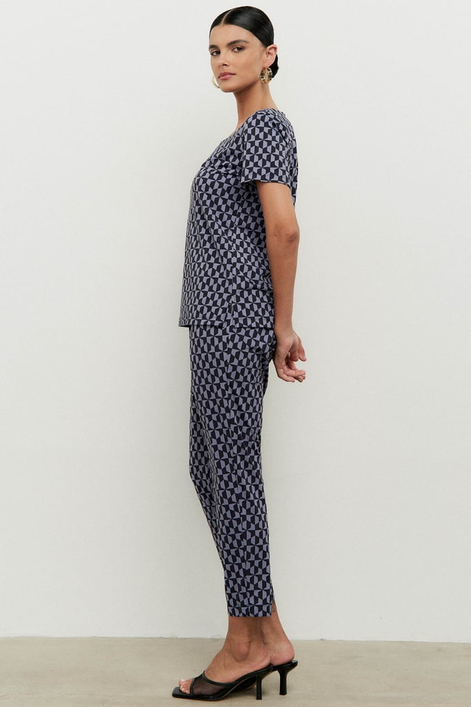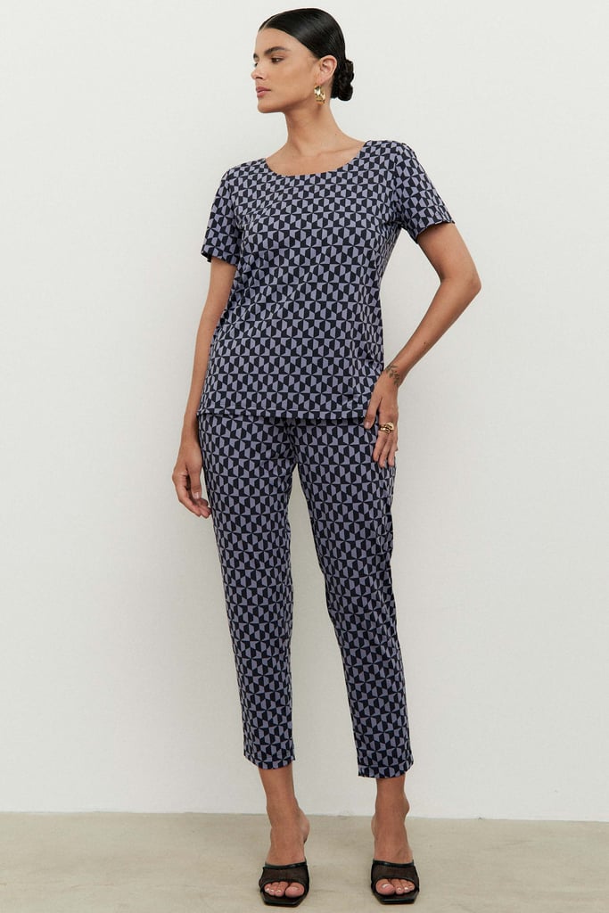 Confeccionado em tecido de malha Fluity, o conjunto é superconfortável, tem o toque geladinho e não amassa. A blusa possui decote redondo e manga curta. A calça traz nossa modelagem clássica reta com pregas frontais, bolsos laterais e cós com elástico embutido nas costas para maior conforto. A estampa é mais uma exclusividade Simple Life.