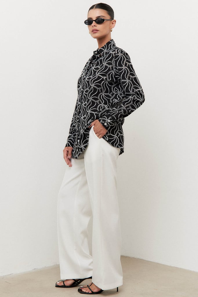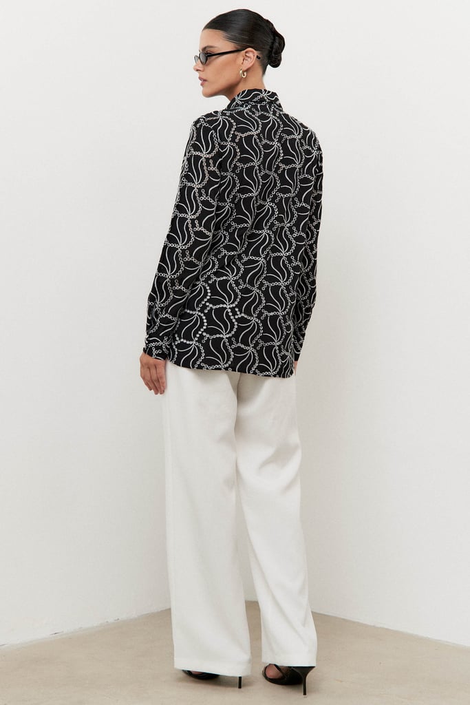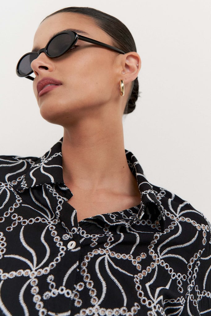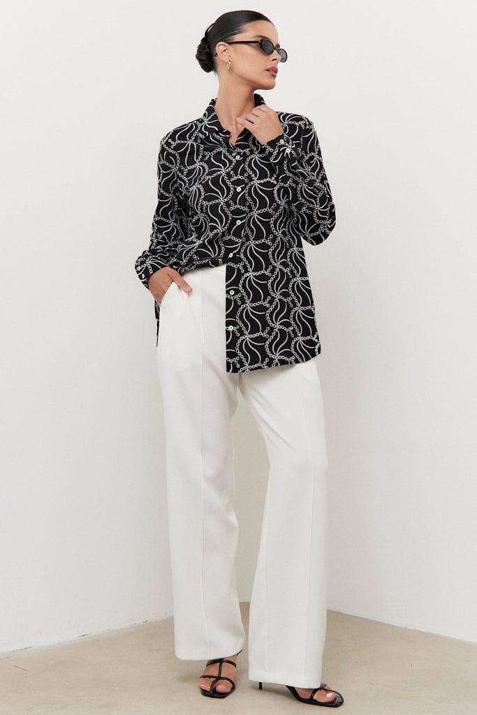 Camisa confeccionada em tecido de laise de viscose. Possui colarinho francês, fechamento frontal por botões e manga comprida com punho. Modelagem reta e solta ao corpo.