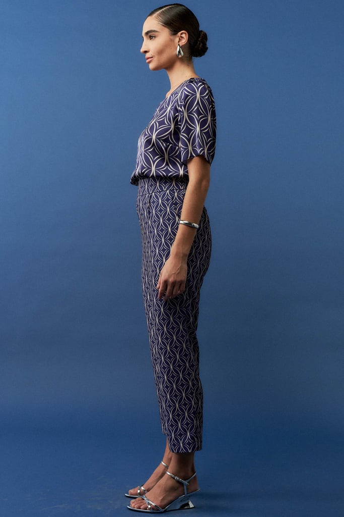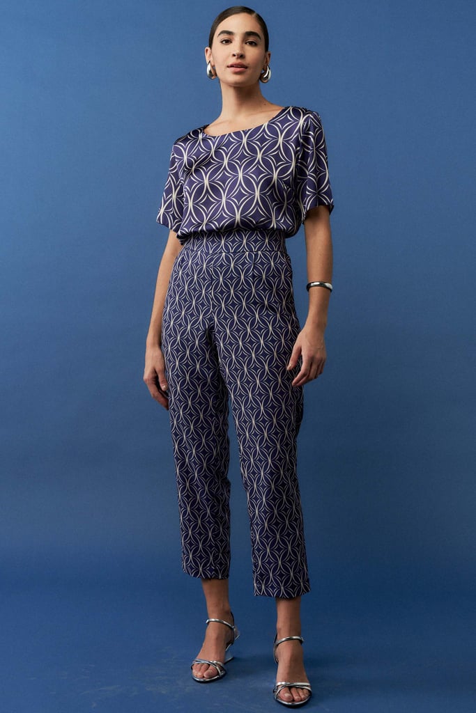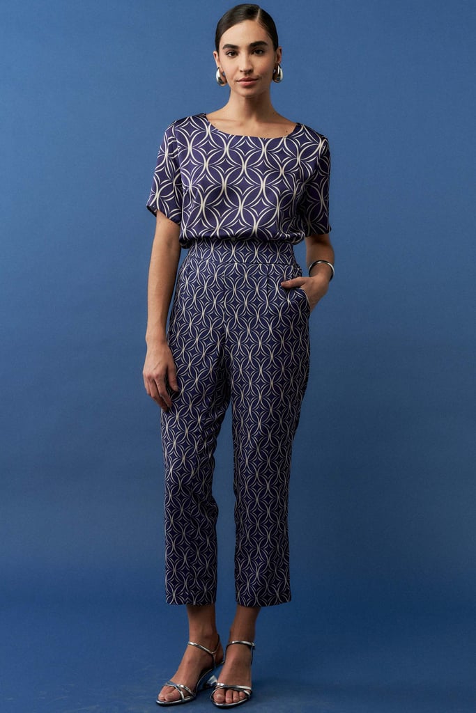 Blusa confeccionada em tecido acetinado com decote redondo e manga curta. Calça, confeccionada em crepe, traz nossa modelagem clássica reta com pregas frontais, bolsos laterais e cós com elástico nas costas para maior conforto. A estampa é mais uma exclusividade Simple Life.