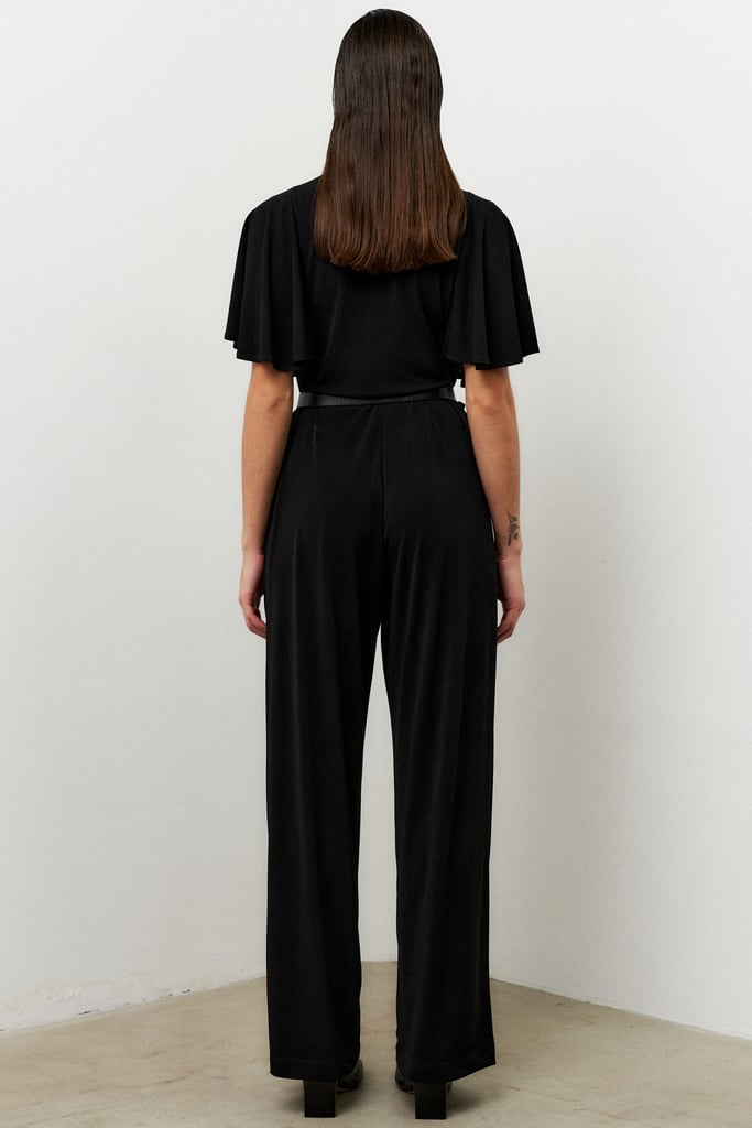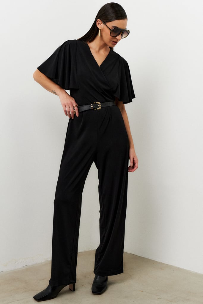 Macacão confeccionado em crepe de malha encorpado. Possui decote transpassado, manga godê e elástico interno na cintura para maior conforto. Acompanha faixa do mesmo tecido para amarração.