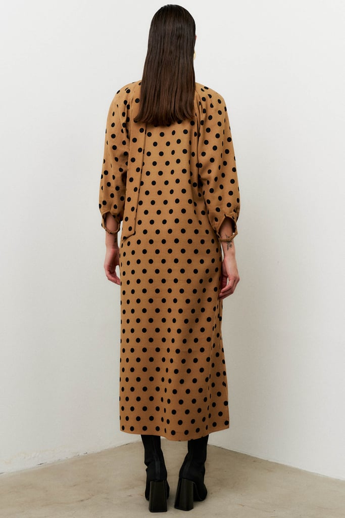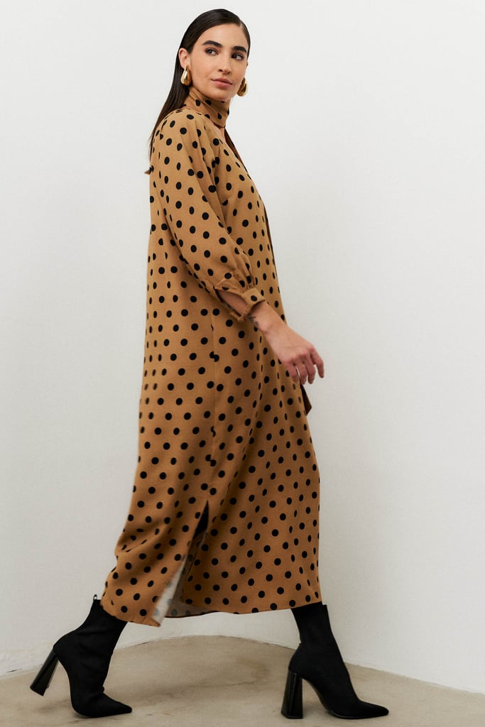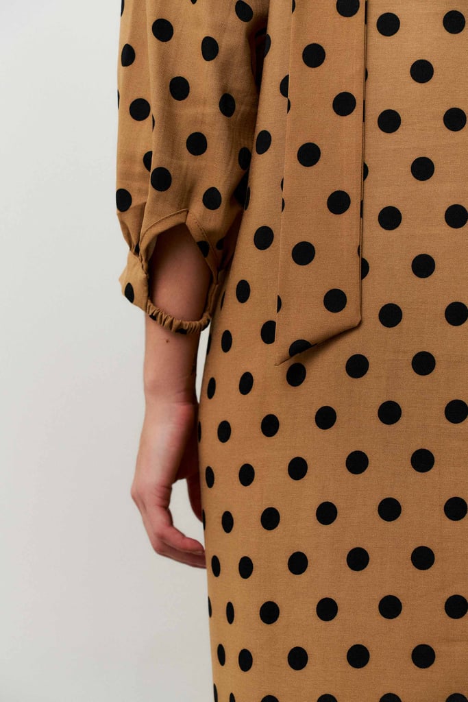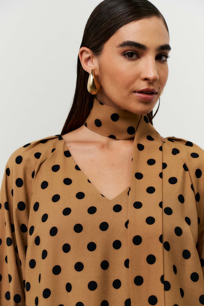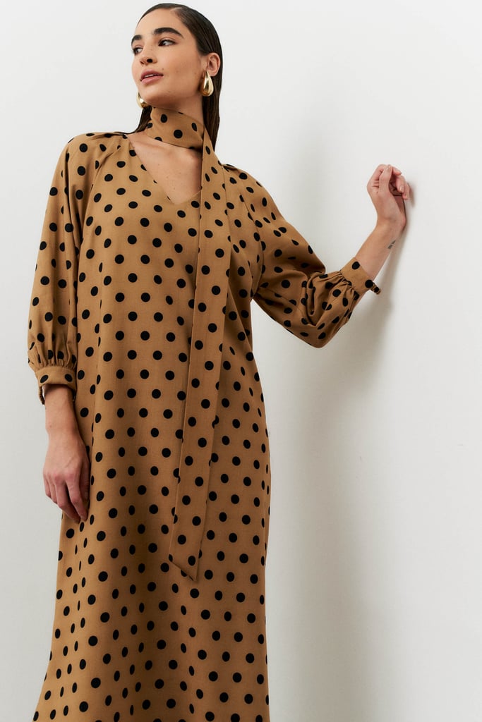 Vestido confeccionado em crepe de viscose com padronagem de poá. Possui decote V, pregas no ombro, manga 3/4 com punho e terminação de elástico.