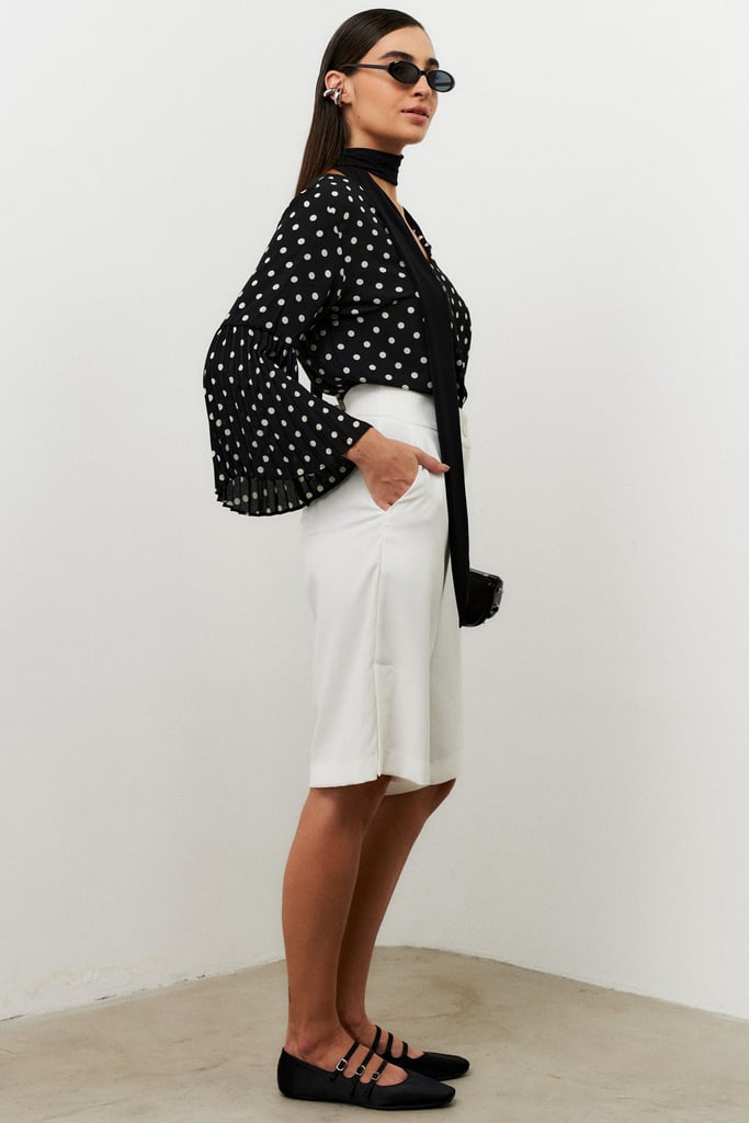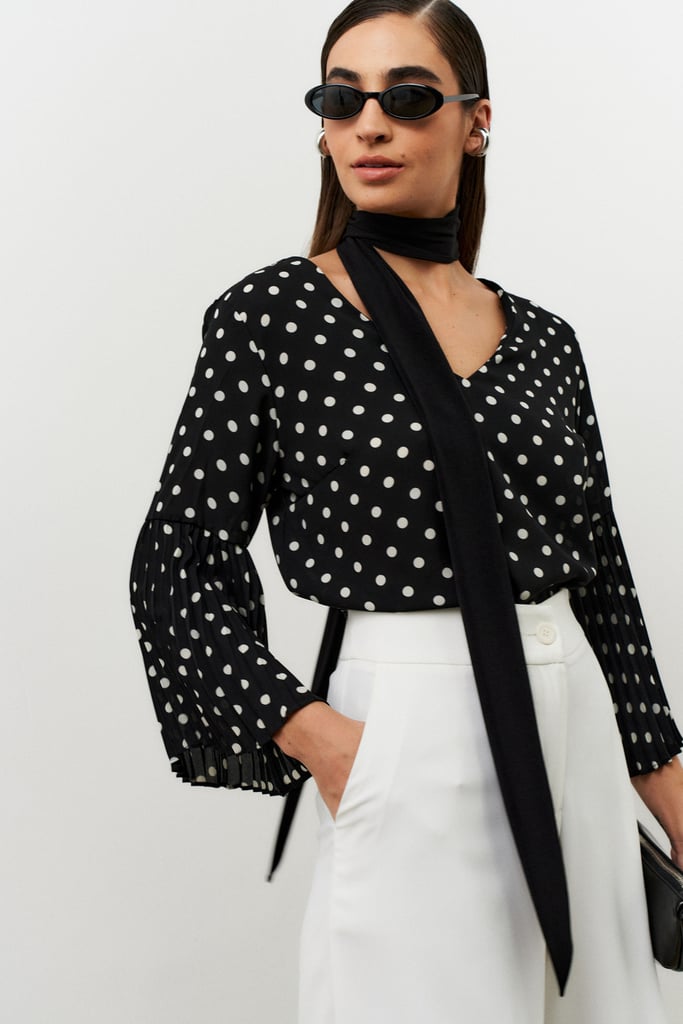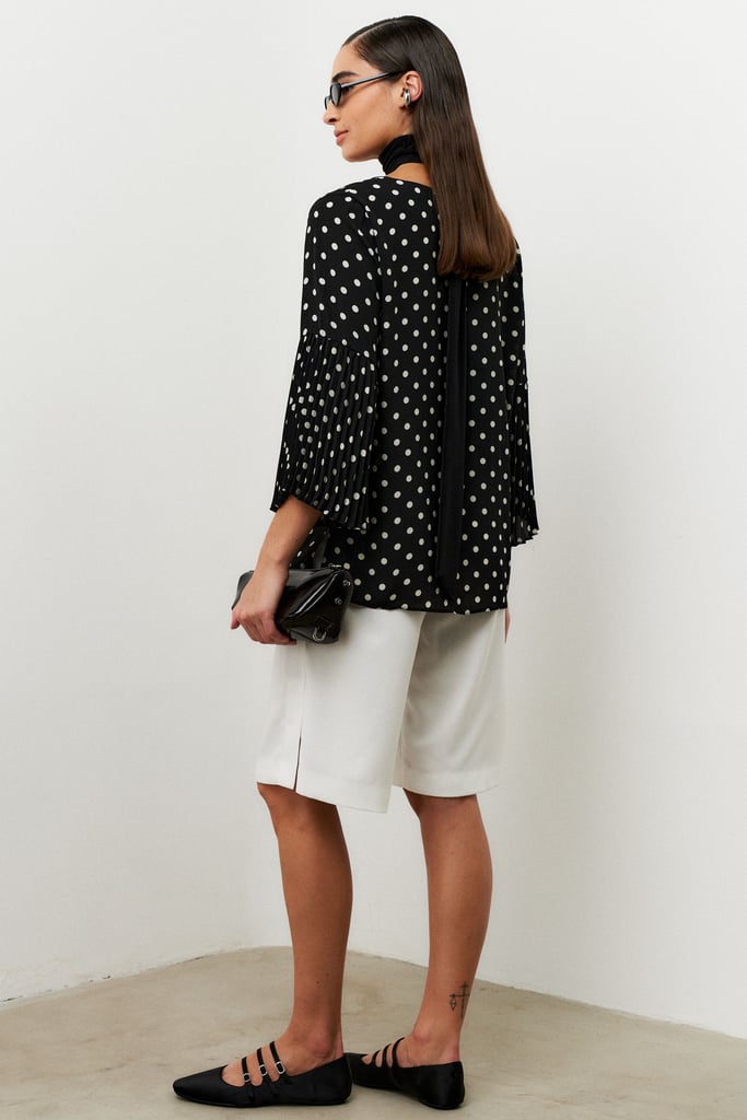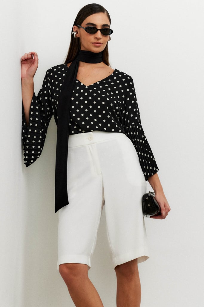 Blusa confeccionada em tecido de crepe com estampa de poá. Possui decote V e manga 3/4 com aplicação de plissado na barra.
