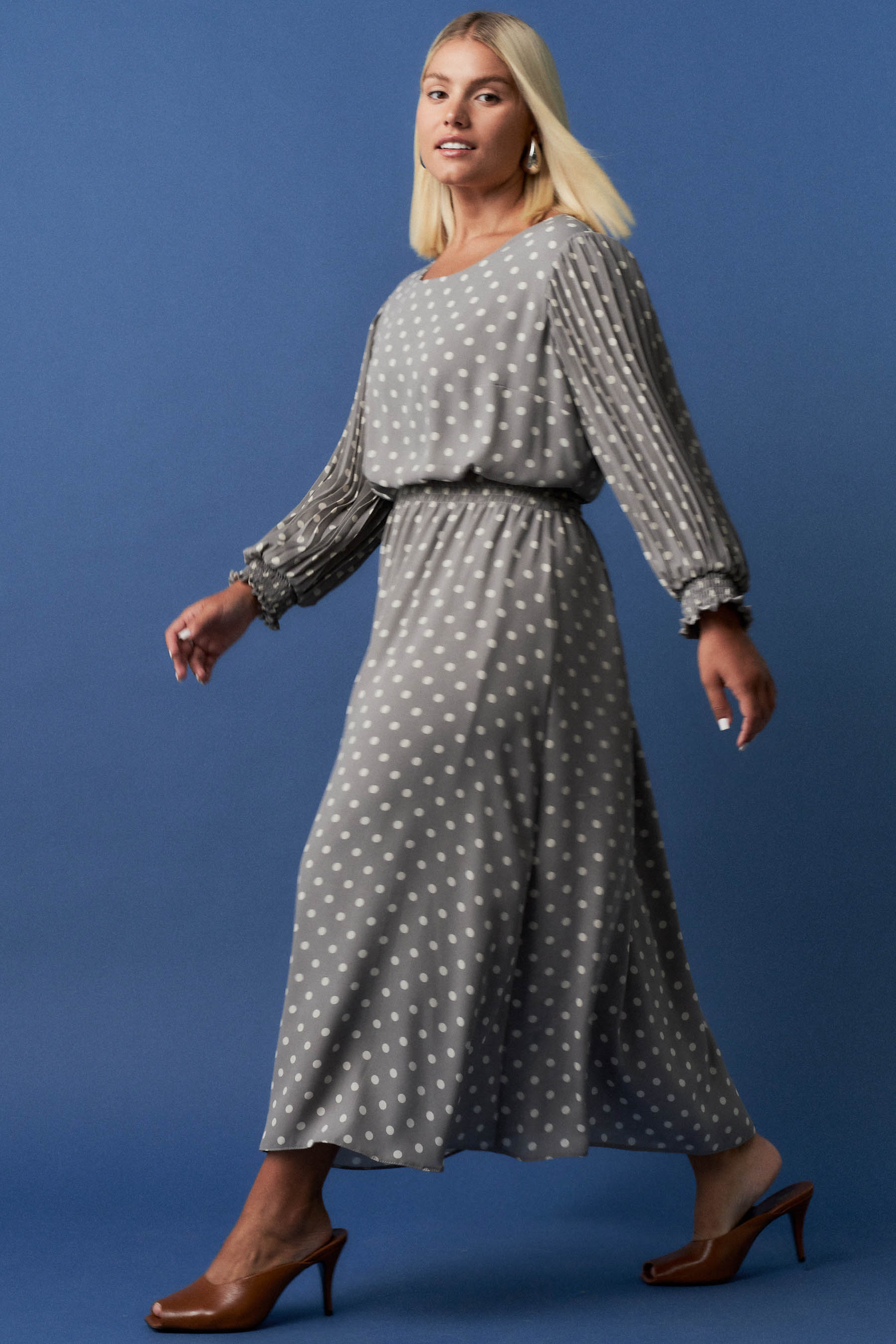 Vestido confeccionado em tecido de crepe com estampa de poá. Possui decote arredondado e manga 3/4 plissada com terminação de lastex. Detalhe de lastex na cintura. Comprimento midi. Peça forrada.
