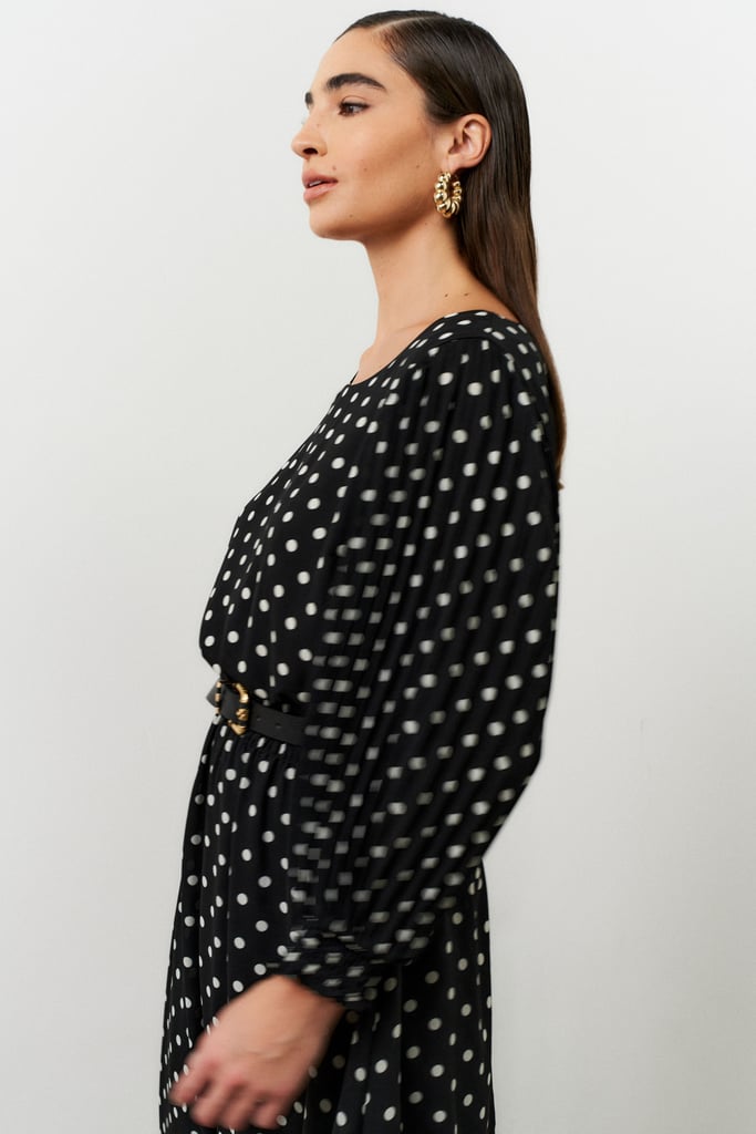 Vestido confeccionado em tecido de crepe com estampa de poá. Possui decote arredondado e manga 3/4 plissada com terminação de lastex. Detalhe de lastex na cintura. Comprimento midi. Peça forrada.