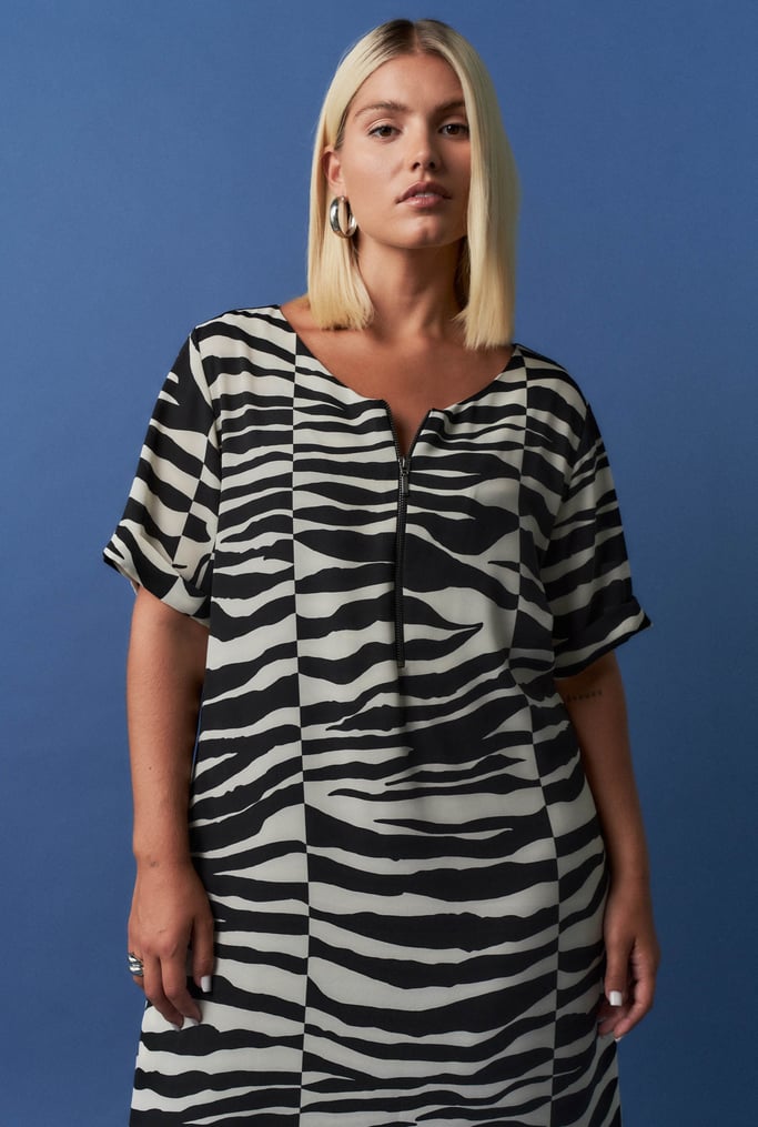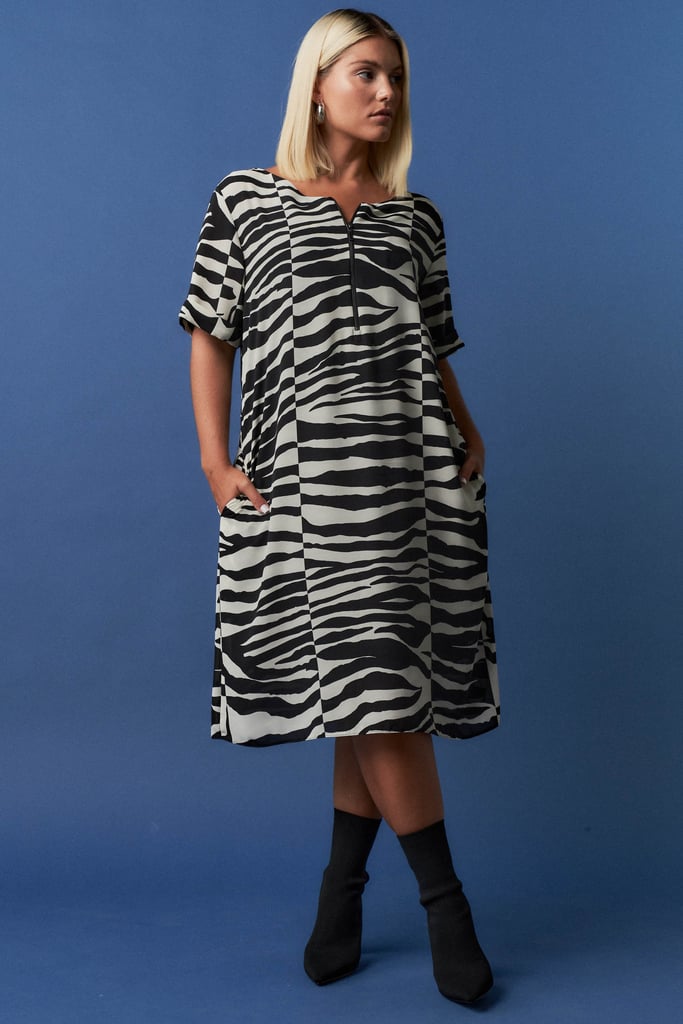 Vestido confeccionado em tecido de crepe com padronagem de animal print. Possui modelagem solta do corpo, decote redondo com detalhe de zíper de metal, bolsos laterais e manga curta com barra italiana. Acompanha anágua de forro.