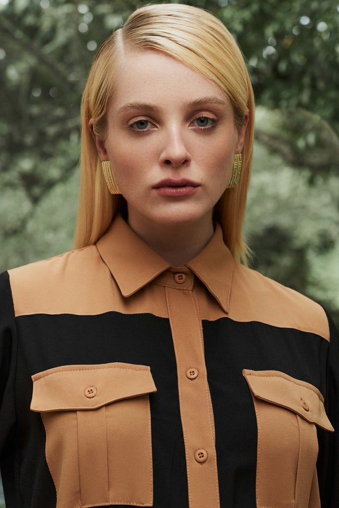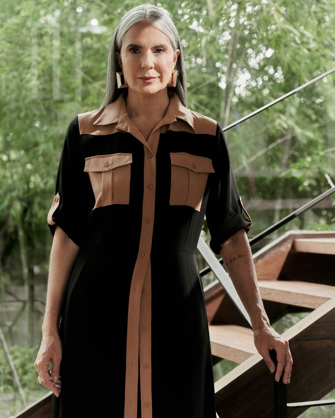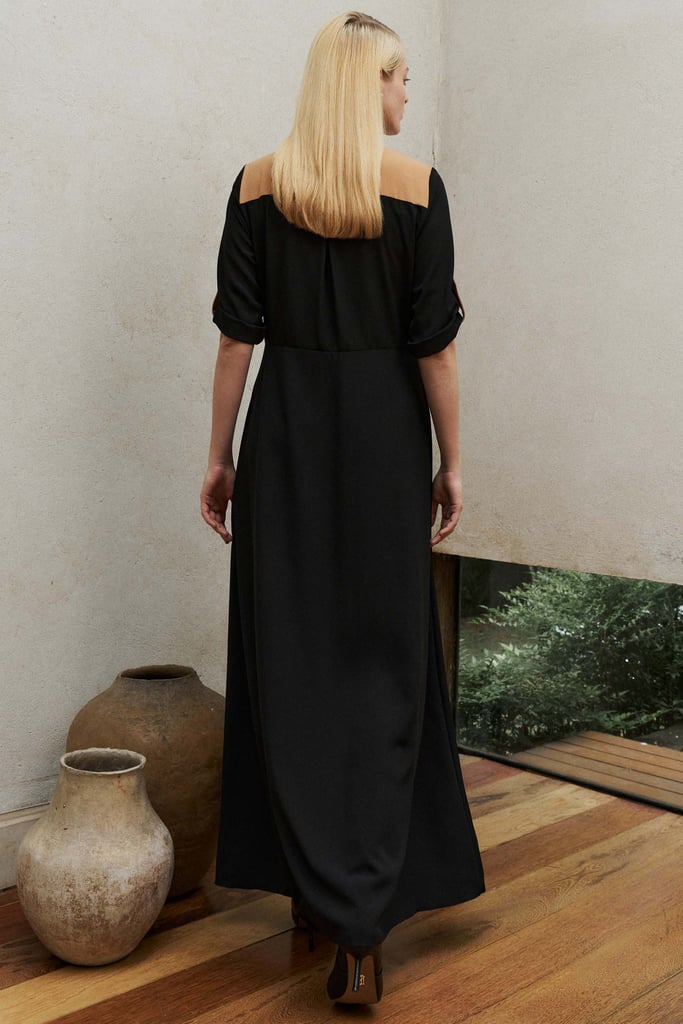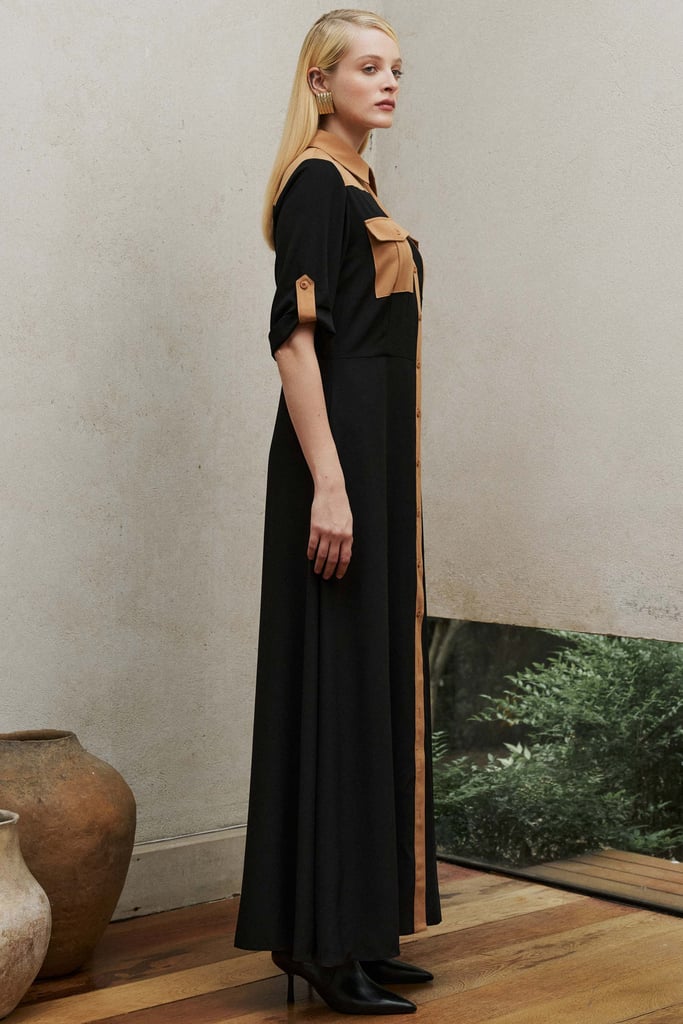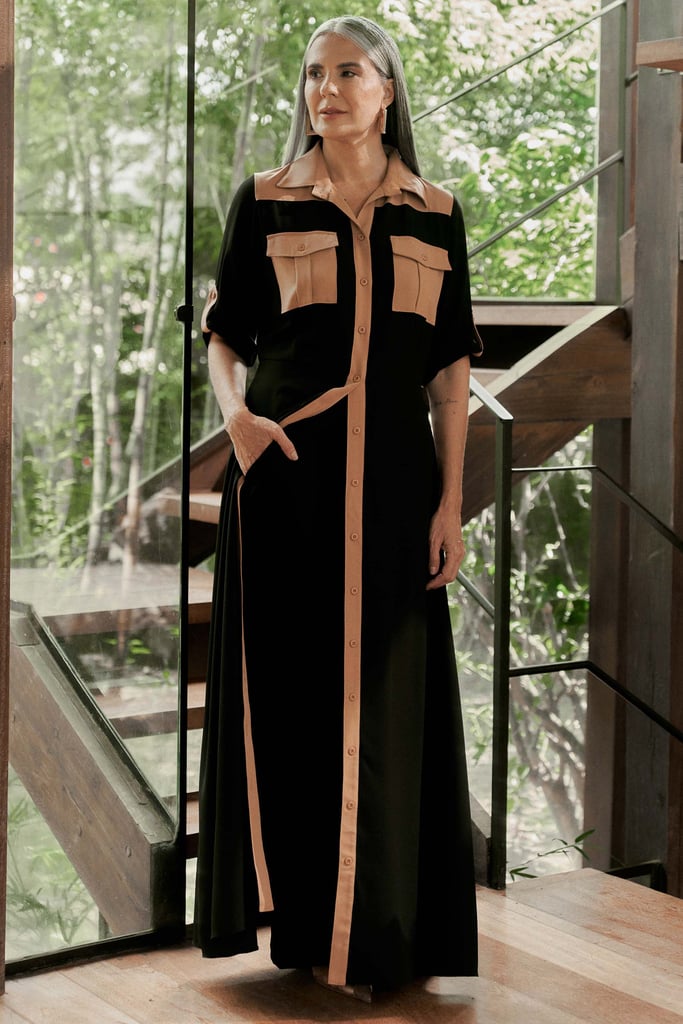 Chemise longa confeccionada em tecido de crepe. Possui gola de camisa, bolsos frontais e laterais, vista com fechamento por botões e manga 3/4 com martingale. Acompanha faixa do mesmo tecido para amarração.