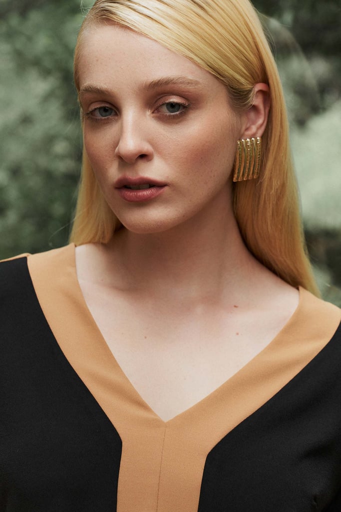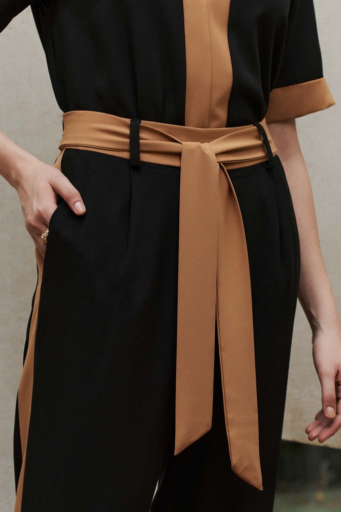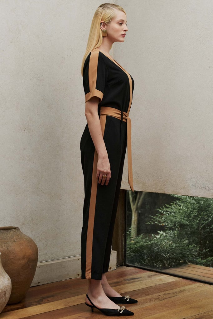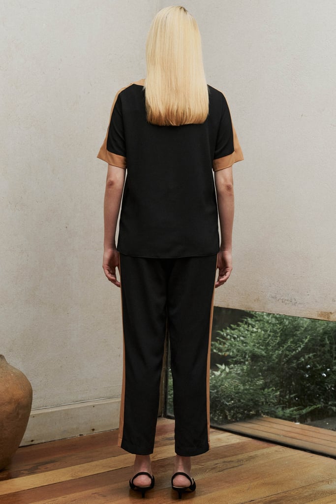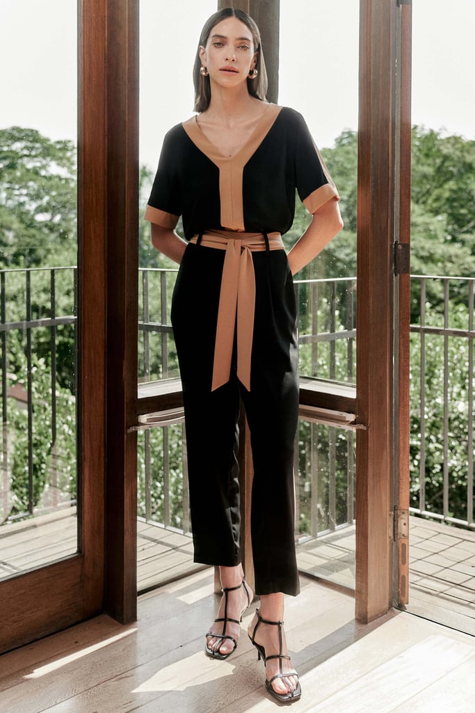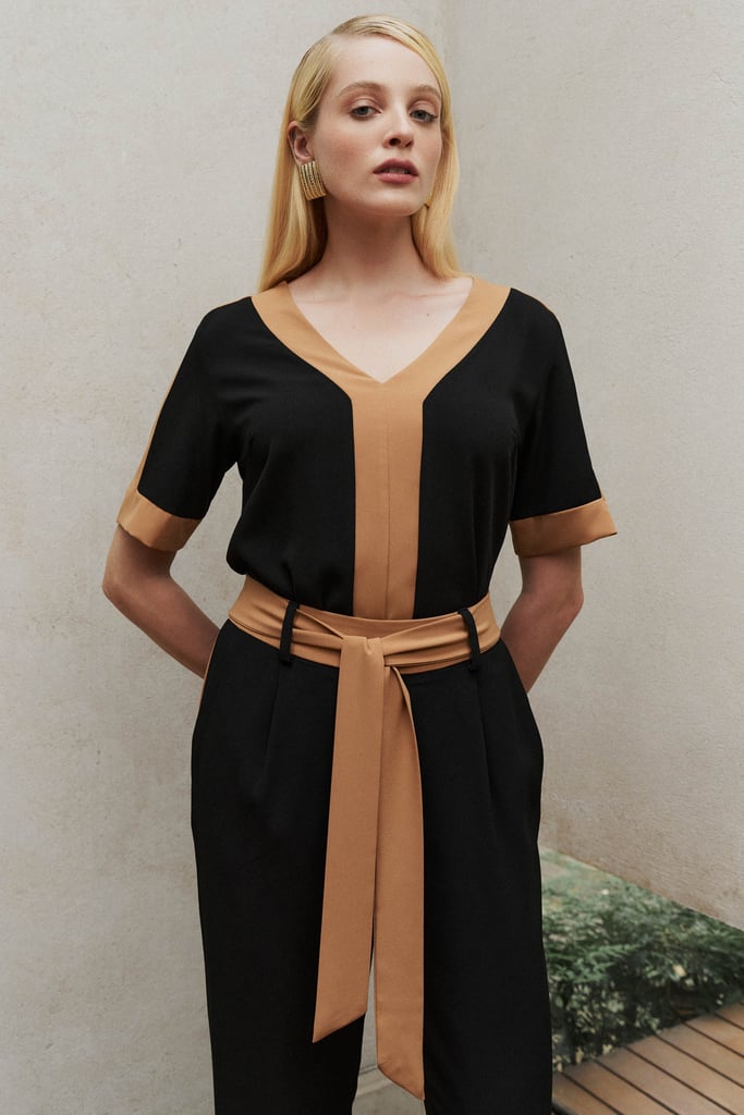 Conjunto confeccionado em tecido de crepe. A blusa possui decote V e manga curta. A calça traz nossa modelagem clássica reta, tiras fixadas nas laterais para amarração, bolsos tipo faca e cós com elástico nas costas para melhor vestibilidade. O diferencial da peça fica por conta dos recortes com cores contrastantes.