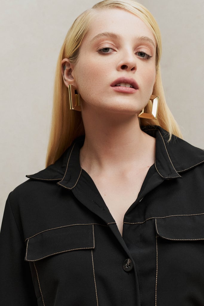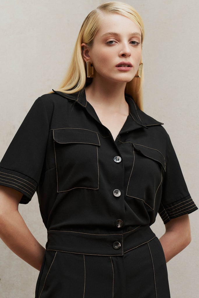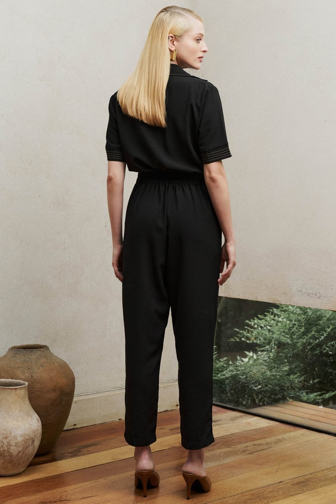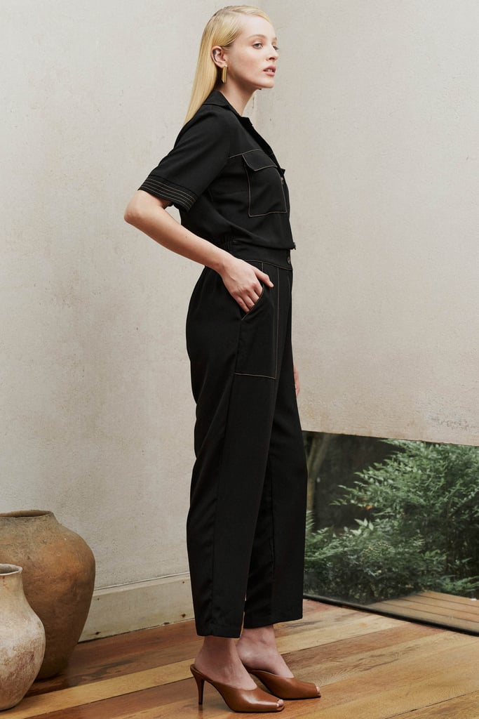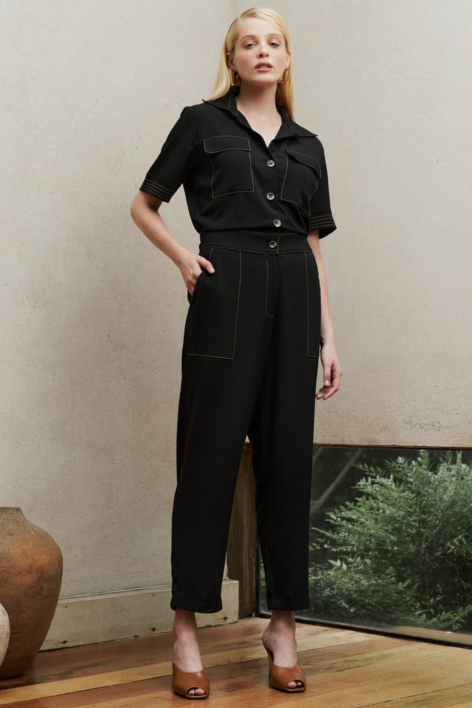 Macacão confeccionado em tecido de crepe. Possui gola de camisa, vista frontalcom botões, manga curta, bolsos frontais e laterais e elástico nas costas para maior conforto. O chame fica por conta do trabalho de pesponto contrastante por toda peça.