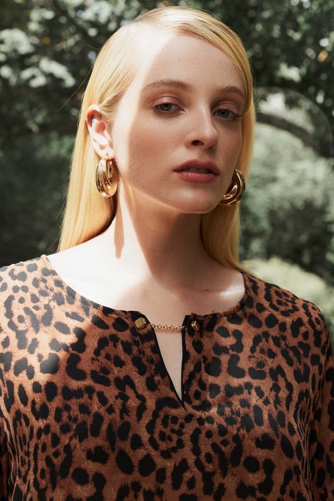 Blusa confeccionada em tecido de crepe com padronagem de animal print. Possui decote redondo com abertura em V e detalhe de aviamento. Sobreposição na barra que adiciona charme extra à peça. Manga 3/4.