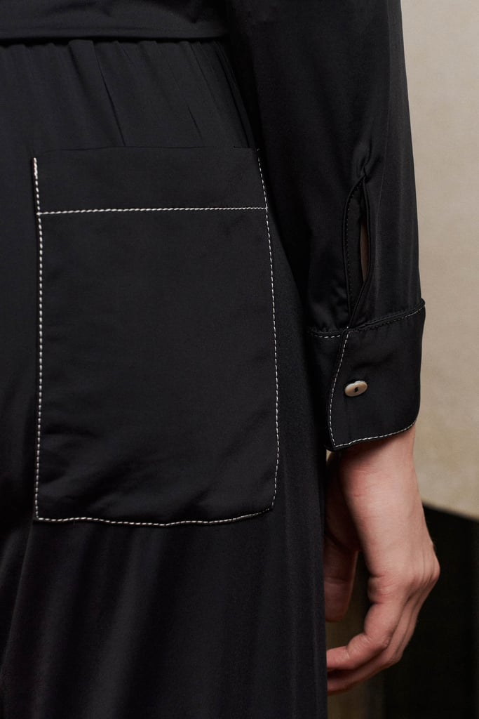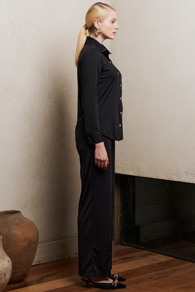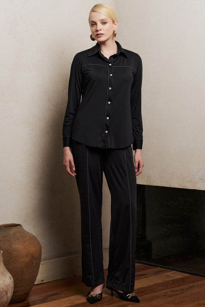 Conjunto pespontado confeccionado em tecido de Fluity liso. Camisa possui gola com vista frontal fechada por botões, manga comprida com punho e pregas fêmea nas costas. A calça traz nossa modelagem clássica reta com pregas frontais, bolsos laterais e traseiros e cós com elástico nas costas para maior conforto.