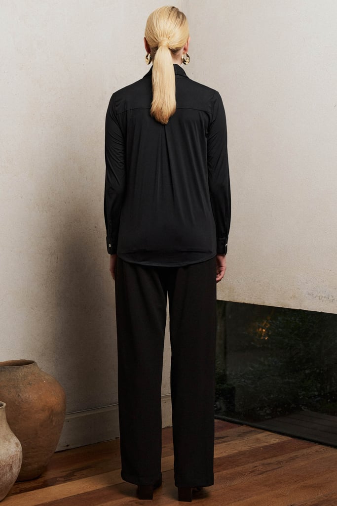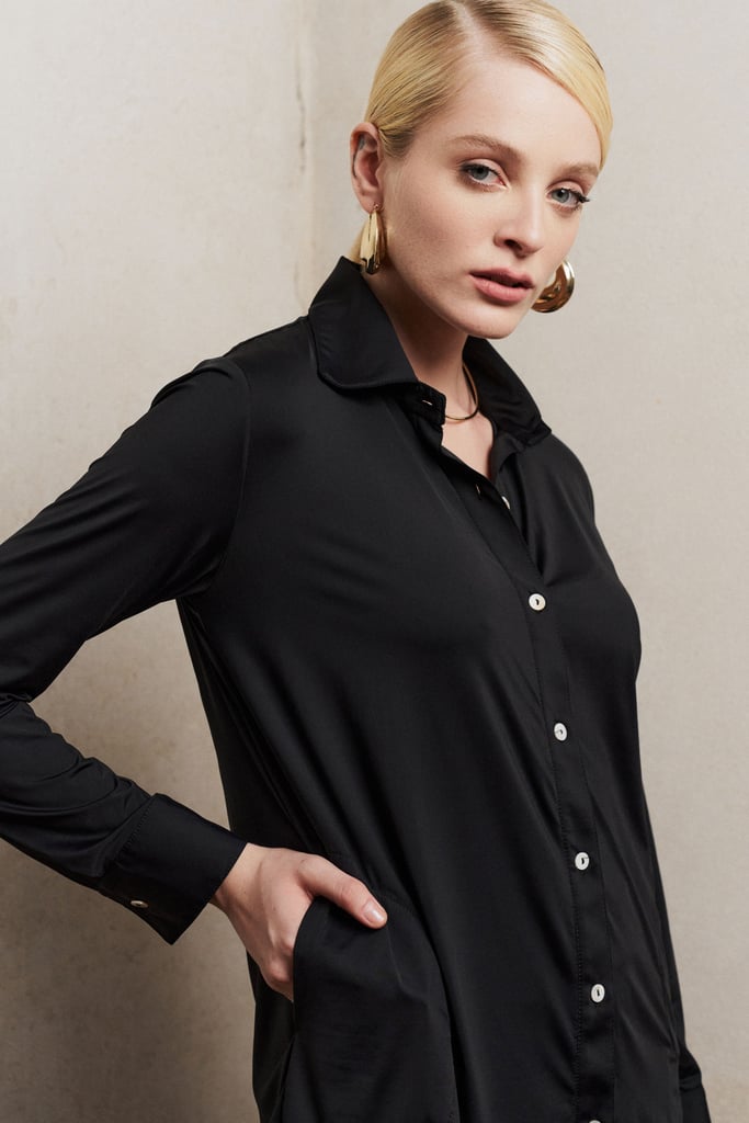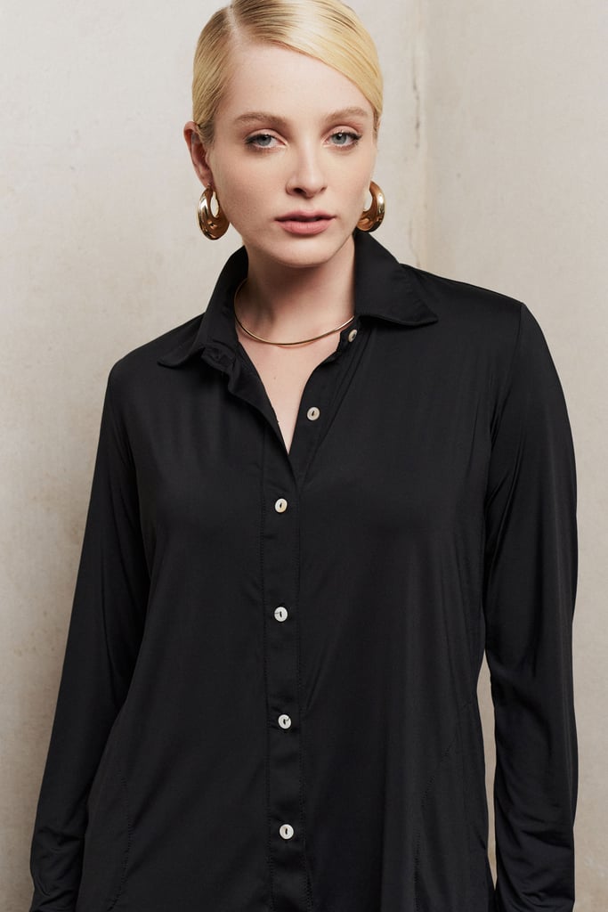 Confeccionada em tecido de malha Fluity liso, a camisa é superconfortável, tem o toque geladinho e não amassa. Possui colarinho francês com fechamento frontal por botões, manga comprida com punho e detalhe de bolsos laterais.