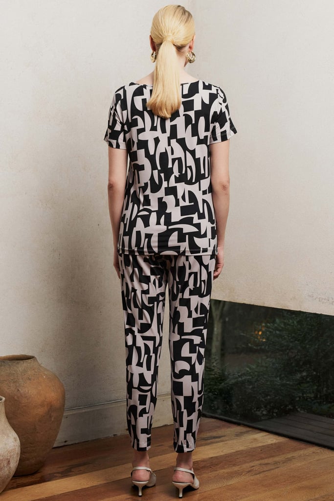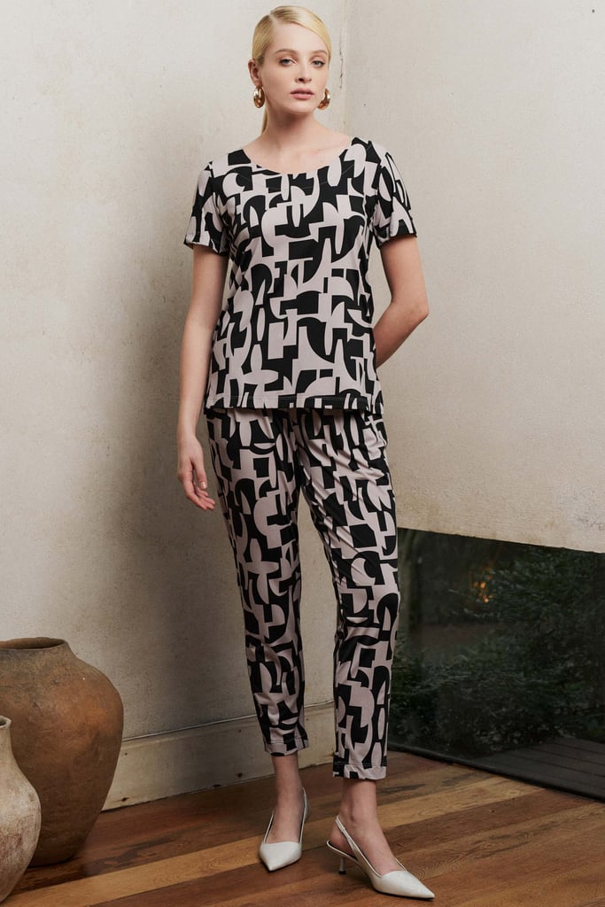 Confeccionado em tecido de malha Fluity, o conjunto é superconfortável, tem o toque geladinho e não amassa. A blusa possui decote redondo e manga curta. A calça traz nossa modelagem clássica reta com pregas frontais, bolsos laterais e cós com elástico embutido nas costas para maior conforto. A estampa é mais uma exclusividade Simple Life.