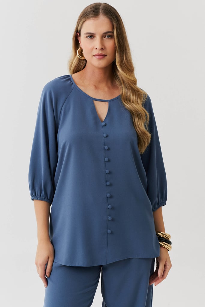Conjunto confeccionado em tecido de crepe. Blusa possui decote redondo, detalhe de botões frontais decorativos e manga 3/4 com terminação de elástico. Calça traz nossa modelagem clássica reta, bolsos laterais e cós com elástico embutido nas costas para maior conforto.