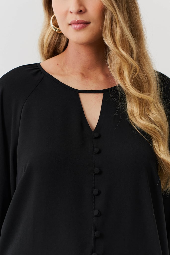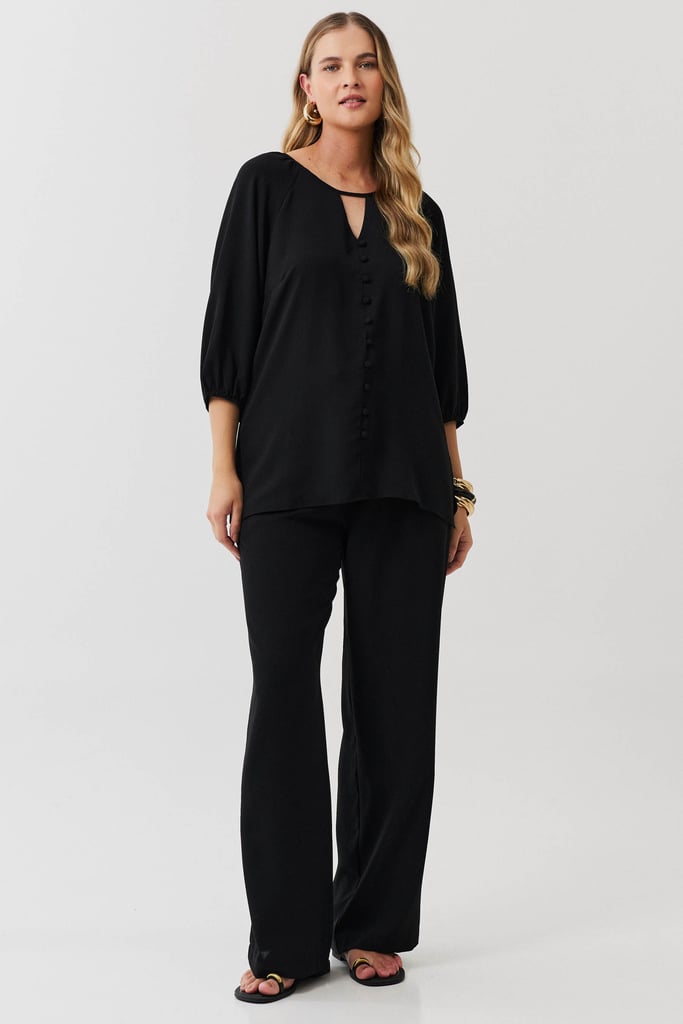 Conjunto confeccionado em tecido de crepe. Blusa possui decote redondo, detalhe de botões frontais decorativos e manga 3/4 com terminação de elástico. Calça traz nossa modelagem clássica reta, bolsos laterais e cós com elástico embutido nas costas para maior conforto.