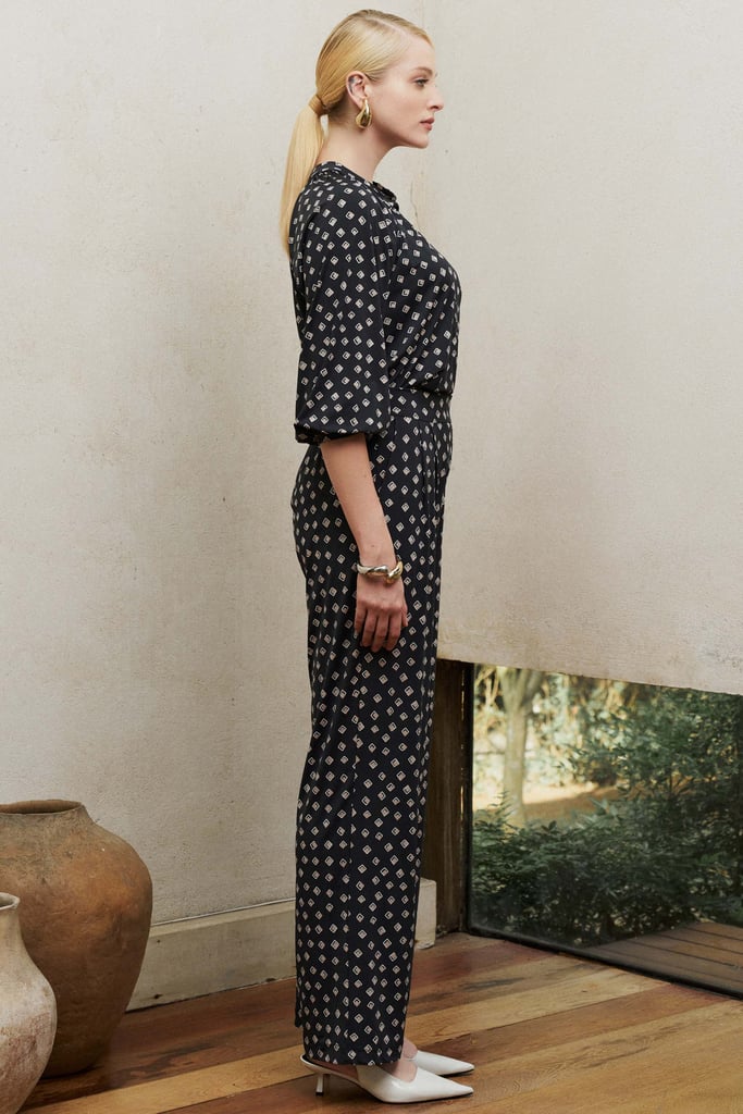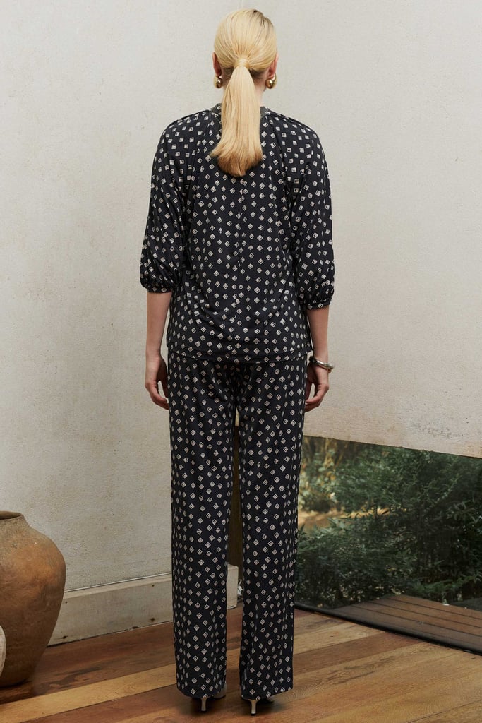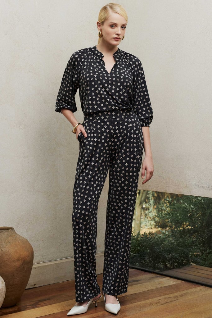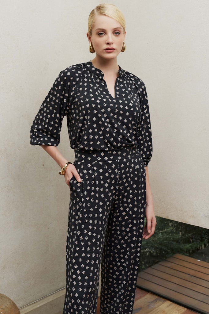 Confeccionado em tecido de malha Fluity, o conjunto é superconfortável, tem o toque geladinho e não amassa. A blusa possui gola padre e manga 3/4. A calça traz nossa modelagem clássica reta solta ao corpo com pregas frontais, bolsos laterais e cós com elástico embutido nas costas para maior conforto. A estampa é mais uma exclusividade Simple Life.