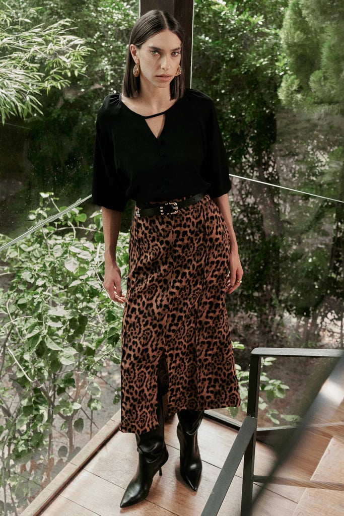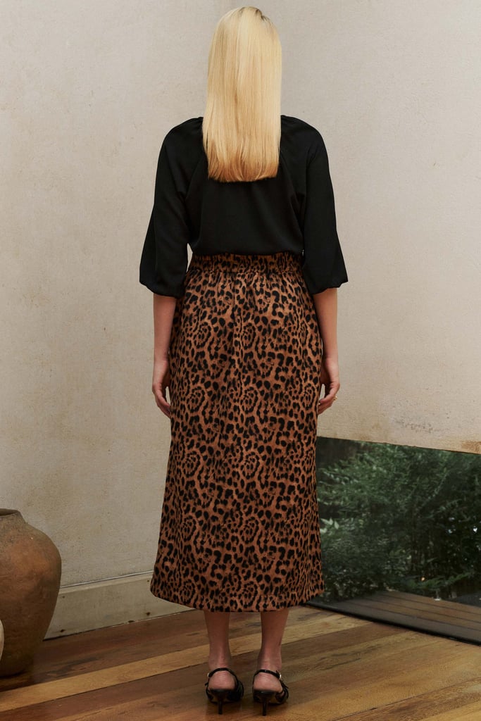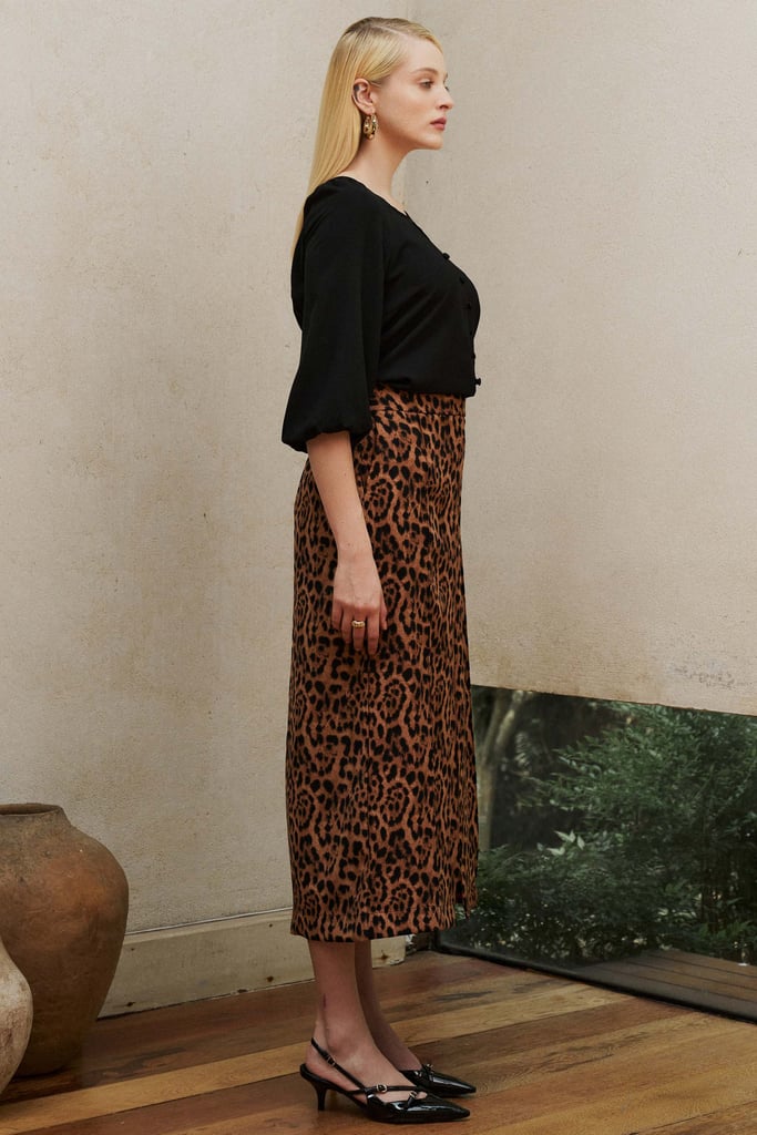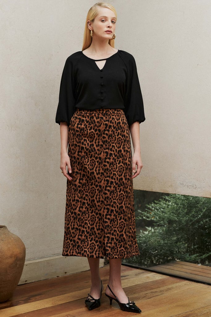 Saia confeccionada em tecido de crepe com padronagem de animal print. Possui modelagem reta com bolsos laterais, fenda frontal e elástico nas costas para maior conforto.